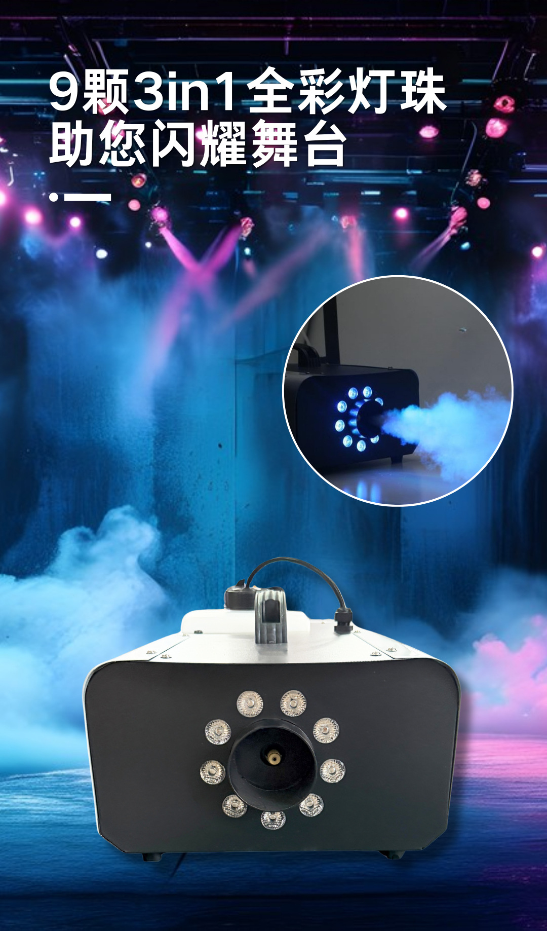 光源资料:9颗3W 3in1全彩灯珠,围绕喷烟嘴按圆圈排列