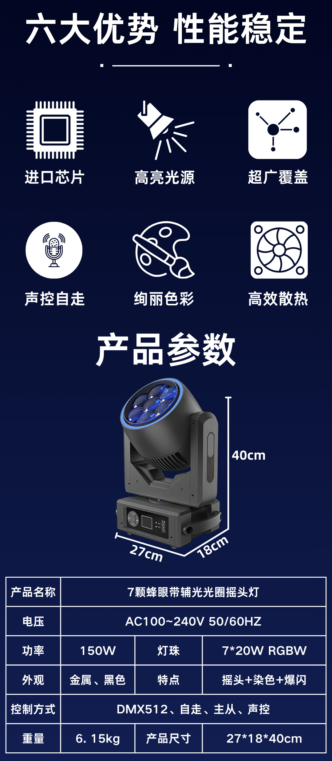 灯珠: 7颗20W四合一LED灯珠