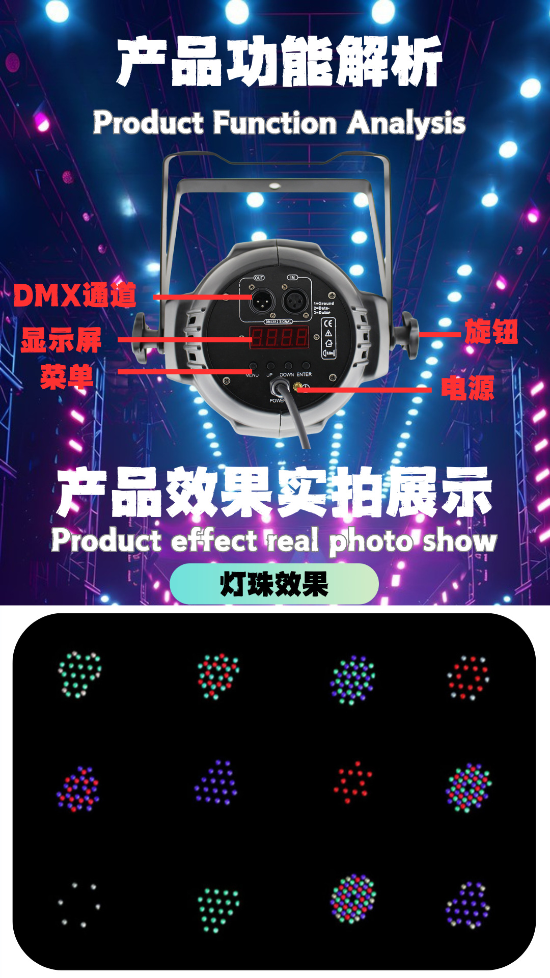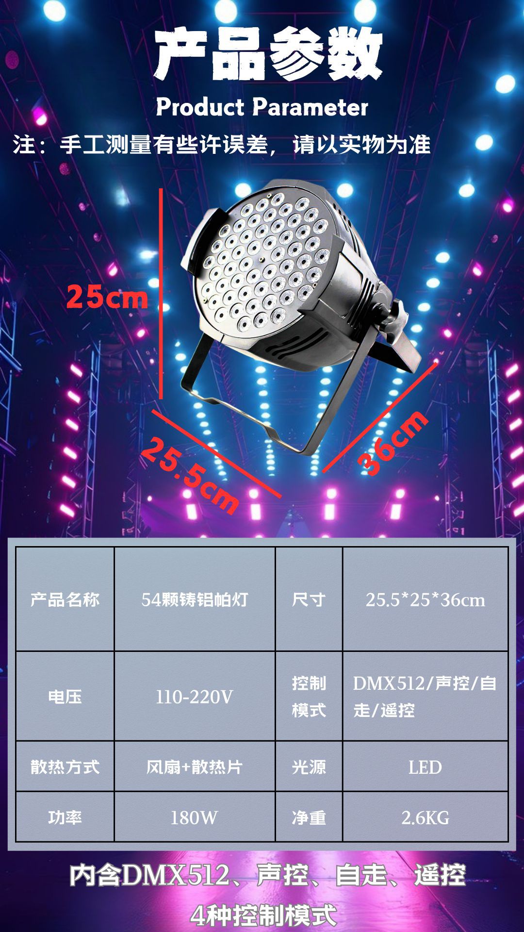 操作:自动,DMX512,声音,遥控 通道: