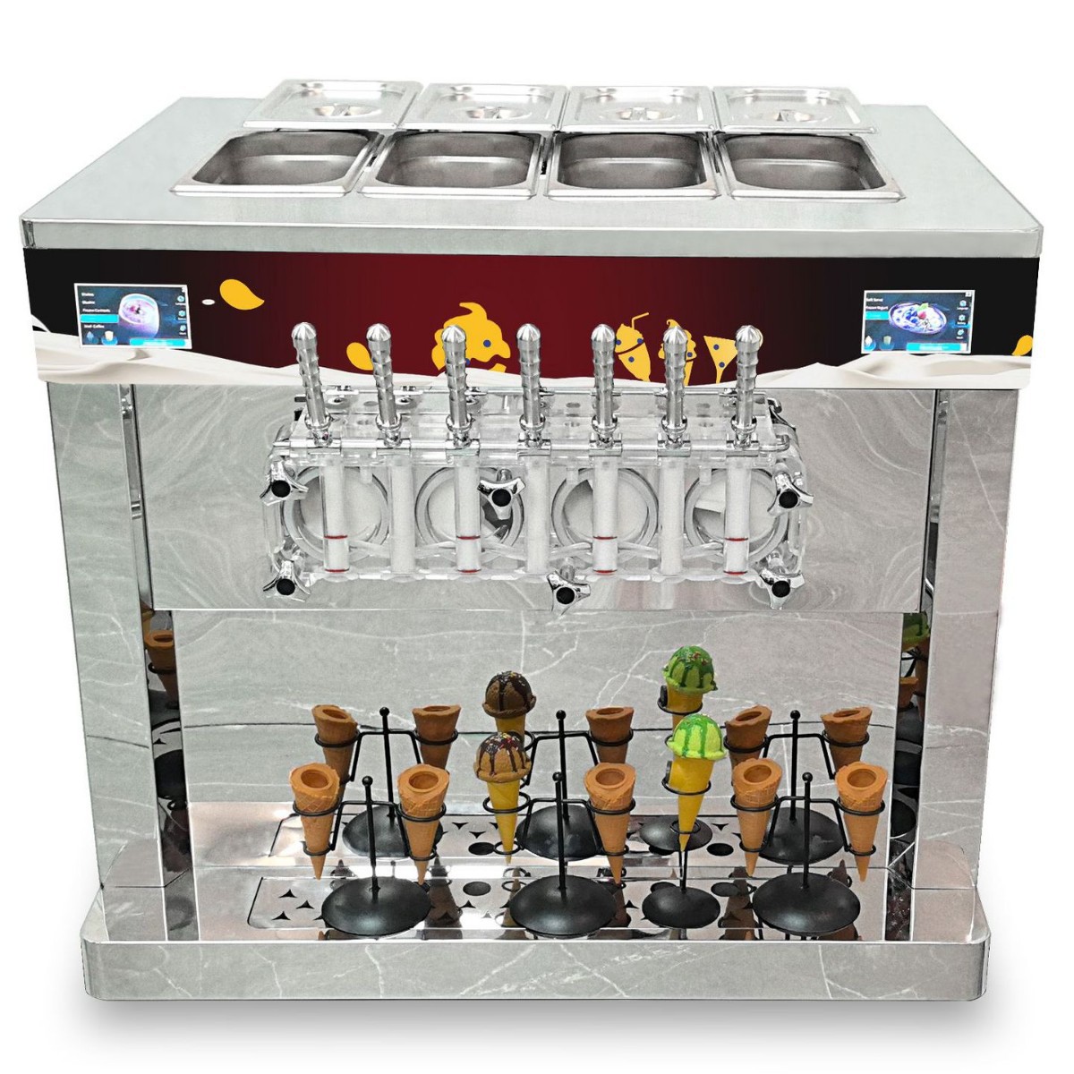 铜管散热技术加速热量传导,降温更迅速;结合预冷系统、夜间保鲜系统及冰淇淋膨化系统,精准控温,确保冰淇淋口感绵密且储存持久。