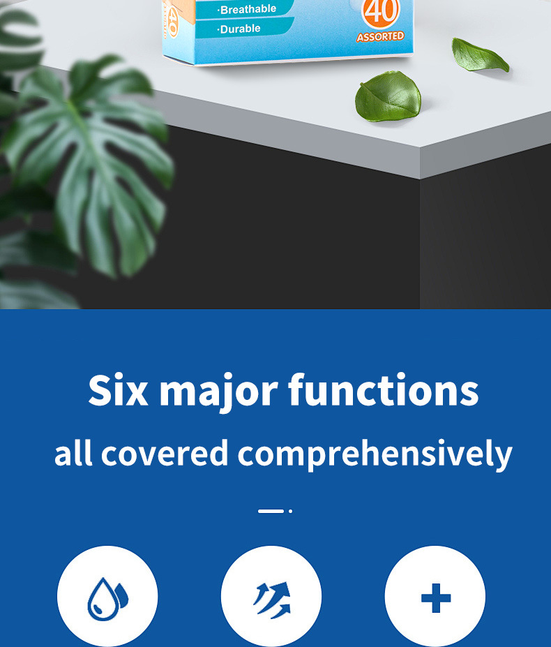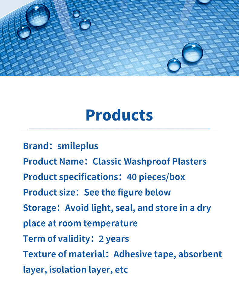 品牌: smileplus 种类/用途: 居家日用 产品类别: 创口贴 是否进口: 否 货号: hy6303 箱装数量: 288 产地: 浙江 加印LOGO: 可以 加工定制: 是 适用送礼场合: 其他 是否专利货源: 否 主要下游平台: ebay,亚马逊,wish,速卖通,独立 主要销售地区: 非洲,欧洲,南美,东南亚,北美,东北亚, 有可授权的自有品牌: 是 是否跨境出口专供货源: 是 规格: 40贴/盒