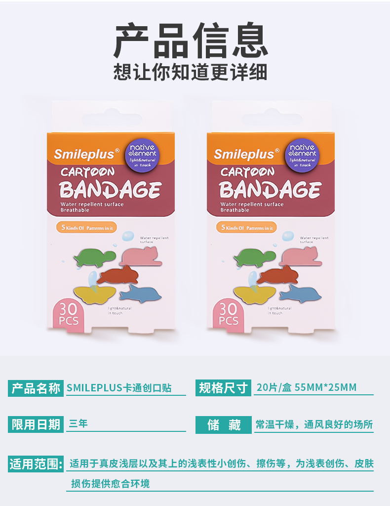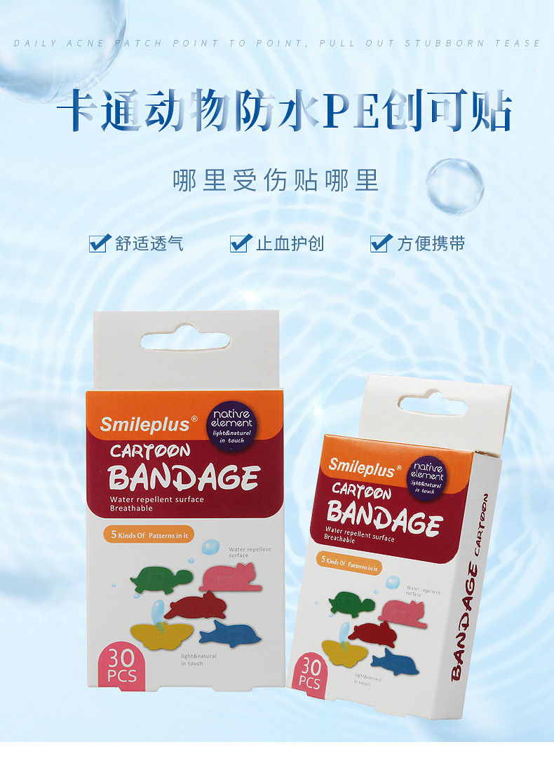 材质: PE 功能: 护创 类别: 创口贴 品牌: smileplus 厚度: 0.05 加印LOGO: 可以 尺寸: 55*25mm 是否进口: 否 保质期: 3年 适用对象: 儿童 图案: 纯色 货号: HY2013C-2 加工定制: 是 尺码: 55*25MM 产地(国内): 浙江省 毛重: 45G 箱装数量: 288盒/箱 只数: 30片/盒 价格段: 2.2 规格: 卡通创可贴