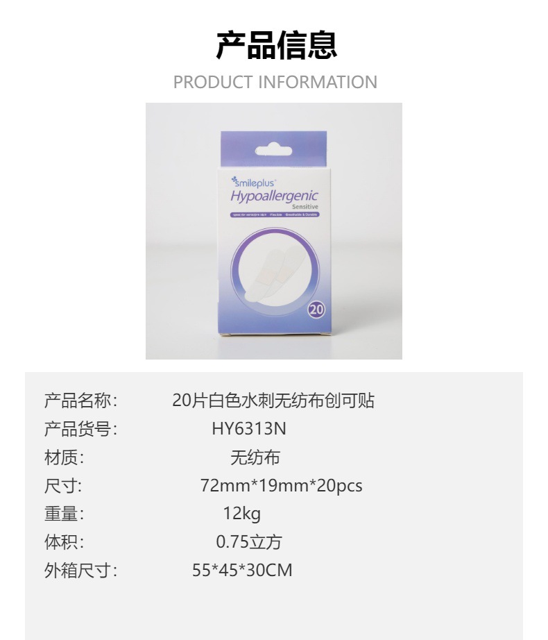 材质: 无纺布 功能: 防尘 类别: 创口贴 品牌: smileplus 厚度: 0.1 加印LOGO: 可以 尺寸: 72mm*19mm*20pcs 是否进口: 否 保质期: 3年 适用对象: 通用 图案: 纯色 货号: HY6313N 加工定制: 是 尺码: 72mm*19mm*20pcs 产地(国内): 浙江省 毛重: 100g 箱装数量: 288 只数: 20 价格段: 1-2 颜色: 肤色 重量: 0.035 kg/盒
