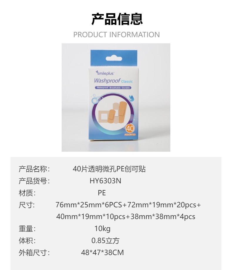 材质: PE 功能: 防磨 类别: 创口贴 品牌: smileplus 厚度: 0.1 加印LOGO: 可以 尺寸: 76mm*25mm*6PCS+72mm* 是否进口: 否 保质期: 3年 适用对象: 通用 图案: 纯色 货号: HY6303N 加工定制: 是 尺码: 76mm*25mm*6PCS+72mm* 产地(国内): 浙江省 毛重: 10 箱装数量: 288 只数: 40片/盒 价格段: 2-3 颜色: 透明 重量: 0.045 kg/盒