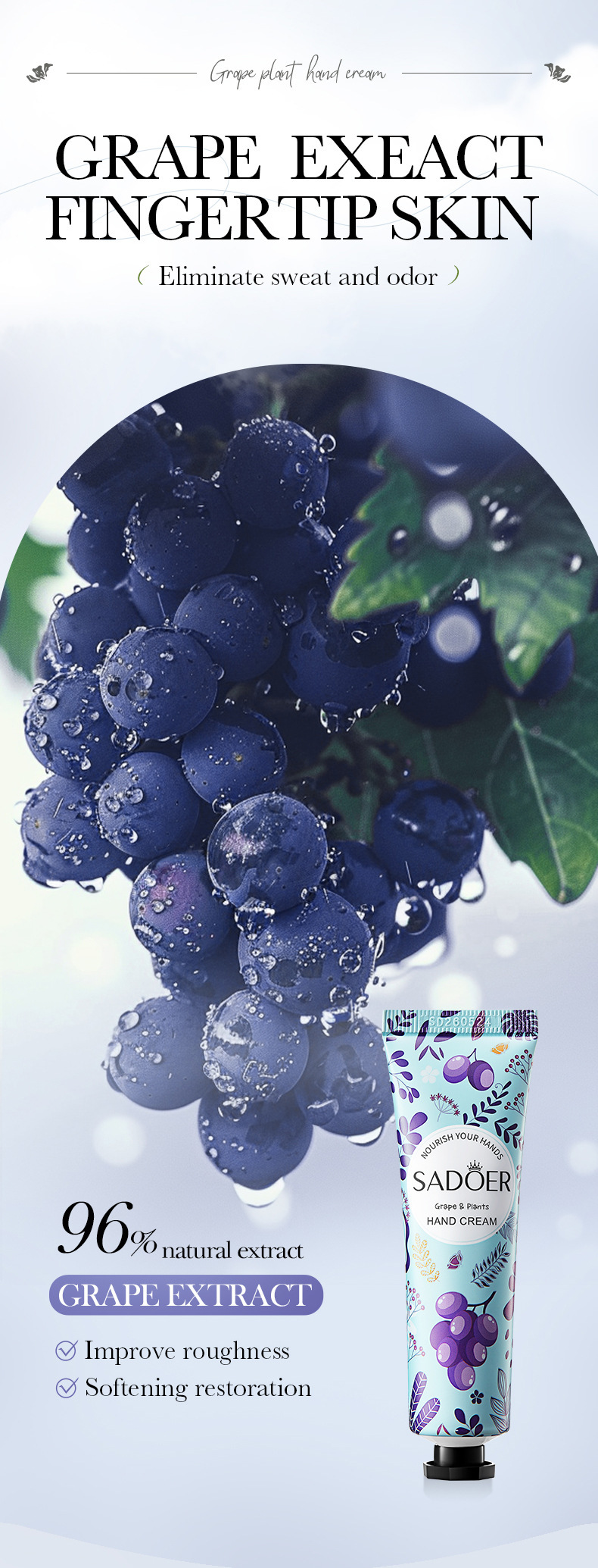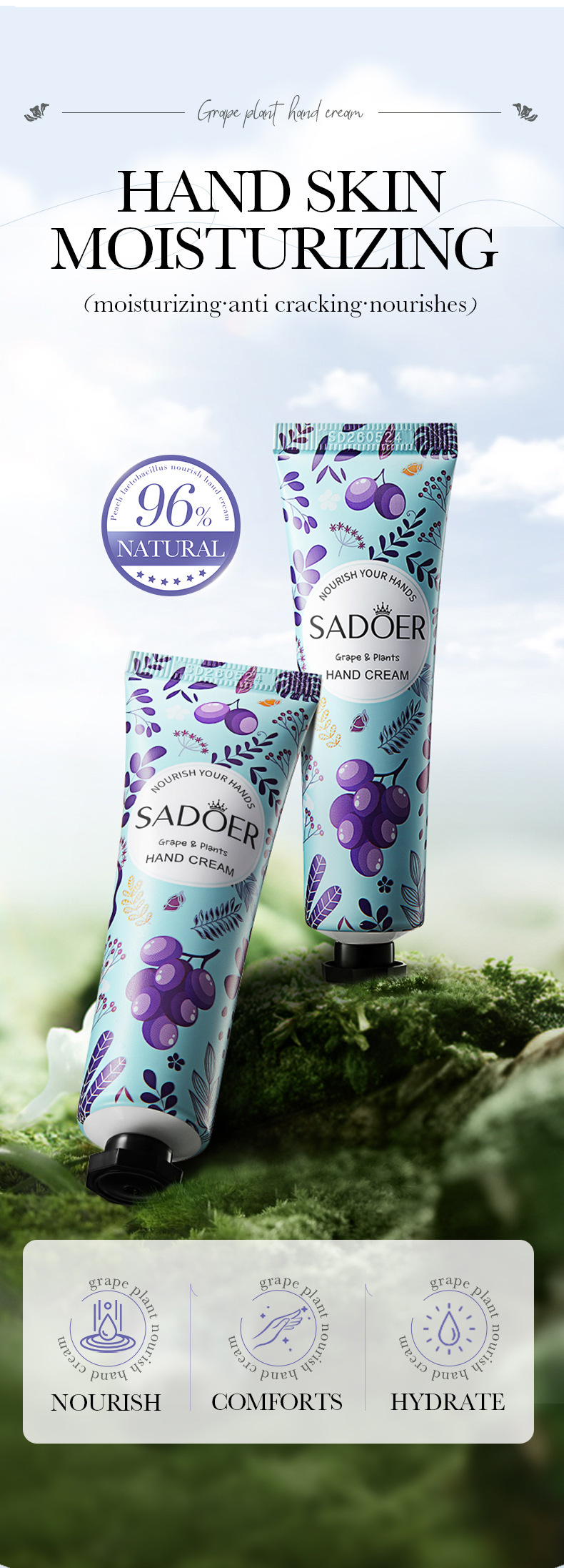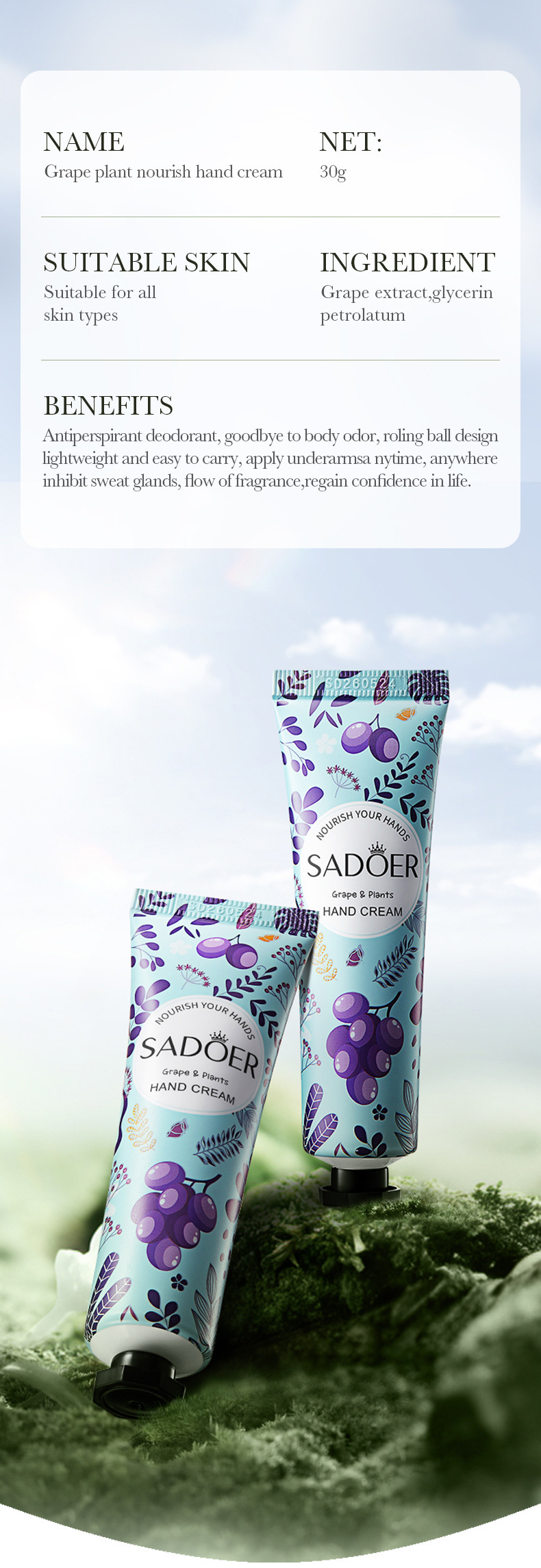全英文SADOER葡萄手霜 秋冬季防干裂滋润保湿护手霜商贸城六区专供出口 English | 投诉
