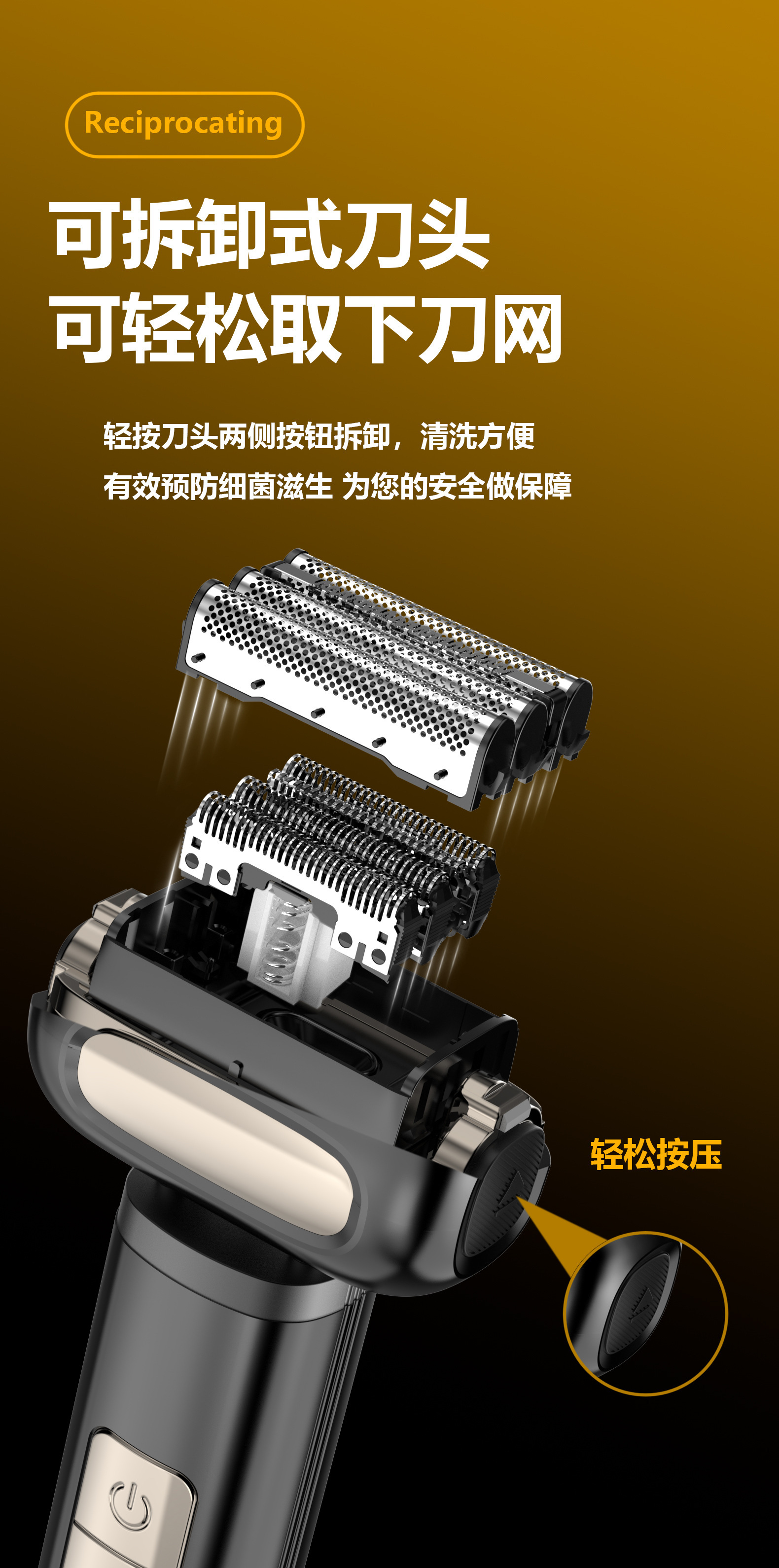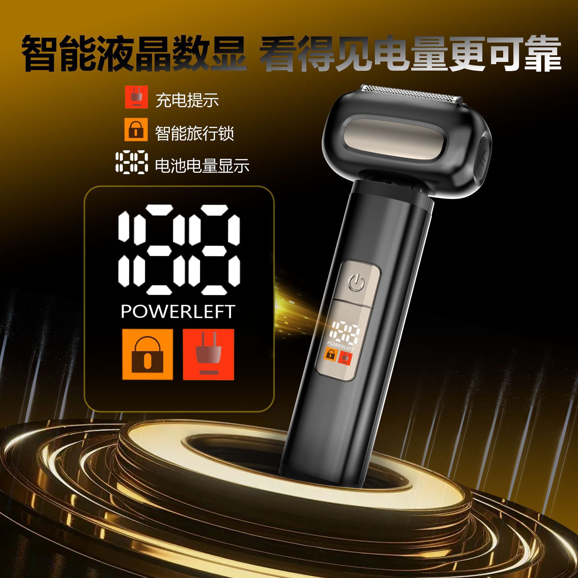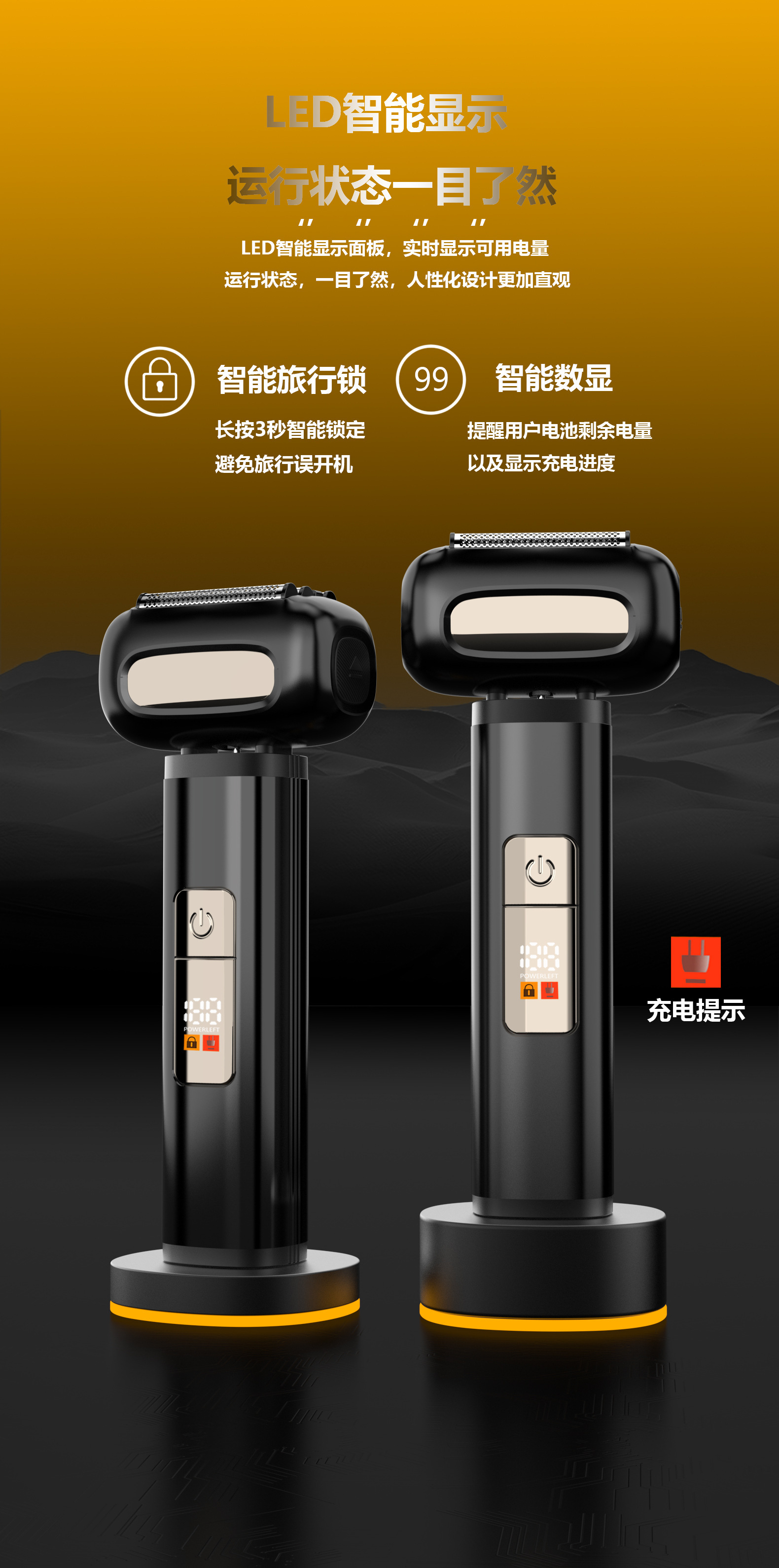 ·LED显示:电池电量显示、低电量提醒、工作指示灯,旅行锁