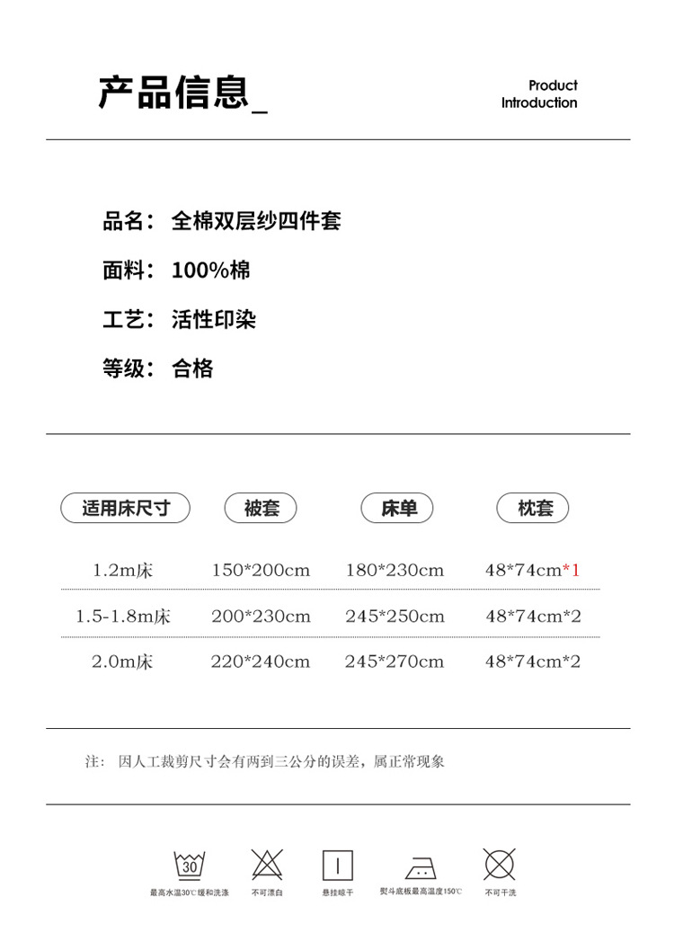 | 1.5米床单四件套【被套200×230cm 床单245×250cm 枕套2只】 | ¥16900 | 2688床可售 |