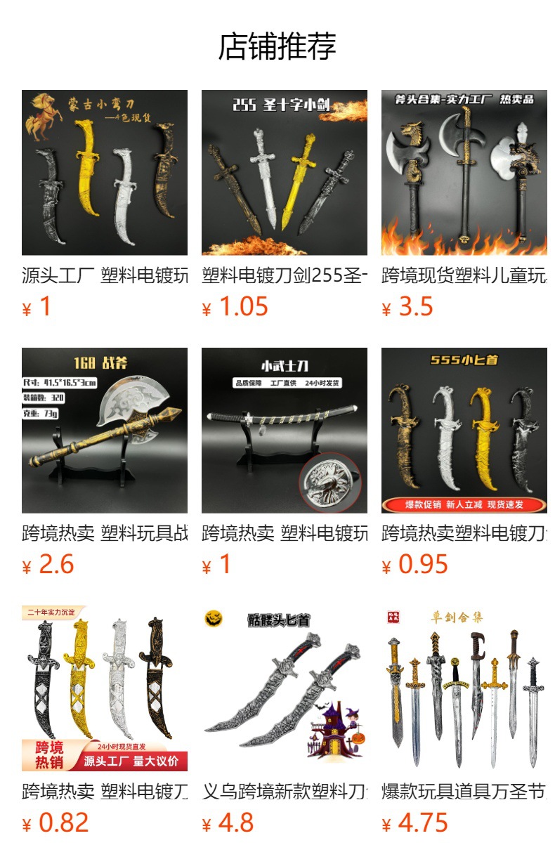 专业生产出口刀剑玩具20年,自主生产设计塑料仿真刀剑、木制玩具刀剑,有海盗系列、万圣节系列、中世纪骑士系列、日本武士刀系列、日本动漫系列、化妆舞会系列等刀、剑、盾牌相关产品,产品款式几百款,专业值得信赖。