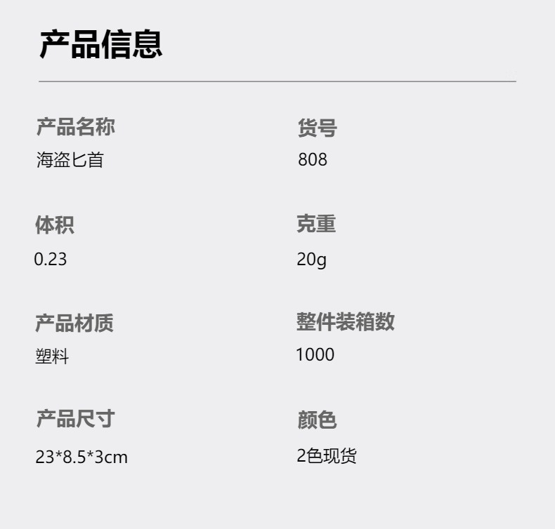 材质: 塑料 货号: 888 工艺: 半手工半机械 是否进口: 否 类别: 玩具刀剑 摆挂形式: 摆饰 风格: 欧式 造型: 卡通 包装: PP袋独立包装 产地: 浙江 厚度: 3cm 颜色: 古铜色中心圆圈骷髅小匕首,黑色手柄+银色 主要下游平台: 亚马逊,速卖通,其他 主要销售地区: 非洲,欧洲,南美,北美,中东 有可授权的自有品牌: 廷威玩具 是否跨境出口专供货源: 否 适用送礼场合: 其他 适用送礼关系: 朋友,孩子,同学,其他 适用节日: 万圣节 是否属于礼品: 是,个人礼品 重量: 0.02 kg/件
