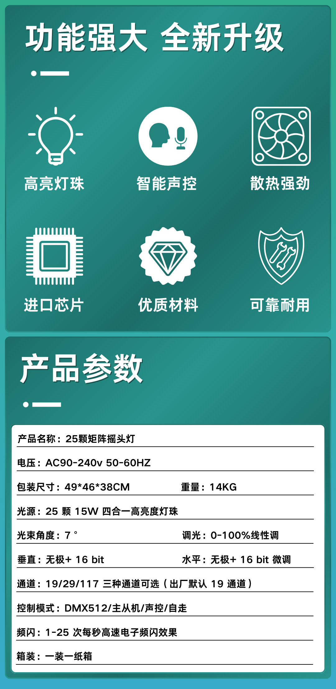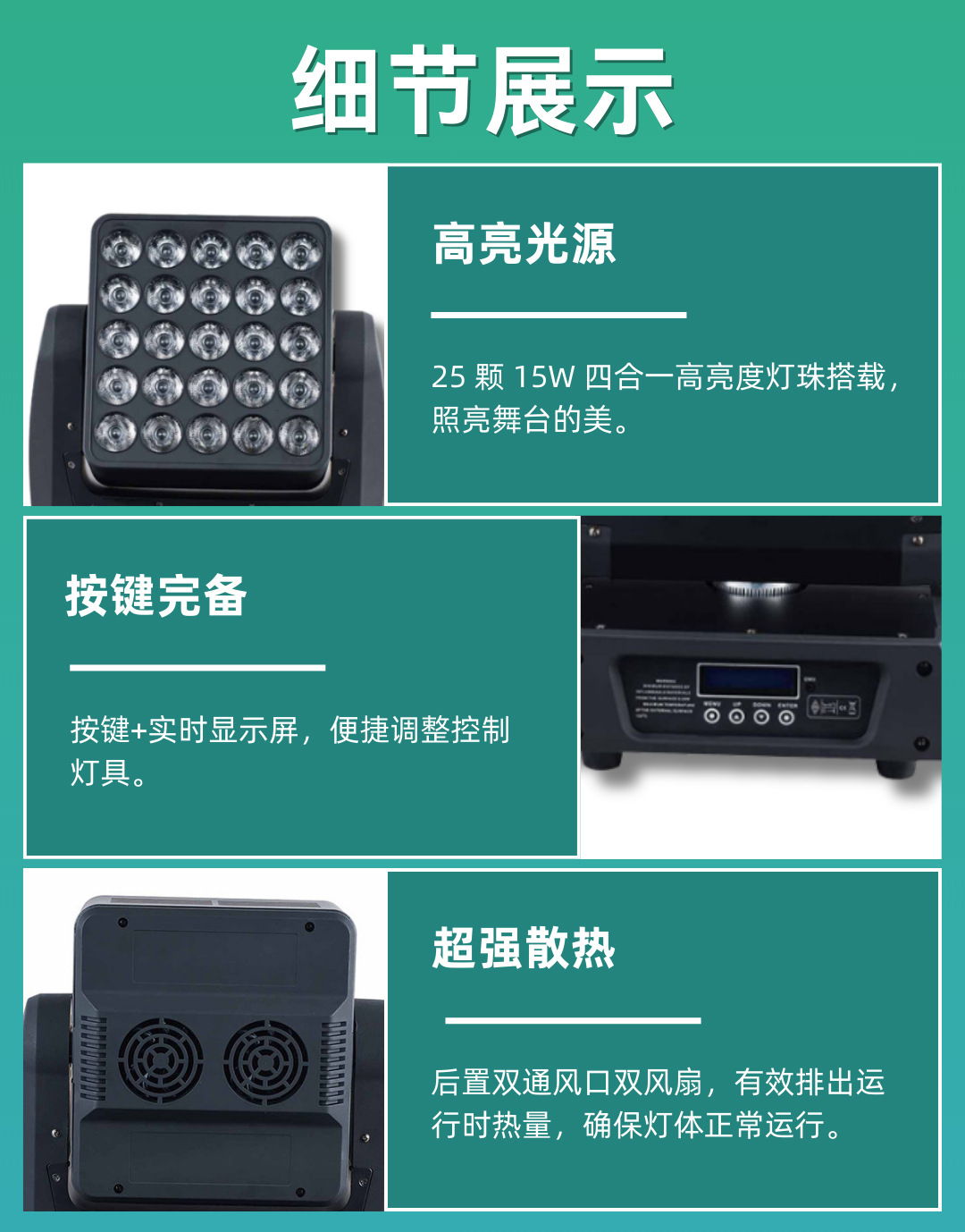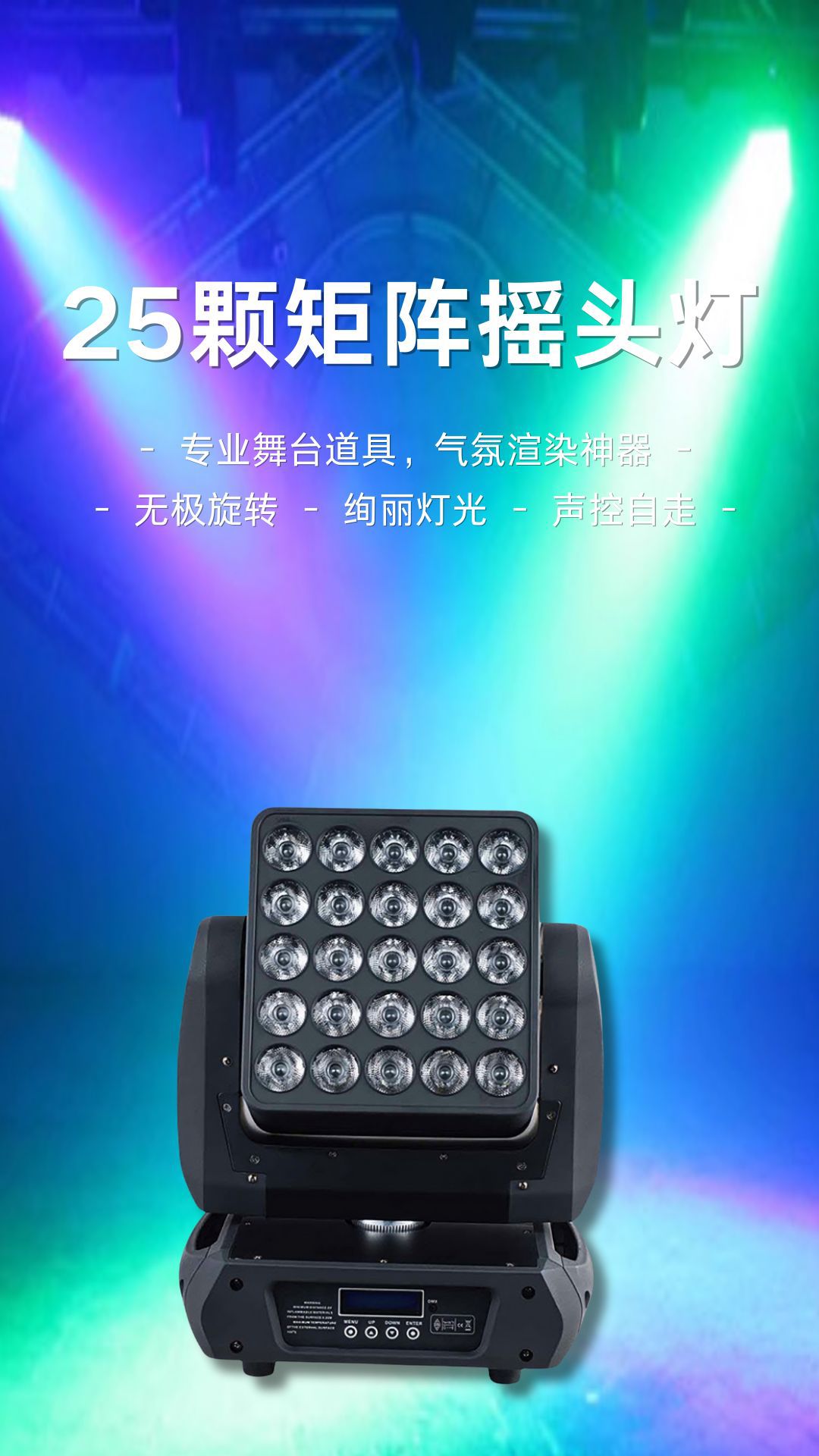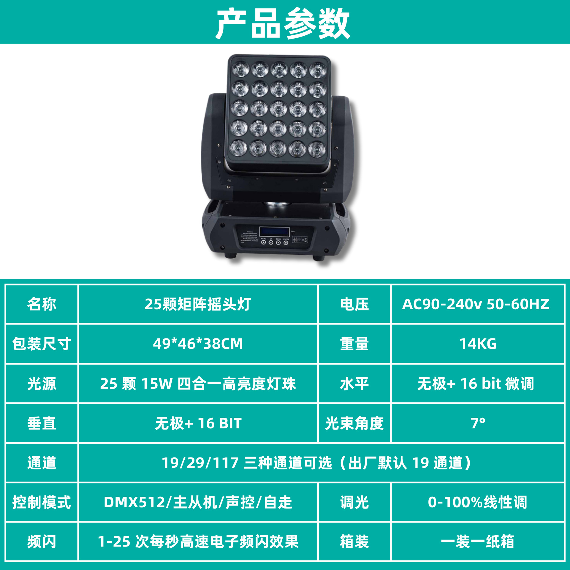 光源: 25 颗 15W 四合一高亮度灯珠