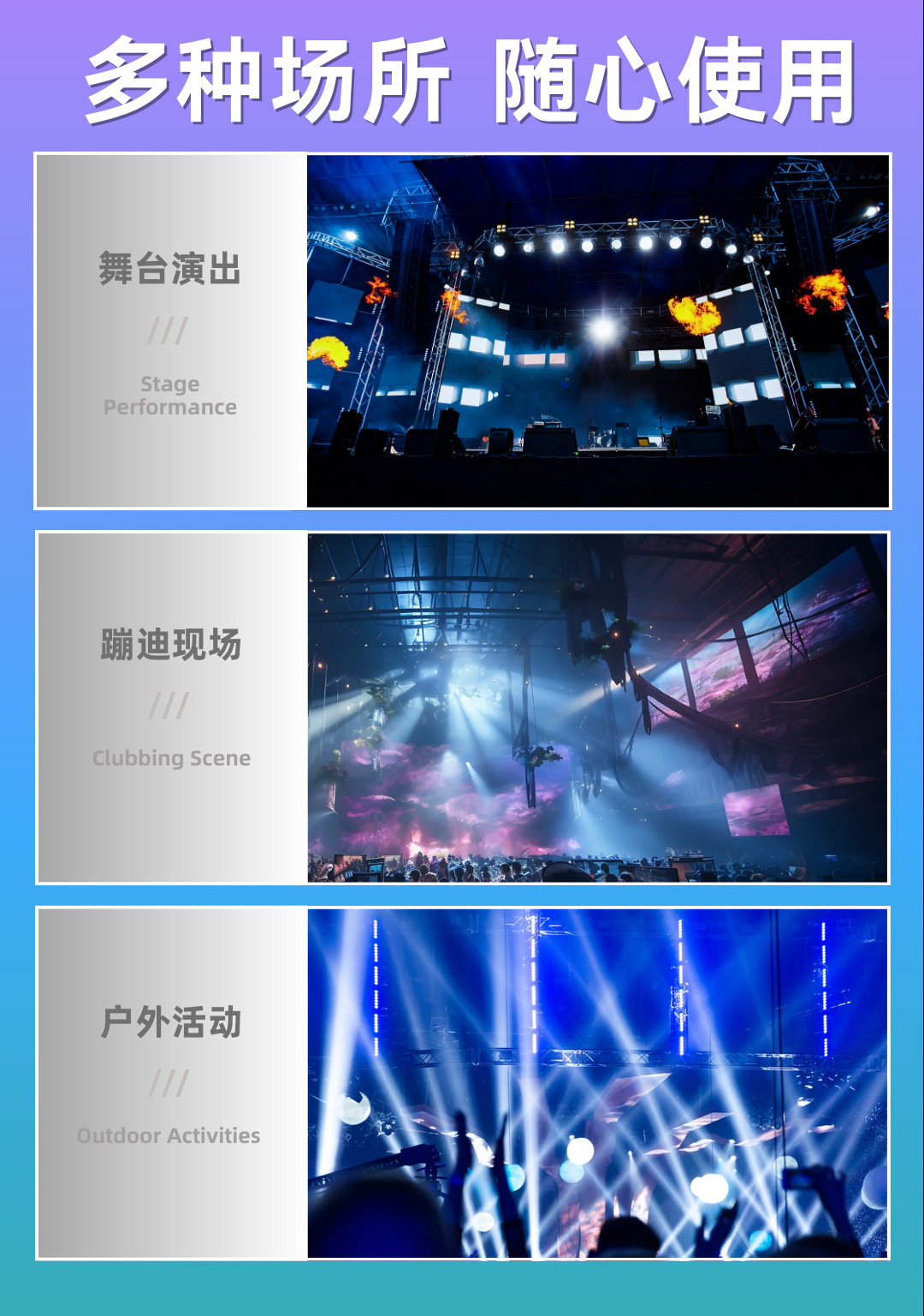 每个灯珠可以单独控制,多达 117个通道,可随意设置各种 字母、数字、图案,集光束、染色、效果灯为一体。