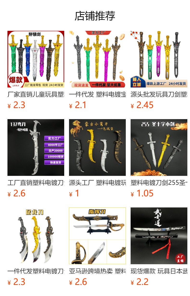专业生产出口刀剑玩具20年,自主生产设计塑料仿真刀剑、木制玩具刀剑,有海盗系列、万圣节系列、中世纪骑士系列、日本武士刀系列、日本动漫系列、化妆舞会系列等刀、剑、盾牌相关产品,产品款式几百款,专业值得信赖。
