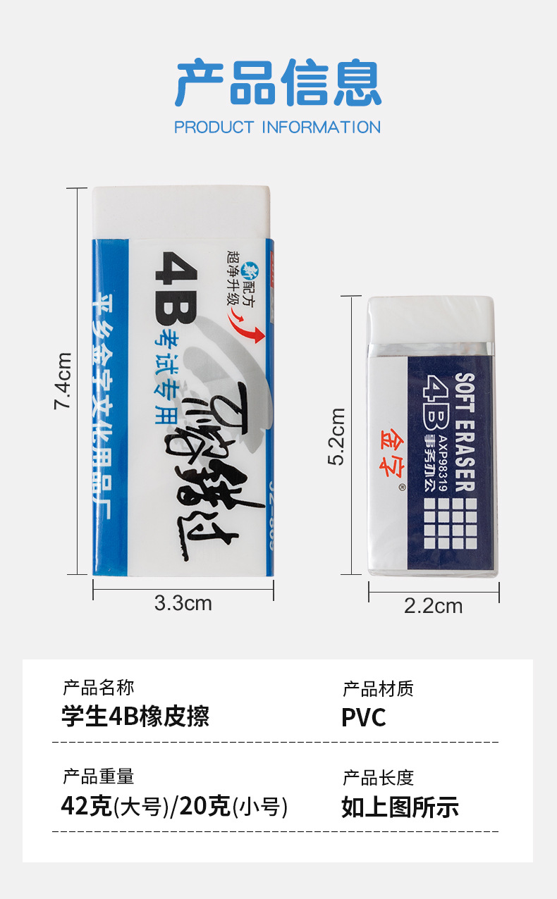 品牌: 大圣 材质: 其他 尺寸: 其他 造型: 4B橡皮 货号: 4B橡皮擦 型号: PVC 规格: 小号4B,大号4B 用途: 其他 加印LOGO: 可以 加工定制: 否 净重: 其他 是否进口: 否 是否属于礼品: 否 是否专利货源: 否 是否IP授权: 否