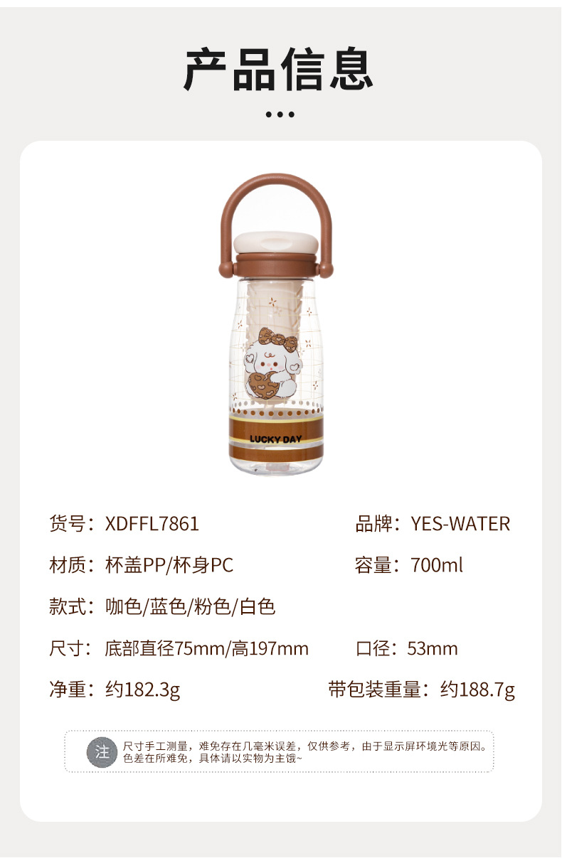 材质: PC 功能: 环保 品牌: YES-WATER 尺寸(高度、口径): 197/75mm 口径53mm 样式: 带吸管 加印LOGO: 不可以 产品类别: 塑料杯 是否进口: 否 产品类型: 提手吸管杯 风格: 卡通 货号: XDFFL7861 结构: 单层 适用场所: 其他 适用对象: 通用 图案: 卡通 微波炉: 不可用 形状: 大肚杯 重量: 净重182.3g带包装重188.3g 适用人群: 通用 贸易属性: 外贸+内贸