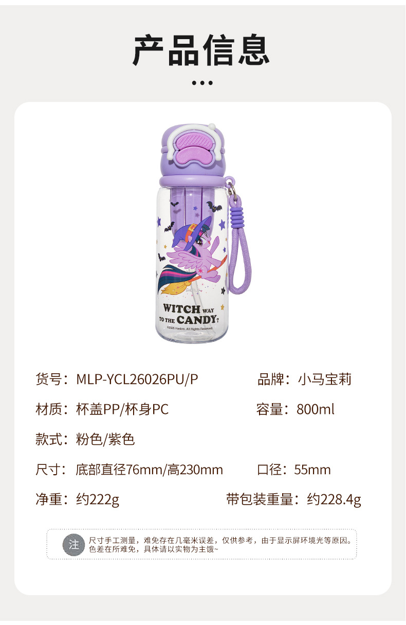 材质: PC 功能: 环保 品牌: YES-WATER 尺寸(高度、口径): 230/76mm 口径55mm 样式: 带吸管 加印LOGO: 不可以 产品类别: 塑料杯 是否进口: 否 产品类型: 提手吸管杯 风格: 卡通 货号: MLP-YCL26026P/PU 结构: 单层 适用场所: 其他 适用对象: 通用 图案: 卡通 微波炉: 不可用 形状: 双饮杯 重量: 净重222g带包装重228.4g 适用人群: 通用 贸易属性: 外贸+内贸