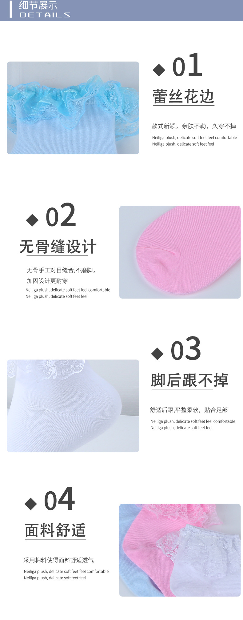 面料名称: 棉 风格: 日系 无骨缝制: 否:机器缝头 功能: 防臭 图案: 纯色 包装形式: 无包装 适用性别: 女 适用年龄段: 青年(18-40周岁) 主面料成分: 棉 筒高: 高筒 针数: 170N 上市时间: 2024年春季 适合季节: 春季 产地: 浙江 是否跨境出口专供货源: 否 颜色: 粉色,蓝色,白色 尺码: 均码 货号: 蕾丝花边袜 品牌: 其他 是否进口: 否