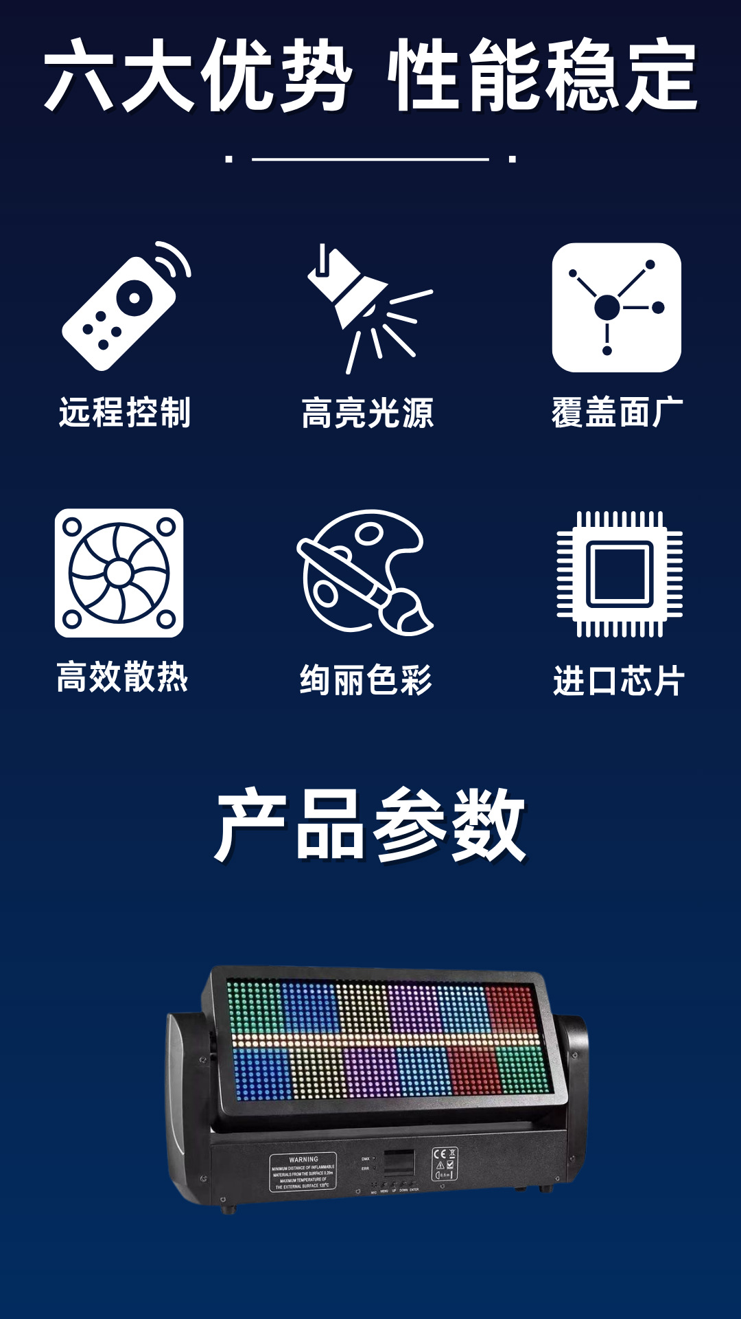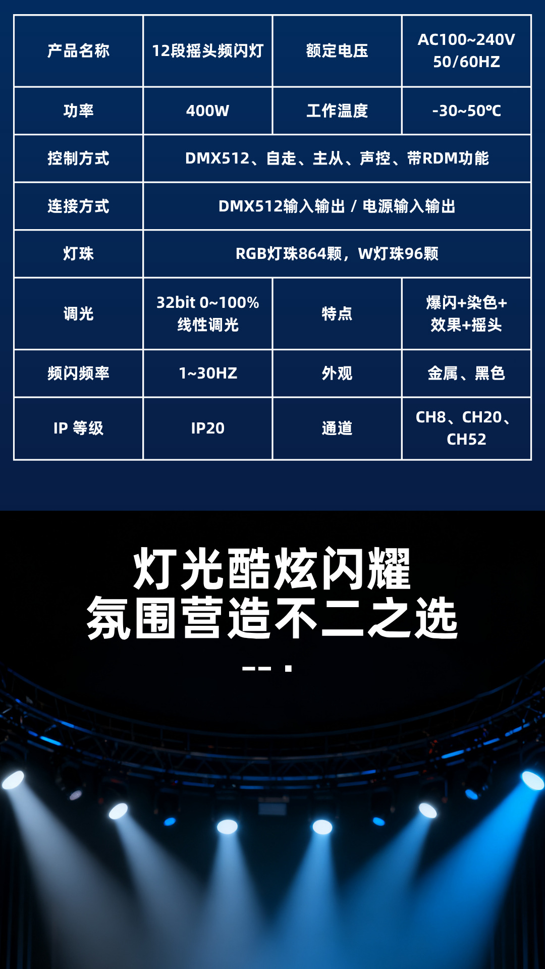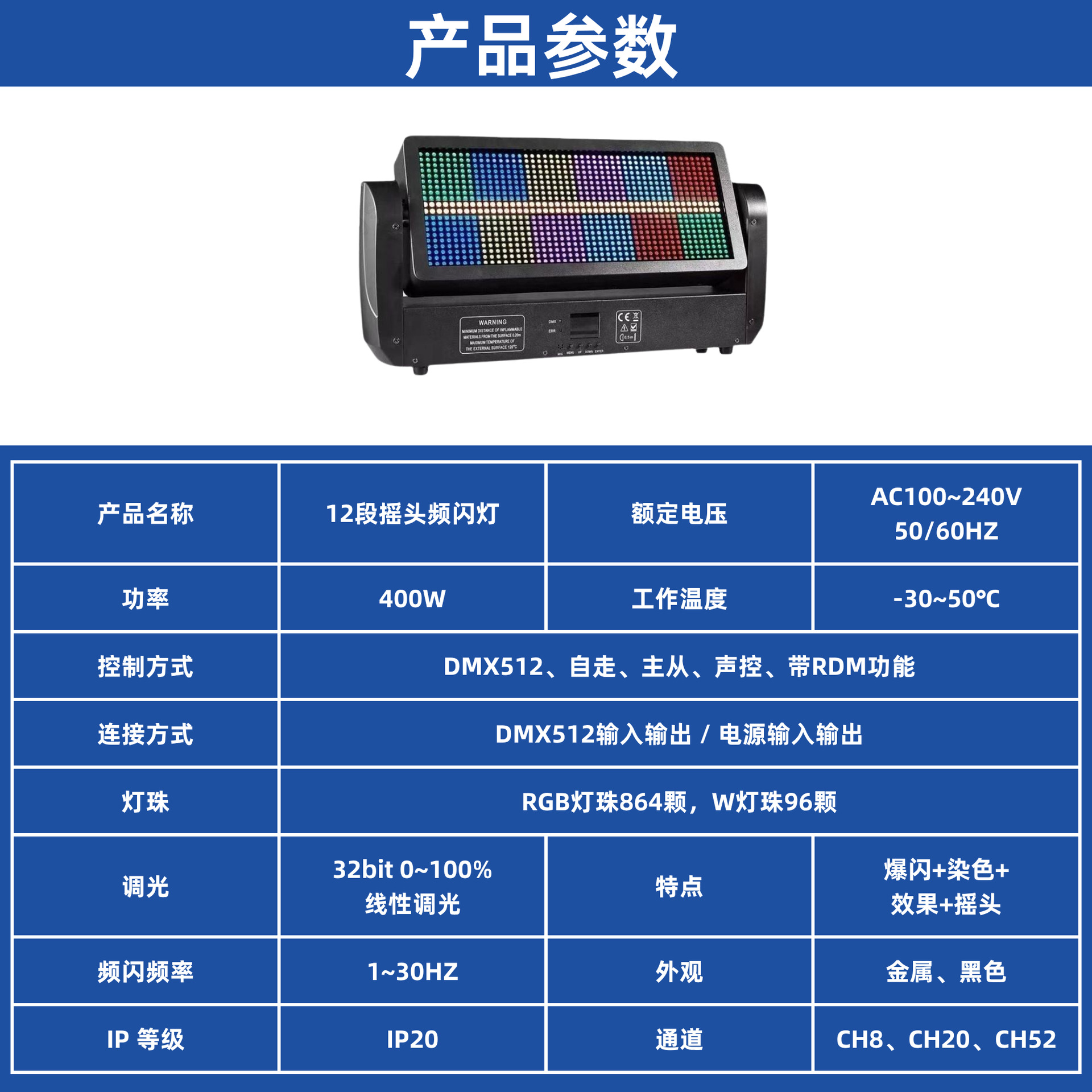 控制方式: DMX512、自走、主从、声控、带RDM功能。