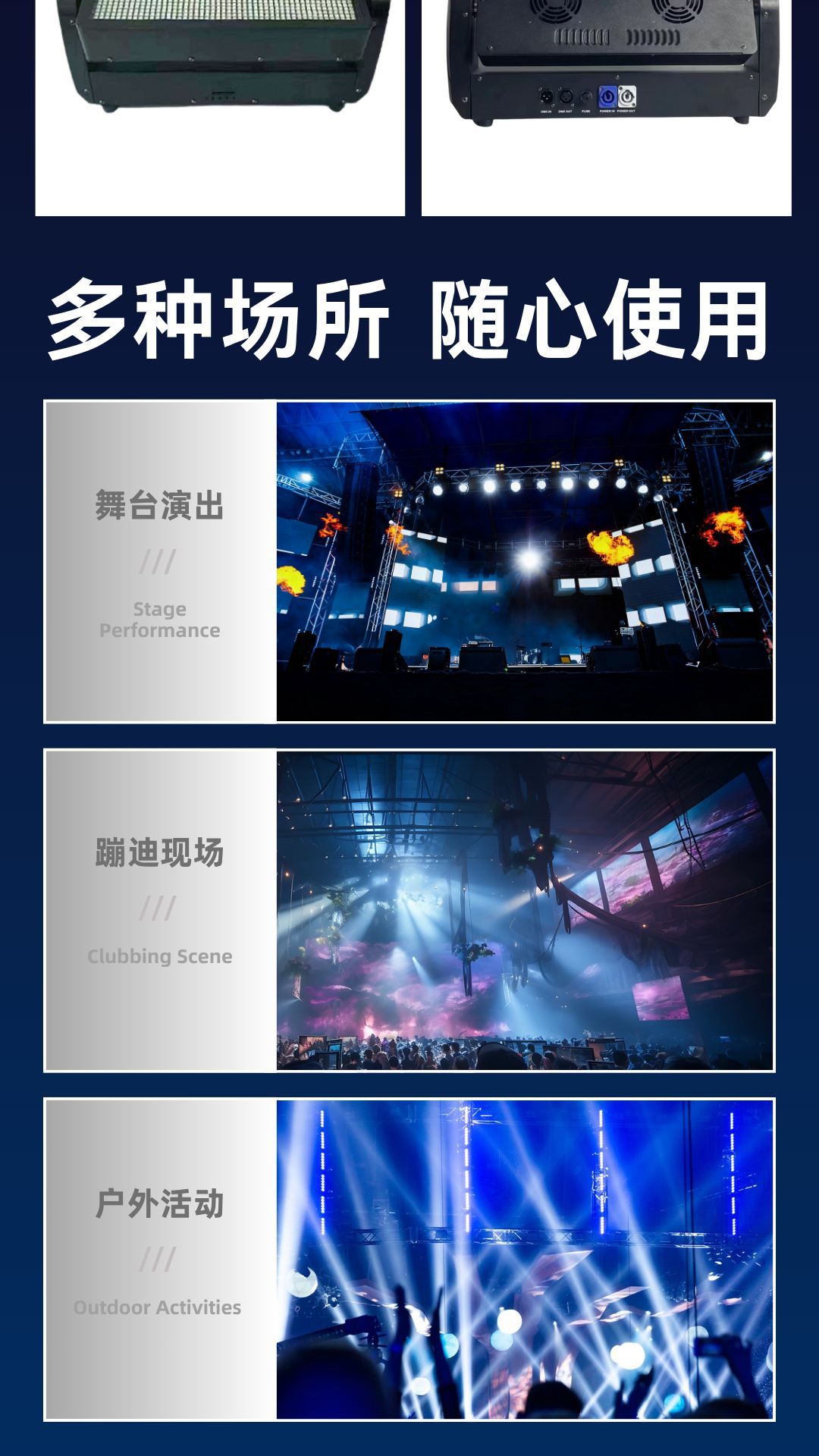 连接方式:DMX512输入输出 / 电源输入输出。