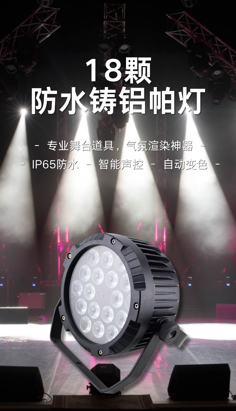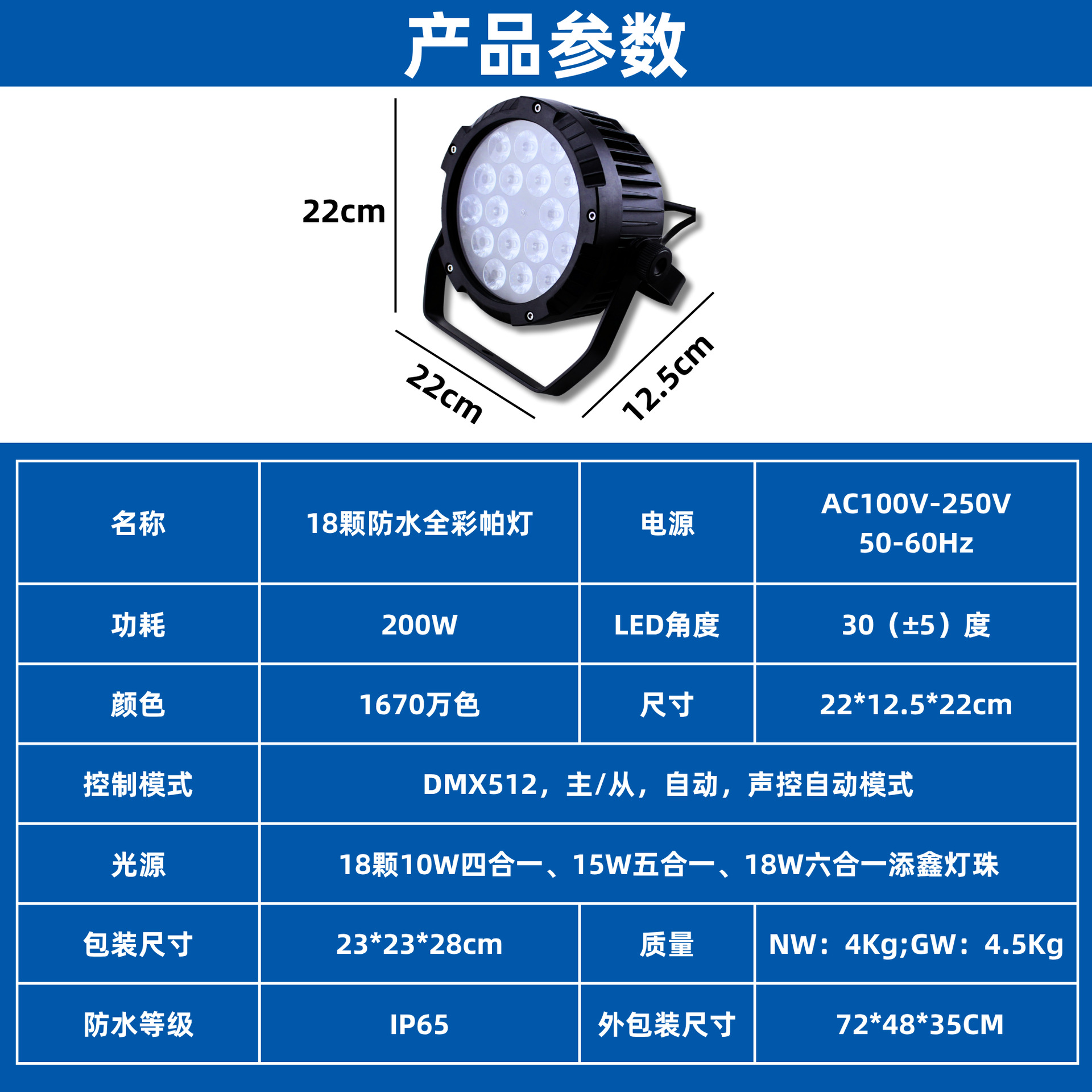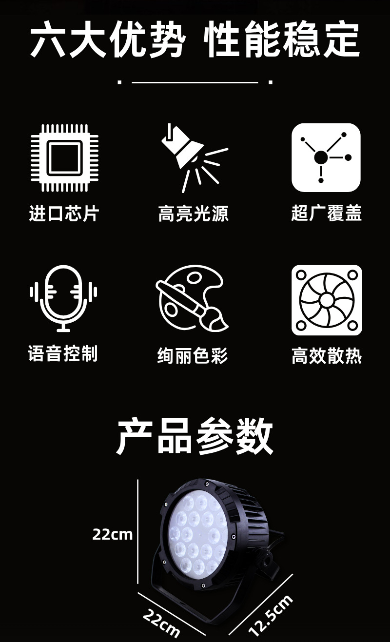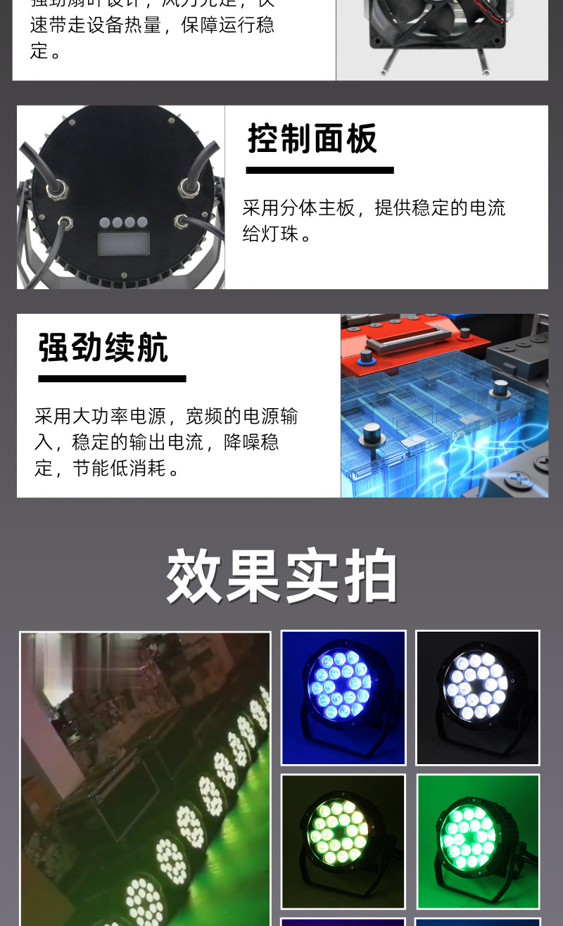 控制模式:DMX512,主/从,自动,声控自动模式(按功能键):颜色变化、颜色闪烁、颜色调光、颜色渐变/面光效颜色跳变