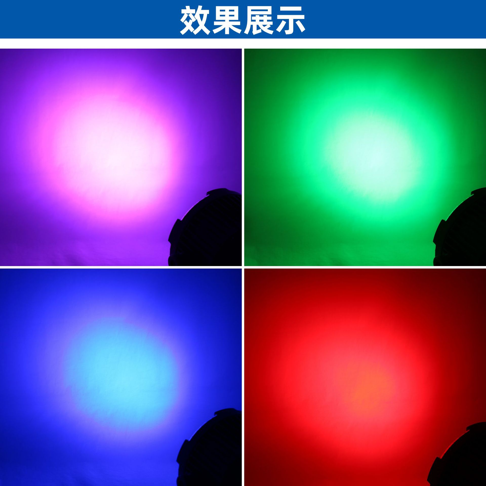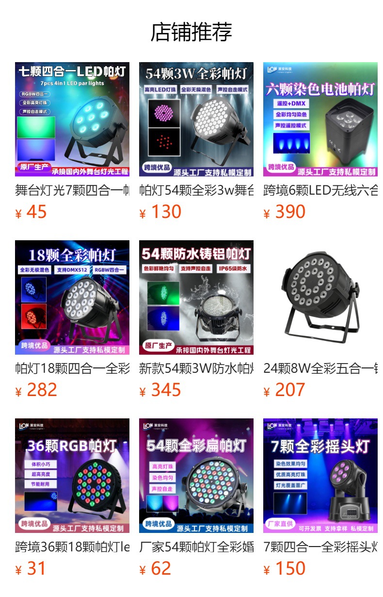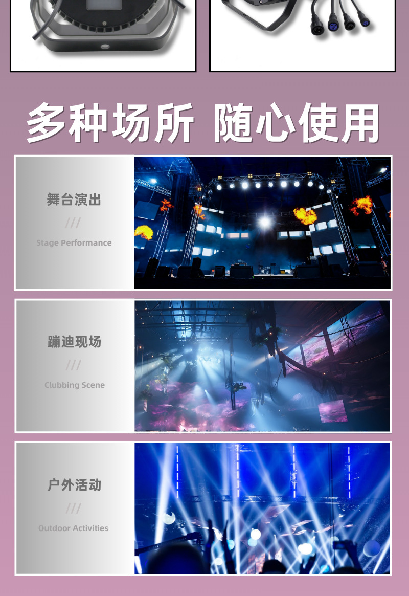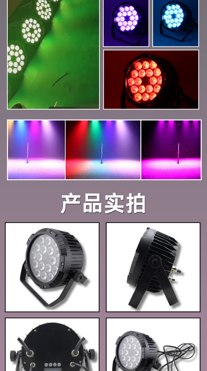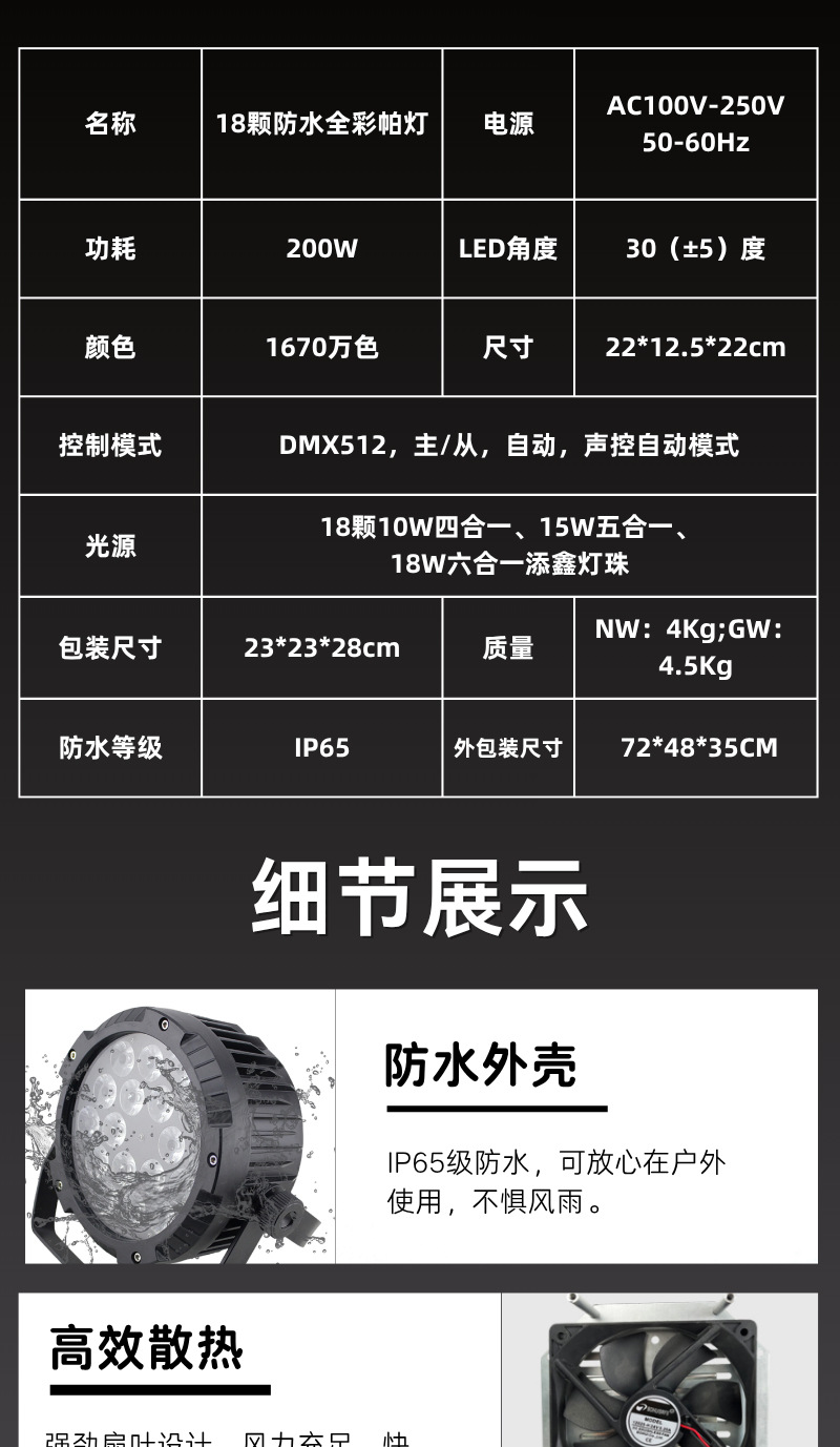 控制模式:DMX512,主/从,自动,声控自动模式(按功能键):颜色变化、颜色闪烁、颜色调光、颜色渐变/面光效颜色跳变