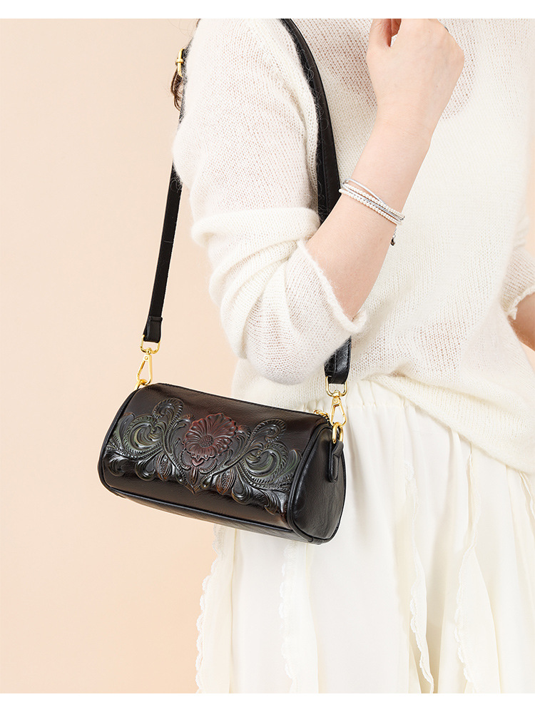 单肩包跨境压花质感休闲百搭斜挎包民族风通勤国风女士圆筒包包