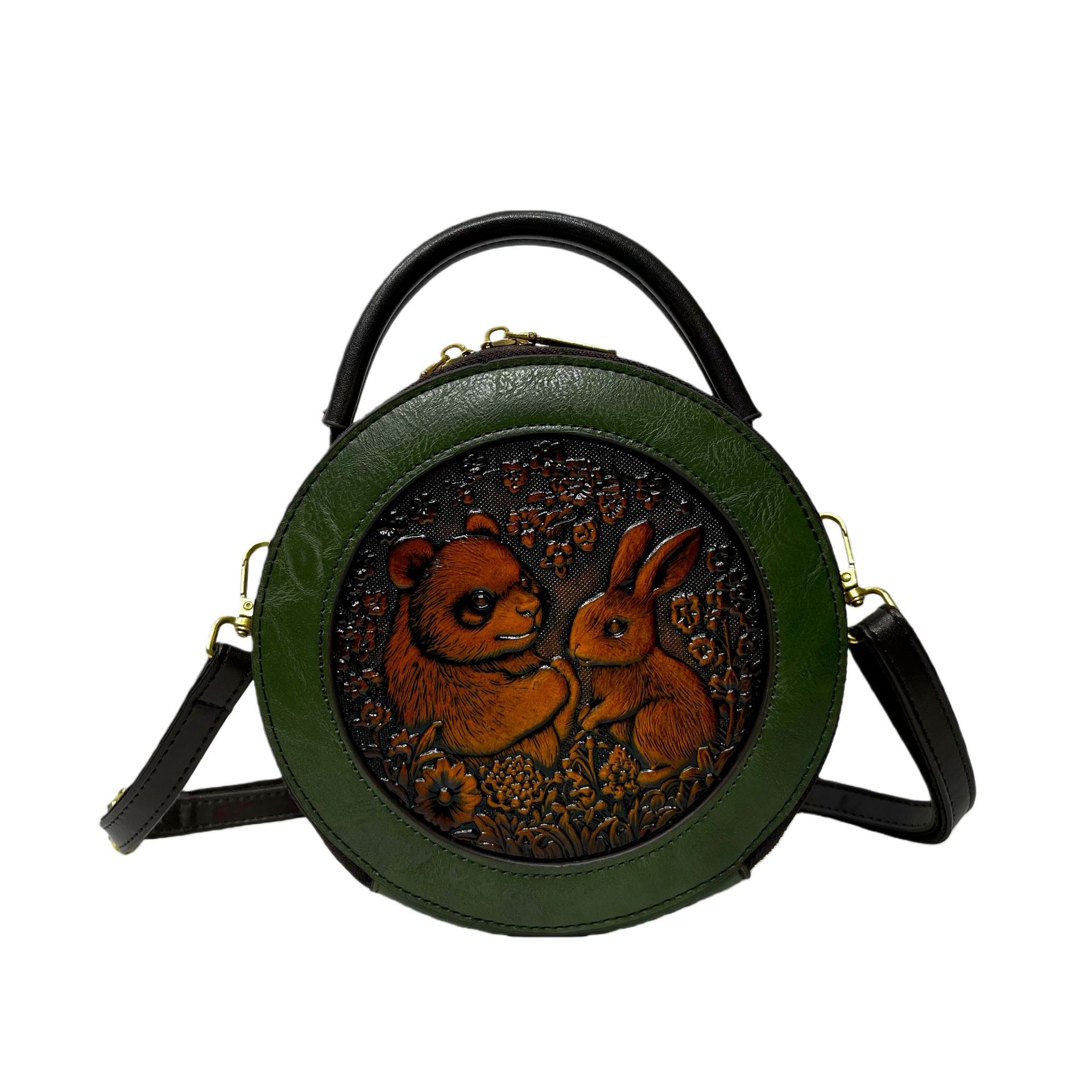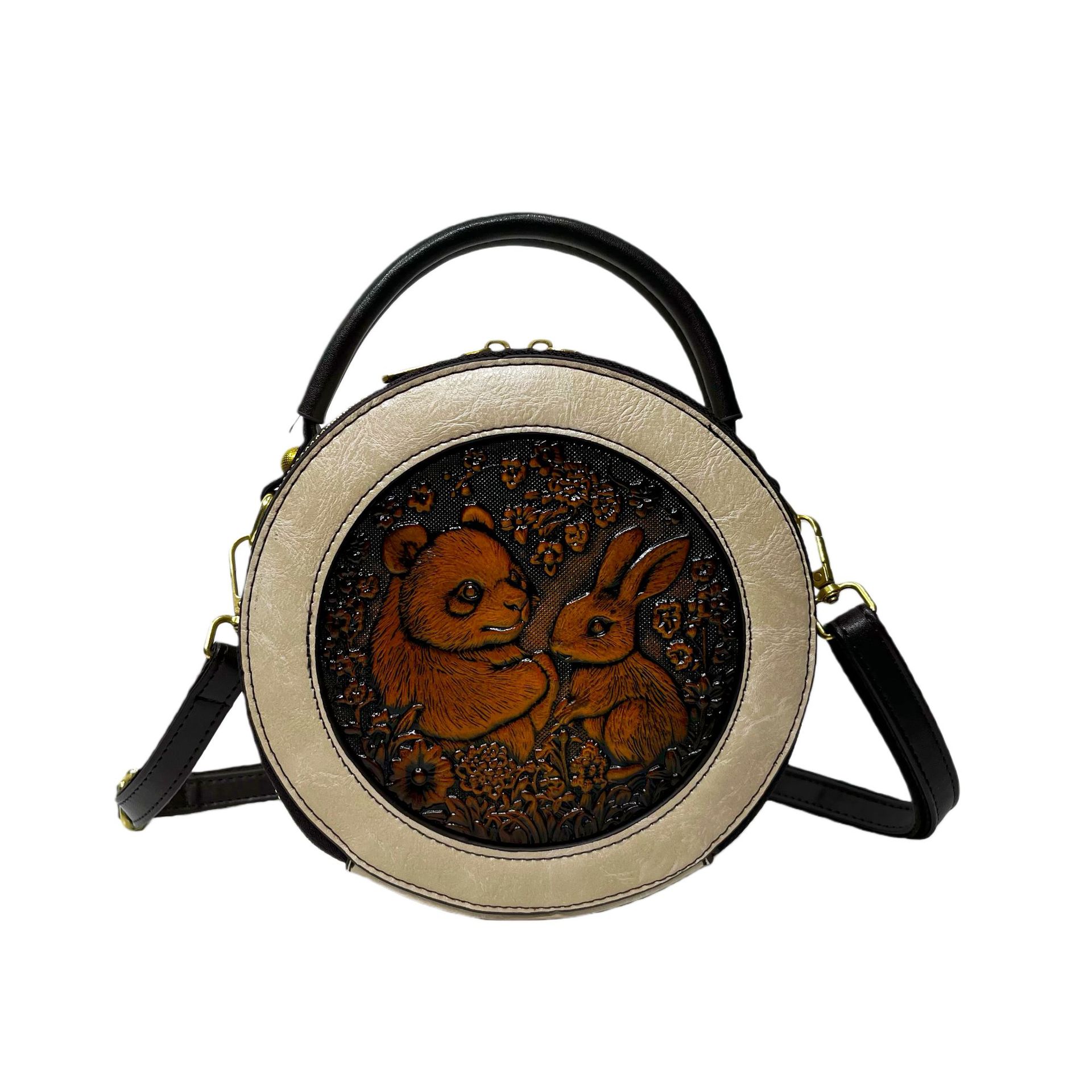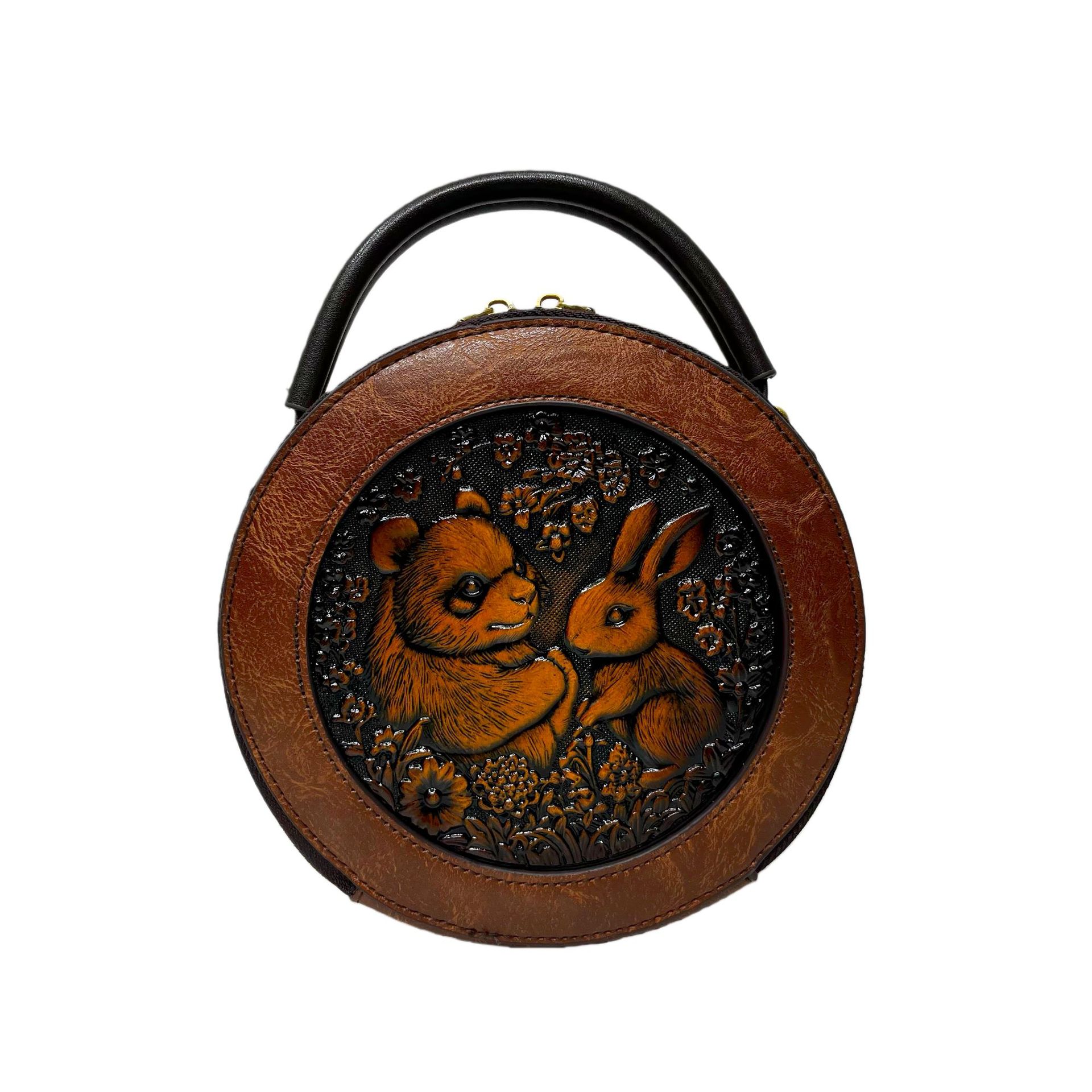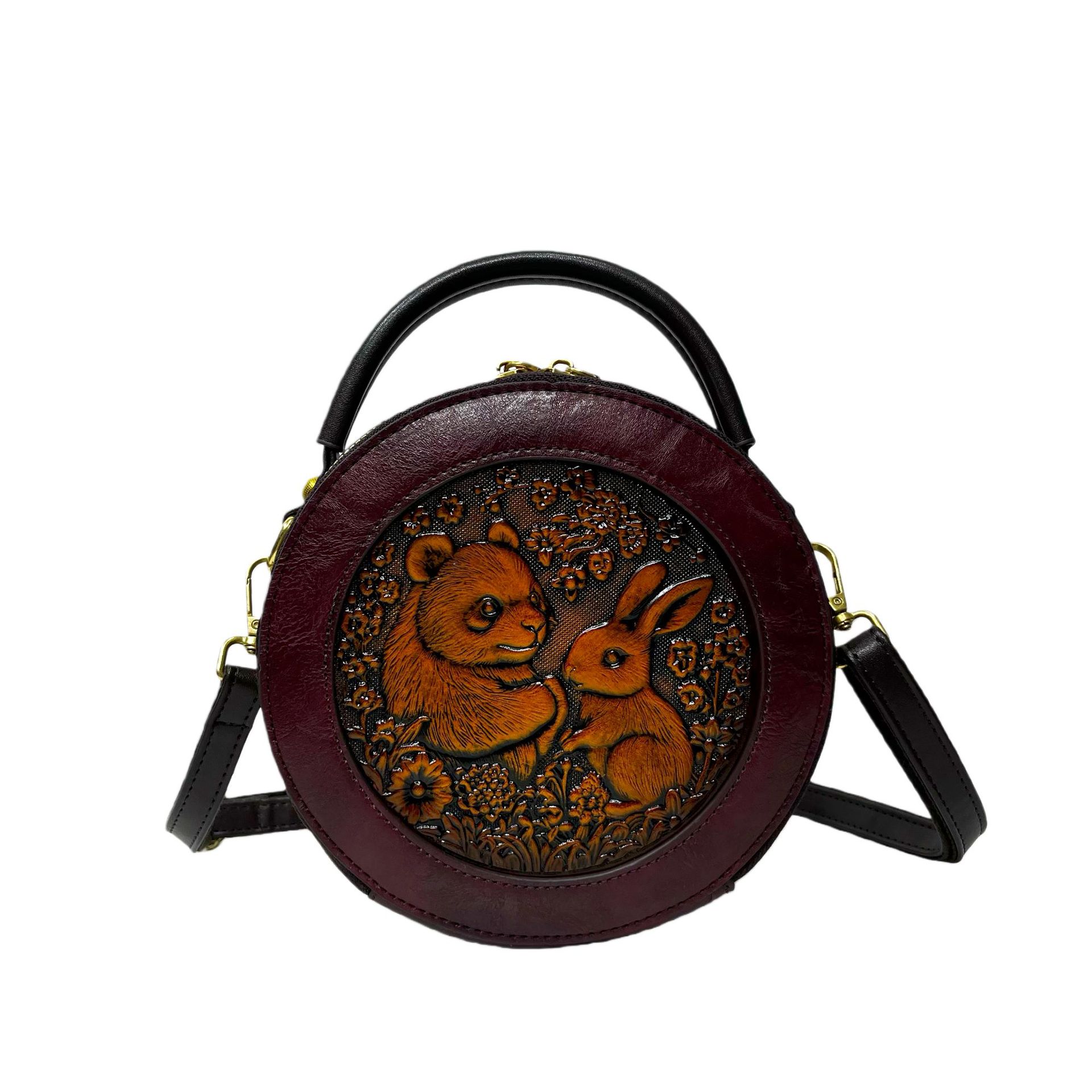 材质: 手工耐磨面料 箱包大小: 中 里料质地: 涤纶 箱包潮流款式: 单肩包 品牌: 其他 流行元素: 车缝线,压花 硬度: 中偏硬 颜色: 黑色,黄棕色,酒红色,咖色,绿色,米白色 风格: 国潮新风 货号: 9054#-圆皮雕玉兔熊猫 上市年份季节: 2026年春季 箱包形状: 横款方型 开盖方式: 拉链 包内部结构: 拉链暗袋,手机袋,夹层拉链袋 外袋种类: 内贴袋 有可授权的自有品牌: 否 有无夹层: 有 适用场景: 日常搭配 肩带根数: 单根 重量: 0.46 kg/个