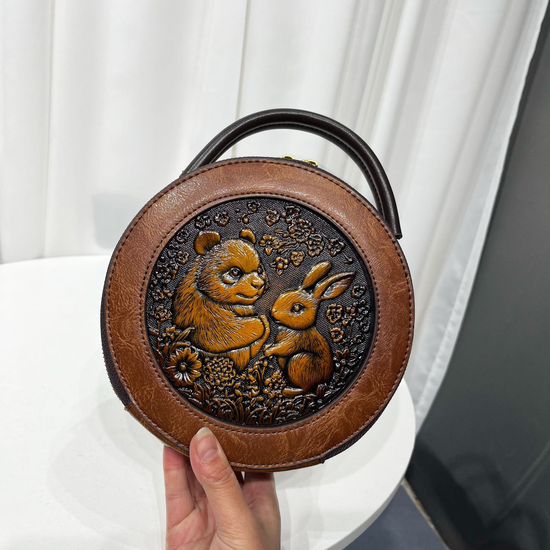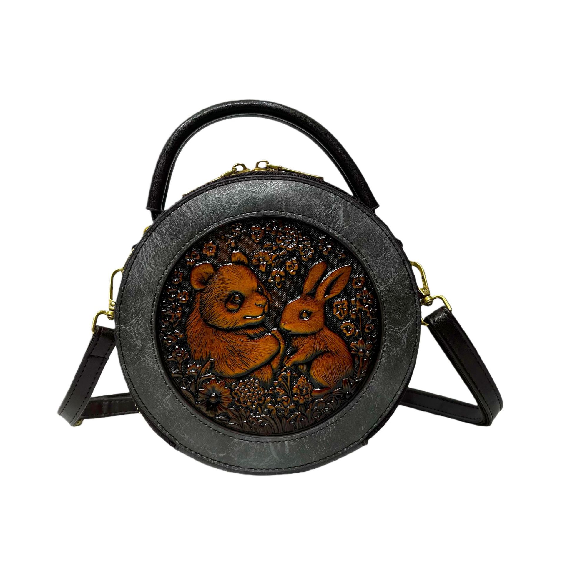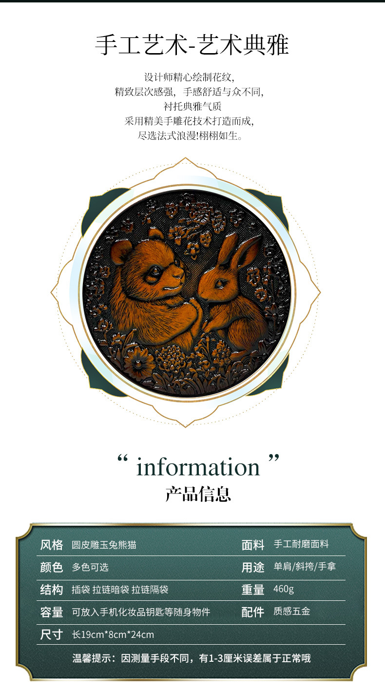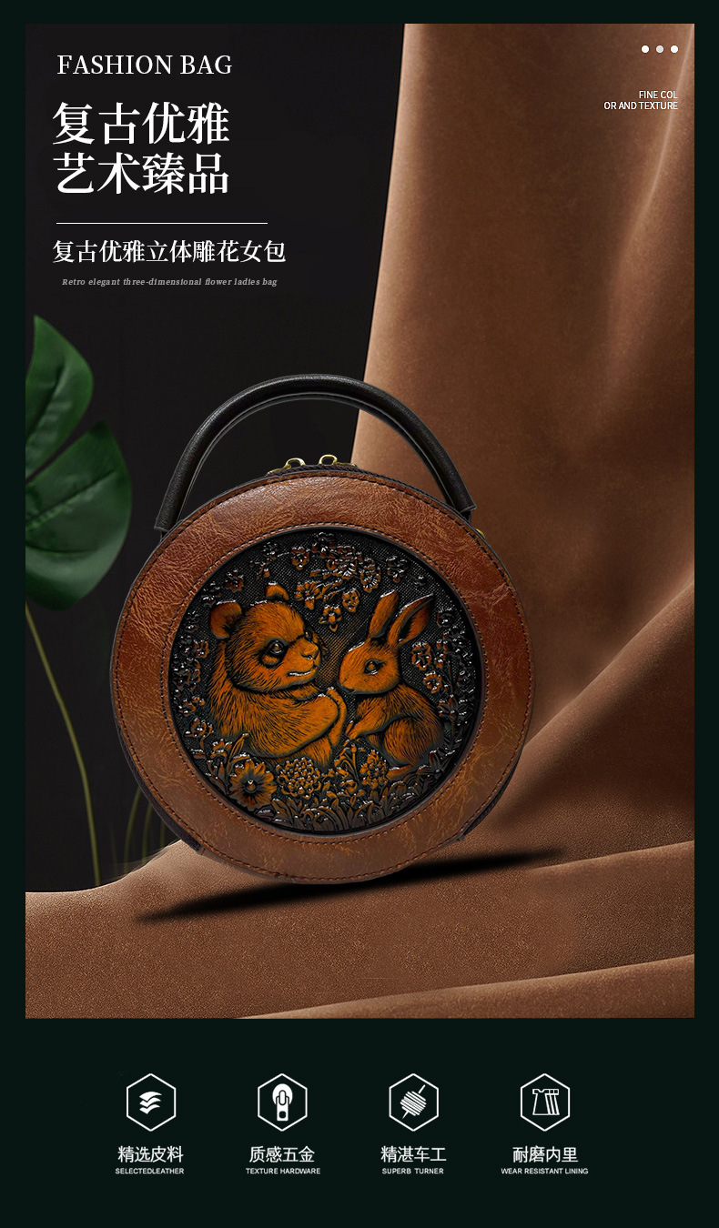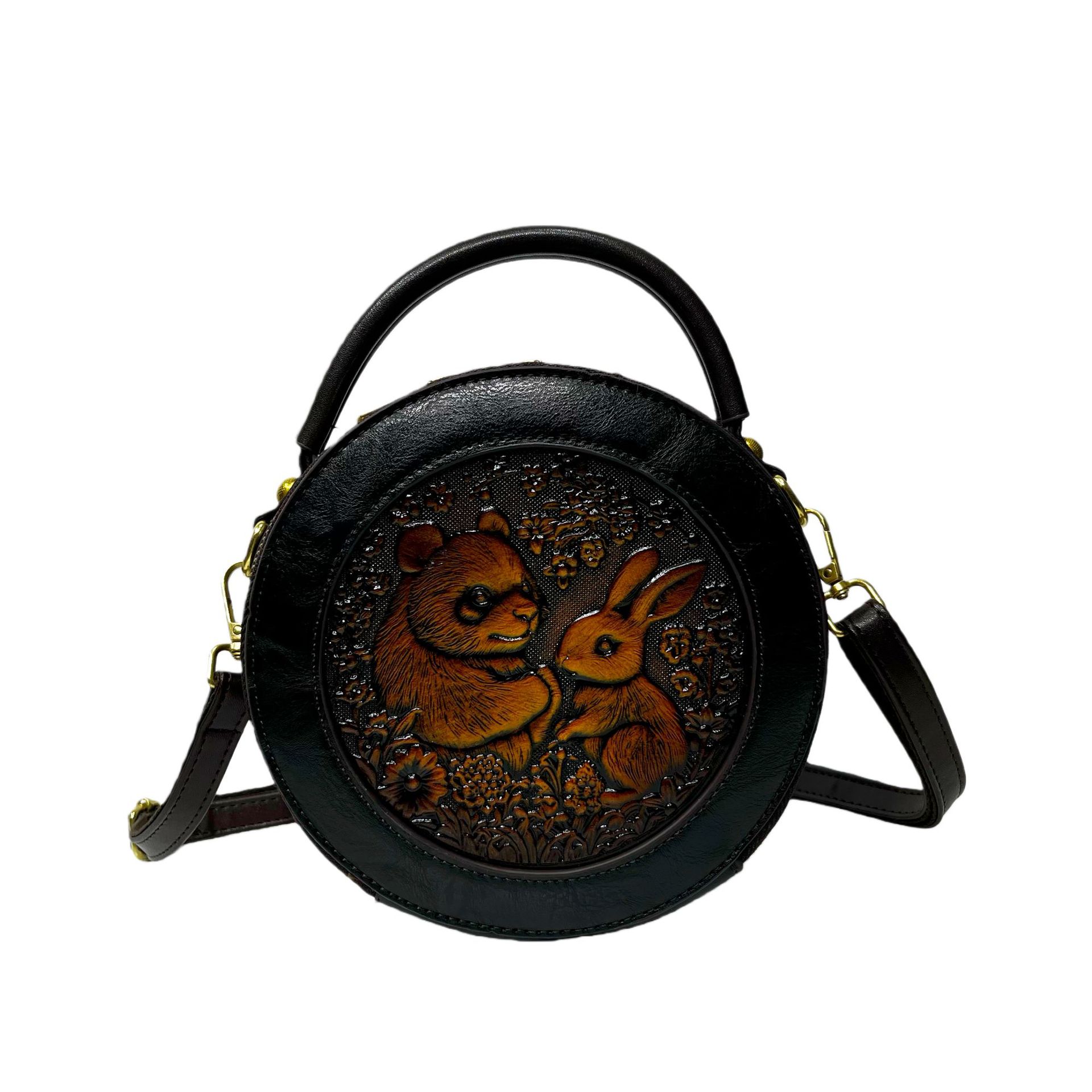 材质: 手工耐磨面料 箱包大小: 中 里料质地: 涤纶 箱包潮流款式: 单肩包 品牌: 其他 流行元素: 车缝线,压花 硬度: 中偏硬 颜色: 黑色,黄棕色,酒红色,咖色,绿色,米白色 风格: 国潮新风 货号: 9054#-圆皮雕玉兔熊猫 上市年份季节: 2026年春季 箱包形状: 横款方型 开盖方式: 拉链 包内部结构: 拉链暗袋,手机袋,夹层拉链袋 外袋种类: 内贴袋 有可授权的自有品牌: 否 有无夹层: 有 适用场景: 日常搭配 肩带根数: 单根 重量: 0.46 kg/个