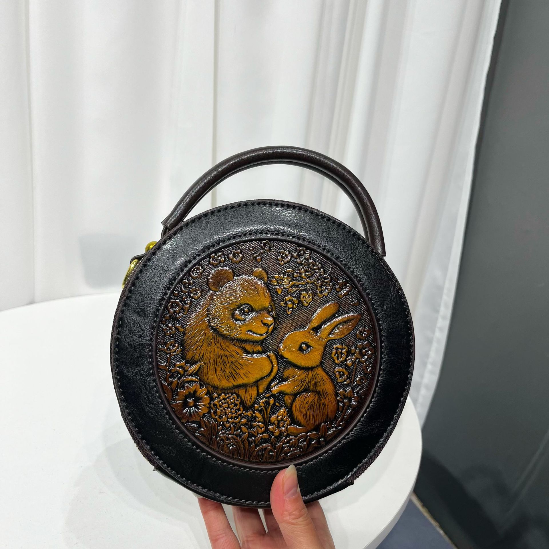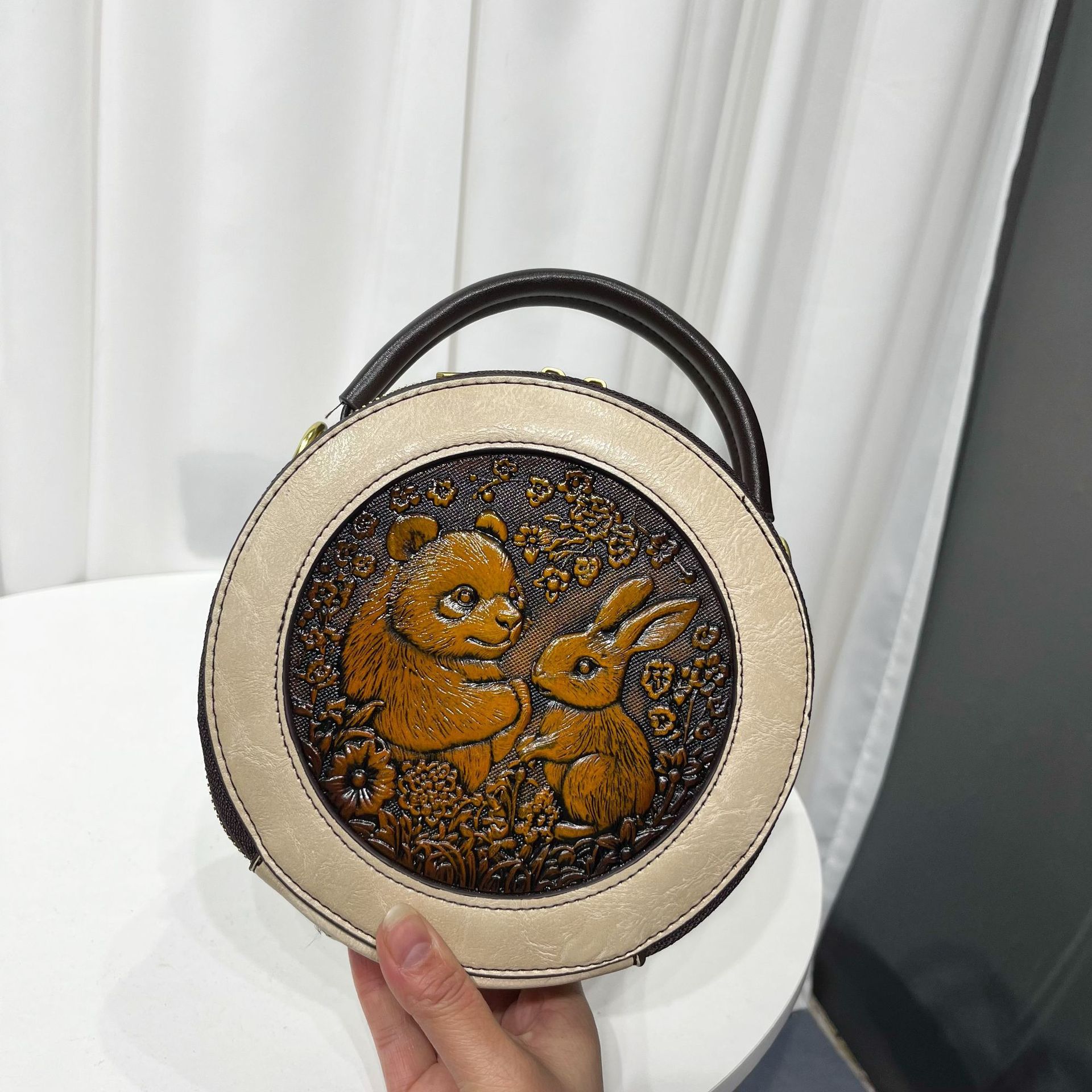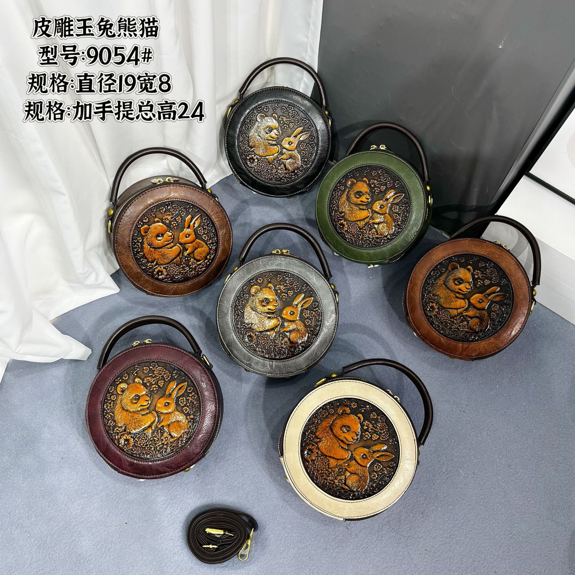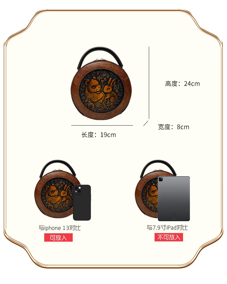 材质: 手工耐磨面料 箱包大小: 中 里料质地: 涤纶 箱包潮流款式: 单肩包 品牌: 其他 流行元素: 车缝线,压花 硬度: 中偏硬 颜色: 黑色,黄棕色,酒红色,咖色,绿色,米白色 风格: 国潮新风 货号: 9054#-圆皮雕玉兔熊猫 上市年份季节: 2026年春季 箱包形状: 横款方型 开盖方式: 拉链 包内部结构: 拉链暗袋,手机袋,夹层拉链袋 外袋种类: 内贴袋 有可授权的自有品牌: 否 有无夹层: 有 适用场景: 日常搭配 肩带根数: 单根 重量: 0.46 kg/个