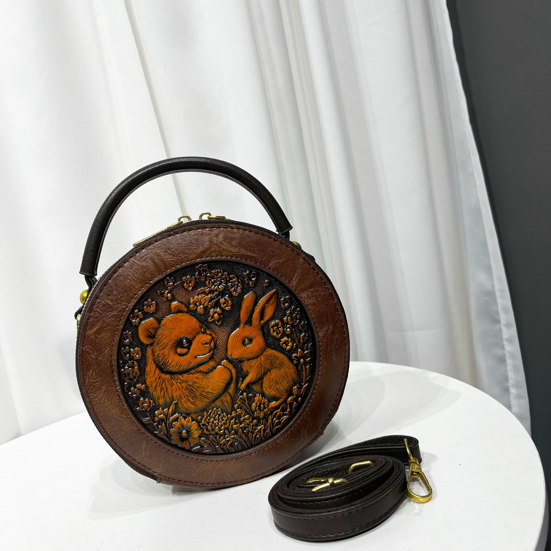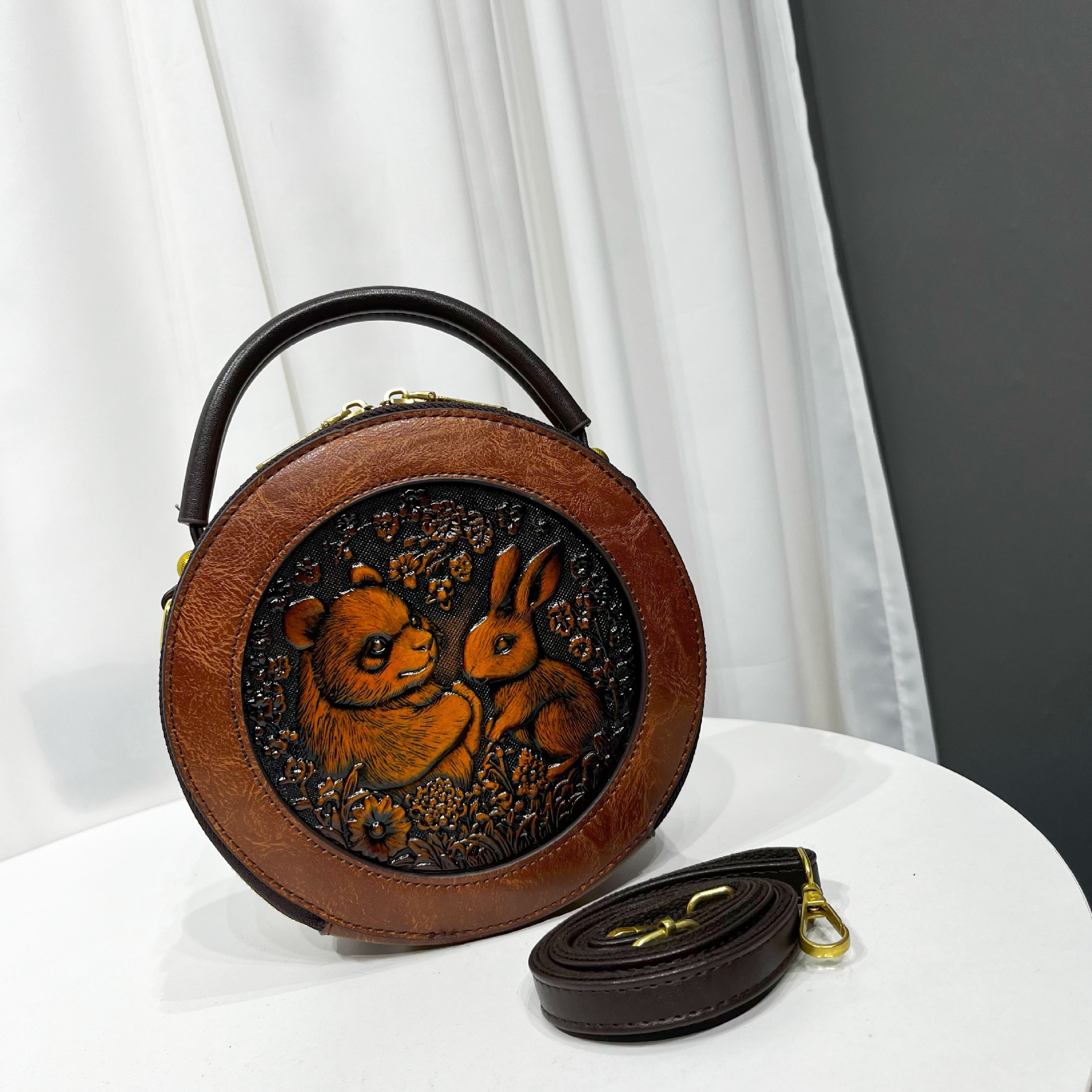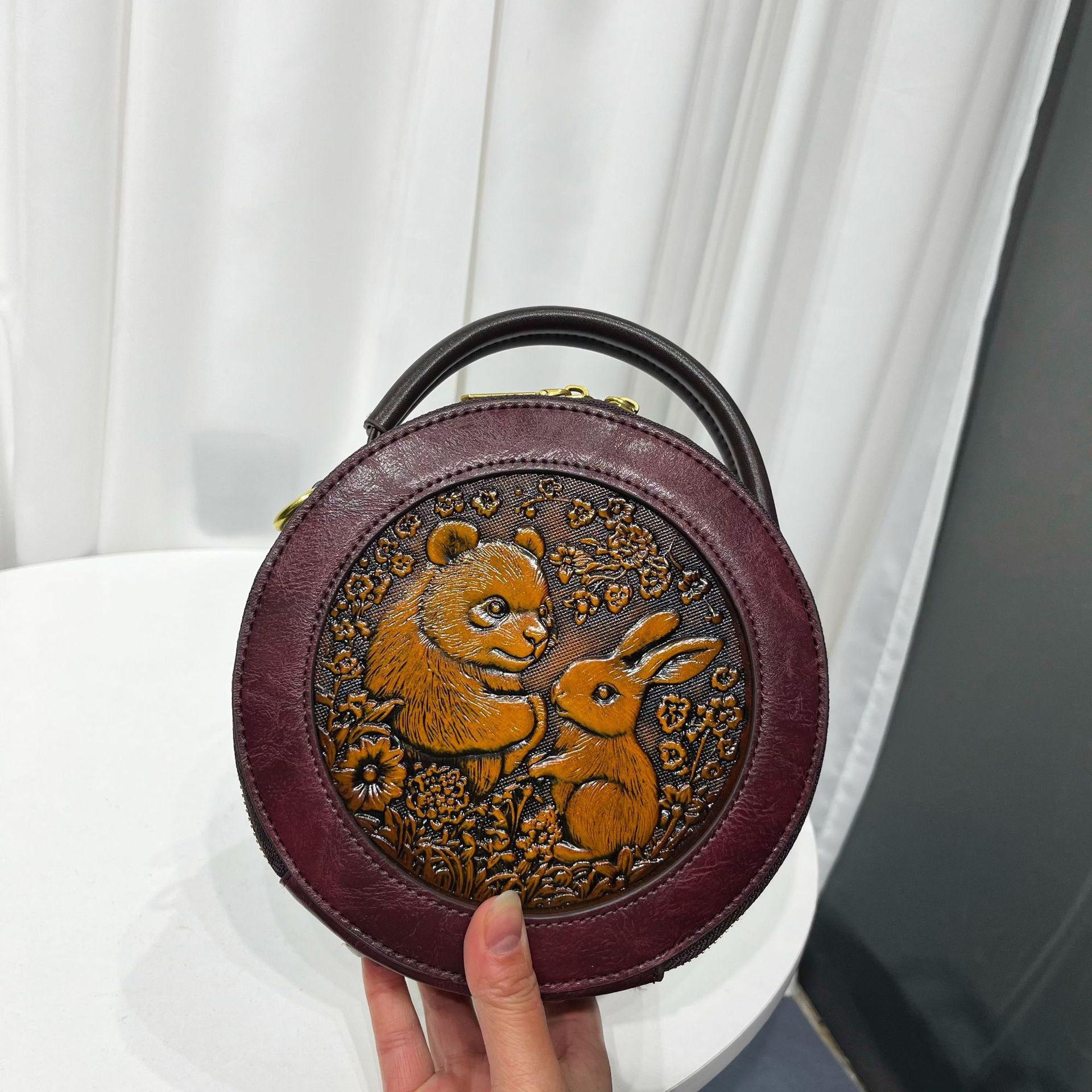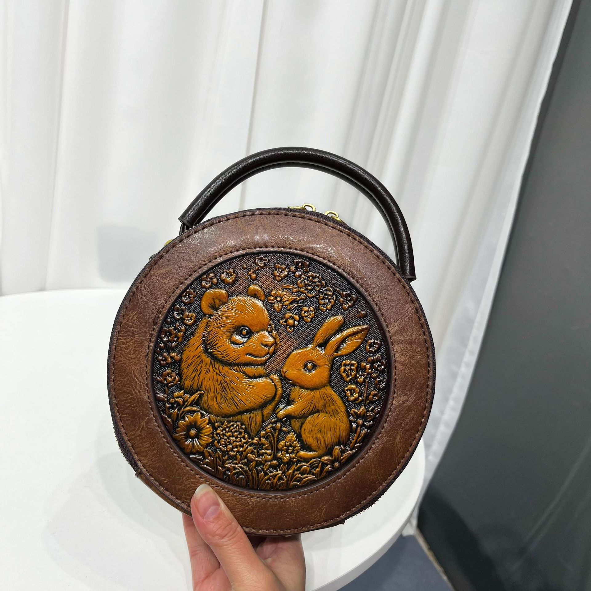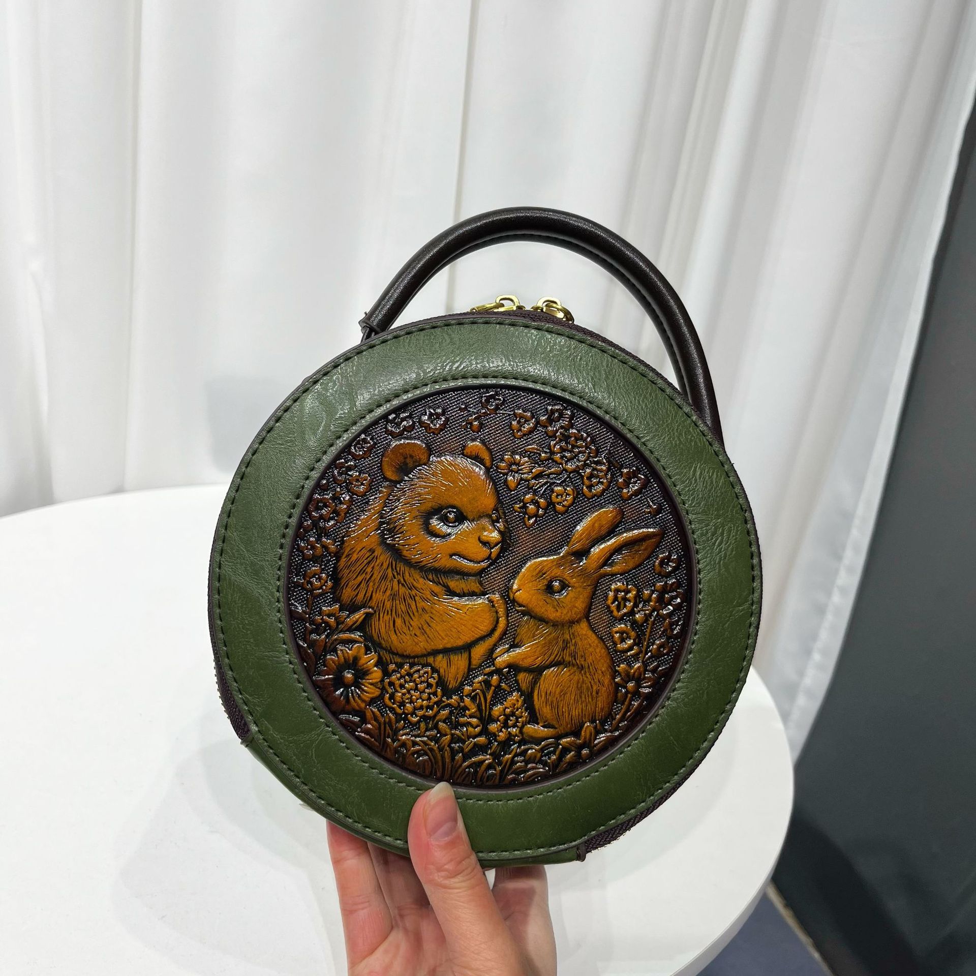 材质: 手工耐磨面料 箱包大小: 中 里料质地: 涤纶 箱包潮流款式: 单肩包 品牌: 其他 流行元素: 车缝线,压花 硬度: 中偏硬 颜色: 黑色,黄棕色,酒红色,咖色,绿色,米白色 风格: 国潮新风 货号: 9054#-圆皮雕玉兔熊猫 上市年份季节: 2026年春季 箱包形状: 横款方型 开盖方式: 拉链 包内部结构: 拉链暗袋,手机袋,夹层拉链袋 外袋种类: 内贴袋 有可授权的自有品牌: 否 有无夹层: 有 适用场景: 日常搭配 肩带根数: 单根 重量: 0.46 kg/个