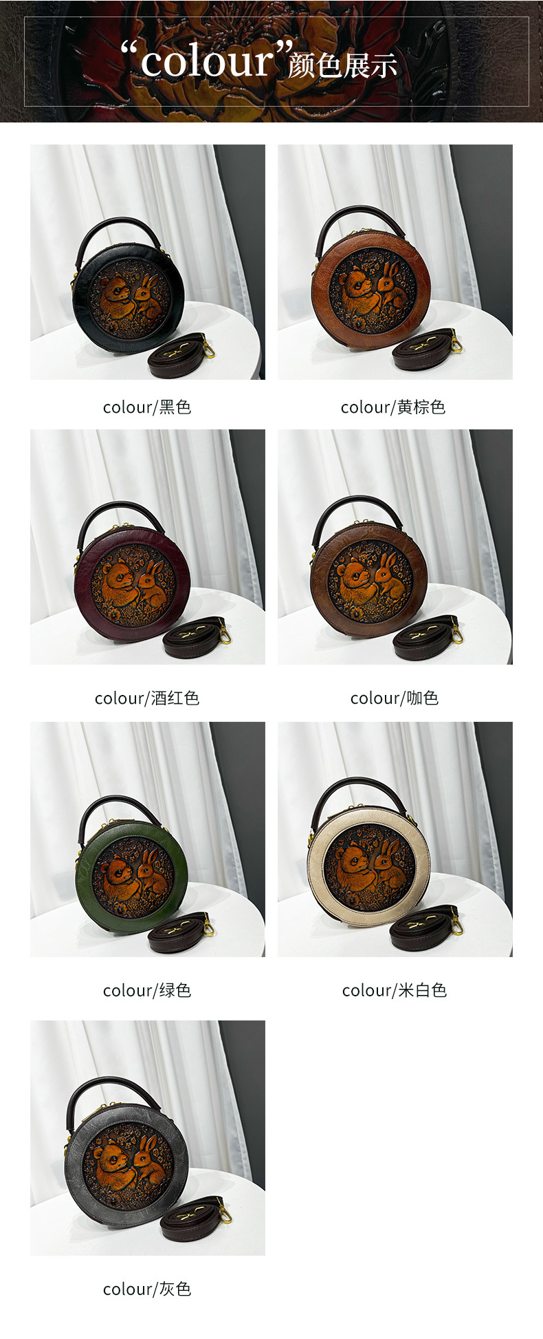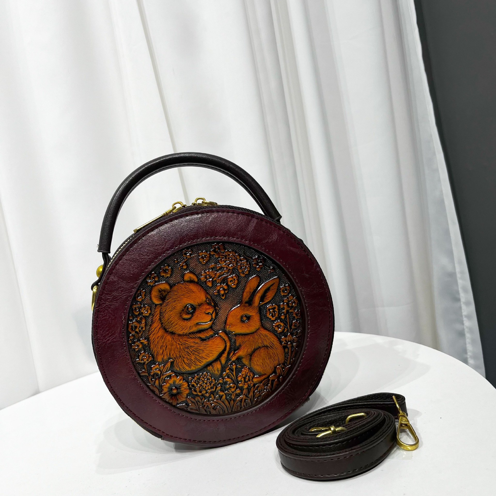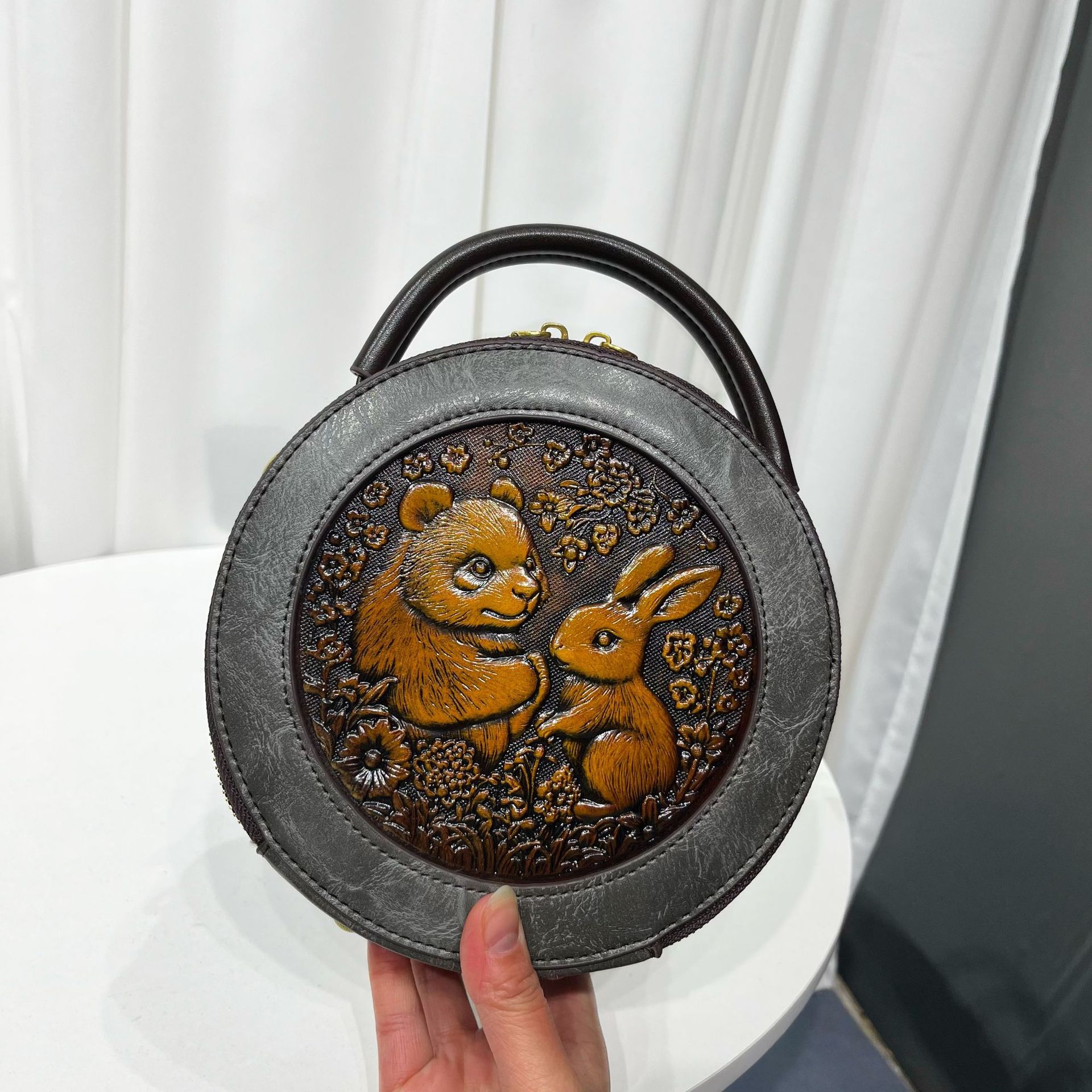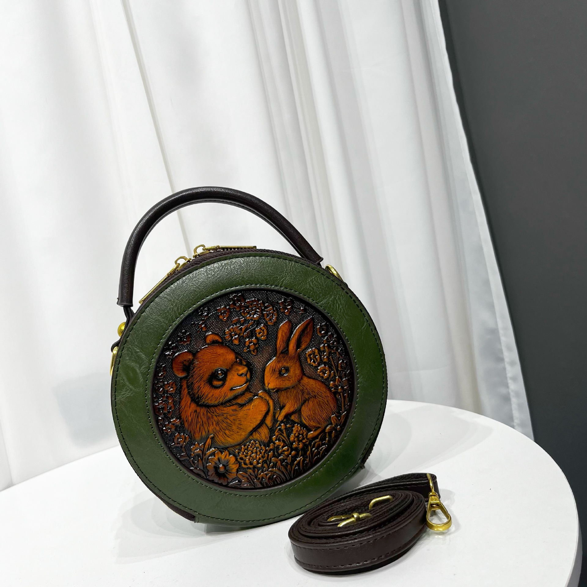 材质: 手工耐磨面料 箱包大小: 中 里料质地: 涤纶 箱包潮流款式: 单肩包 品牌: 其他 流行元素: 车缝线,压花 硬度: 中偏硬 颜色: 黑色,黄棕色,酒红色,咖色,绿色,米白色 风格: 国潮新风 货号: 9054#-圆皮雕玉兔熊猫 上市年份季节: 2026年春季 箱包形状: 横款方型 开盖方式: 拉链 包内部结构: 拉链暗袋,手机袋,夹层拉链袋 外袋种类: 内贴袋 有可授权的自有品牌: 否 有无夹层: 有 适用场景: 日常搭配 肩带根数: 单根 重量: 0.46 kg/个