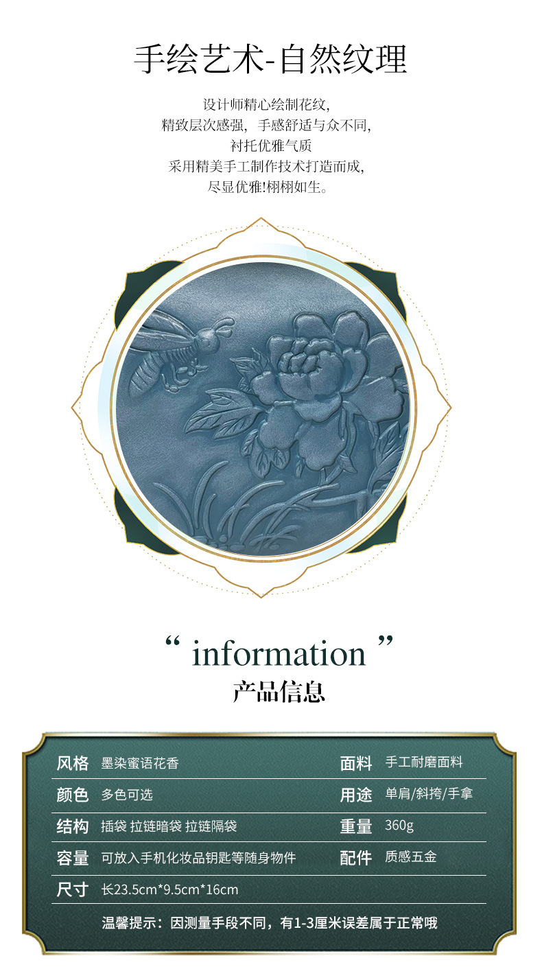 材质: 手工耐磨面料 箱包大小: 小 里料质地: 涤纶 箱包潮流款式: 单肩包 品牌: 其他 流行元素: 车缝线,压花 硬度: 中偏硬 颜色: 米白色,绿色,酒红色,蓝色,黄棕色,咖色 风格: 国潮新风 货号: 9009#墨染蜜语花香 上市年份季节: 2025年冬季 箱包形状: 横款方型 开盖方式: 拉链 包内部结构: 拉链暗袋,手机袋,夹层拉链袋 外袋种类: 内贴袋 有可授权的自有品牌: 否 有无夹层: 有 适用场景: 日常搭配 肩带根数: 单根 重量: 0.36 kg/个
