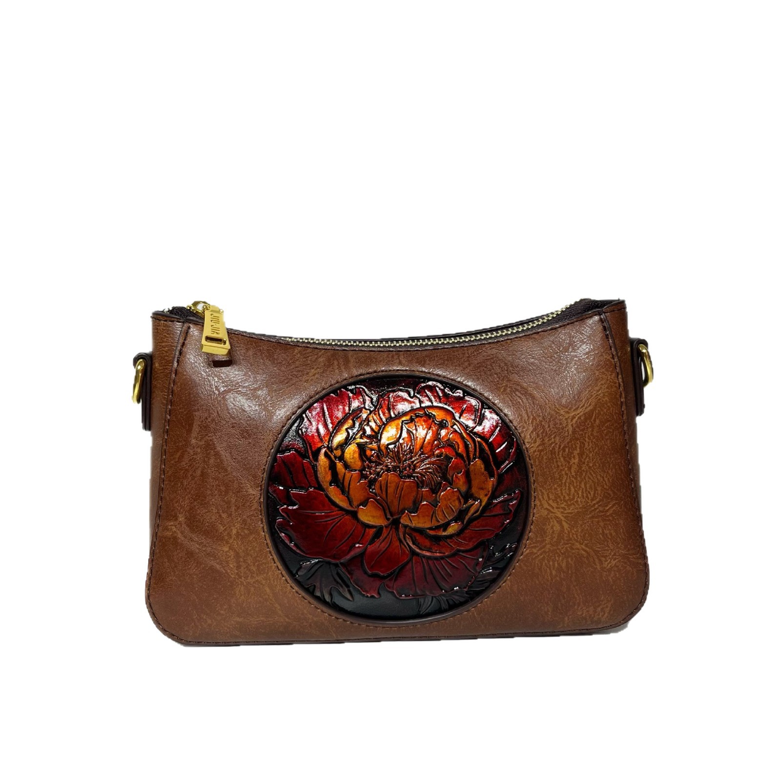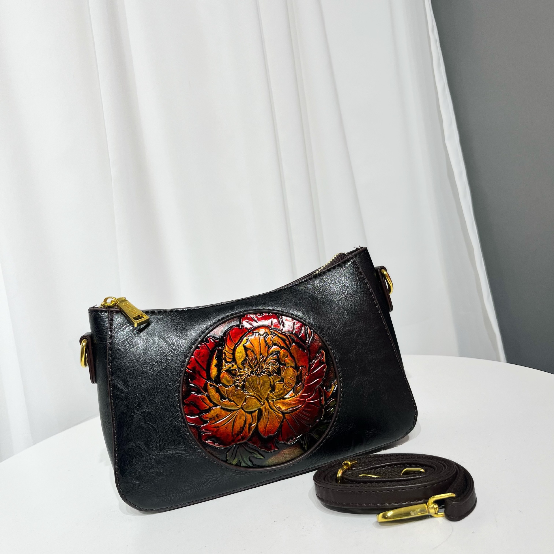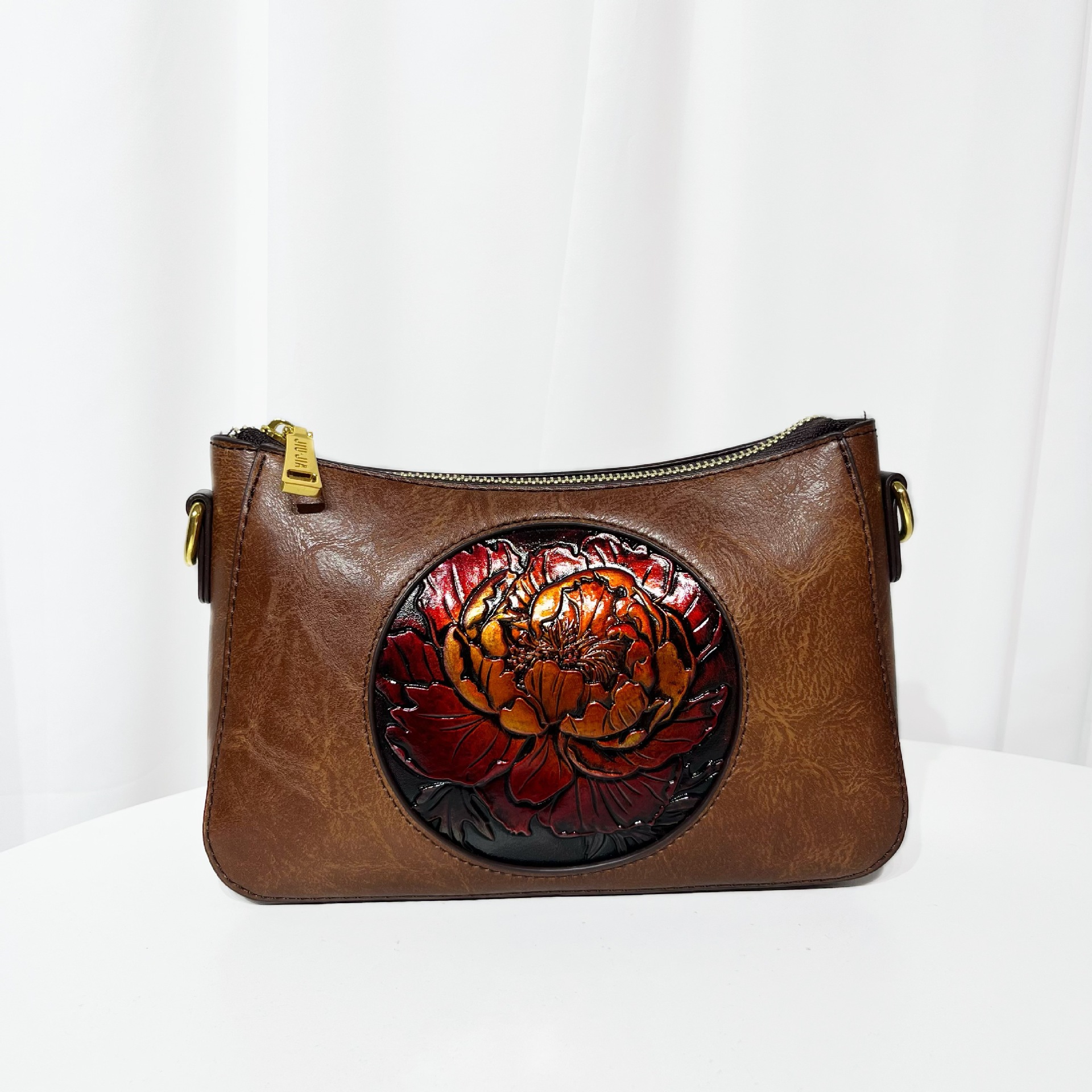 斜挎包皮雕荷花轻便质感民族风单肩包大容量质感软皮休闲包包女