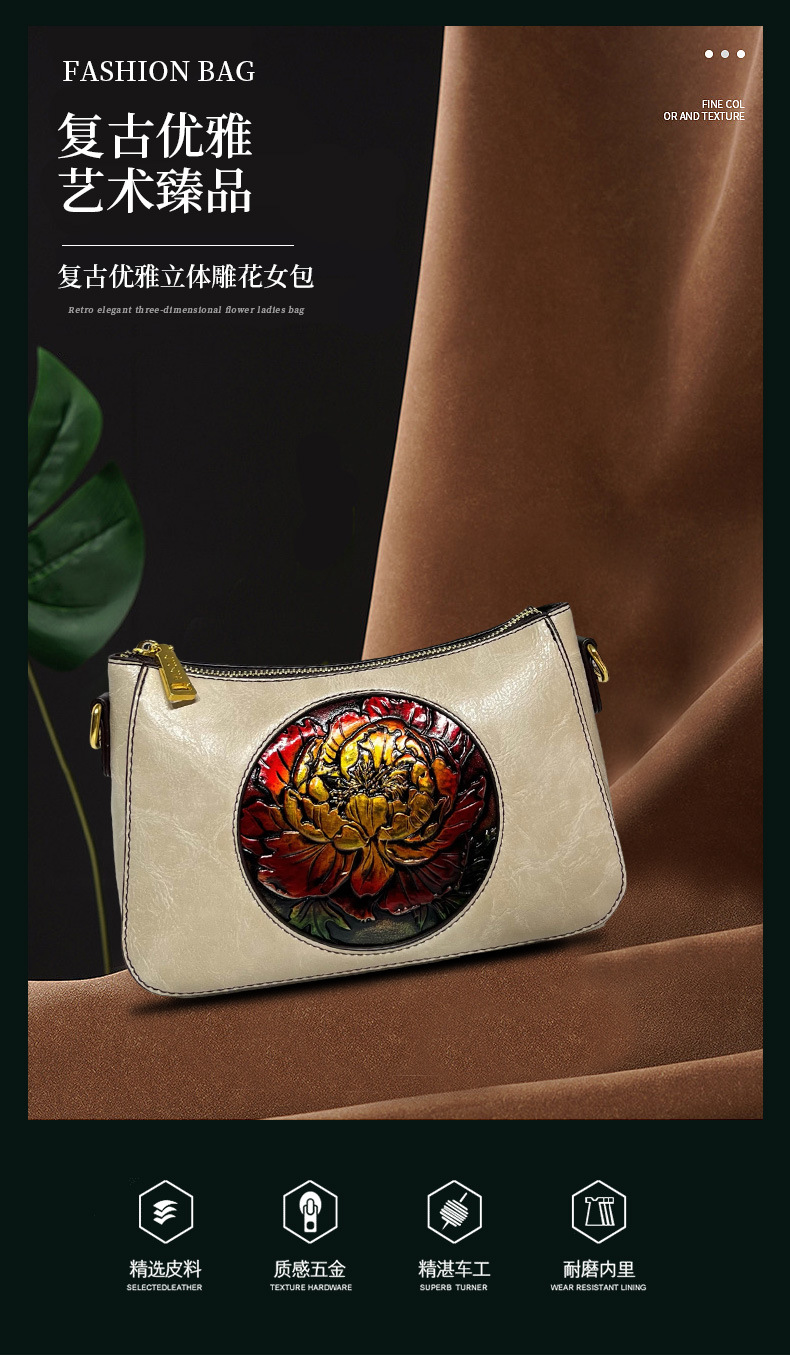 斜挎包皮雕荷花轻便质感民族风单肩包大容量质感软皮休闲包包女 投诉