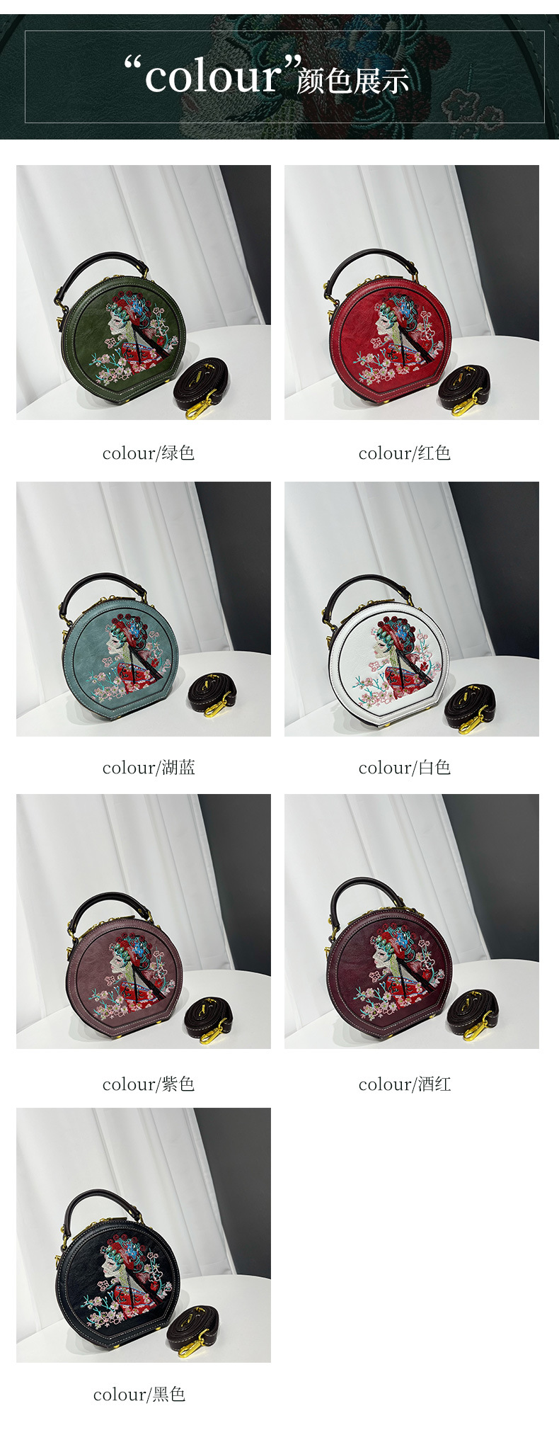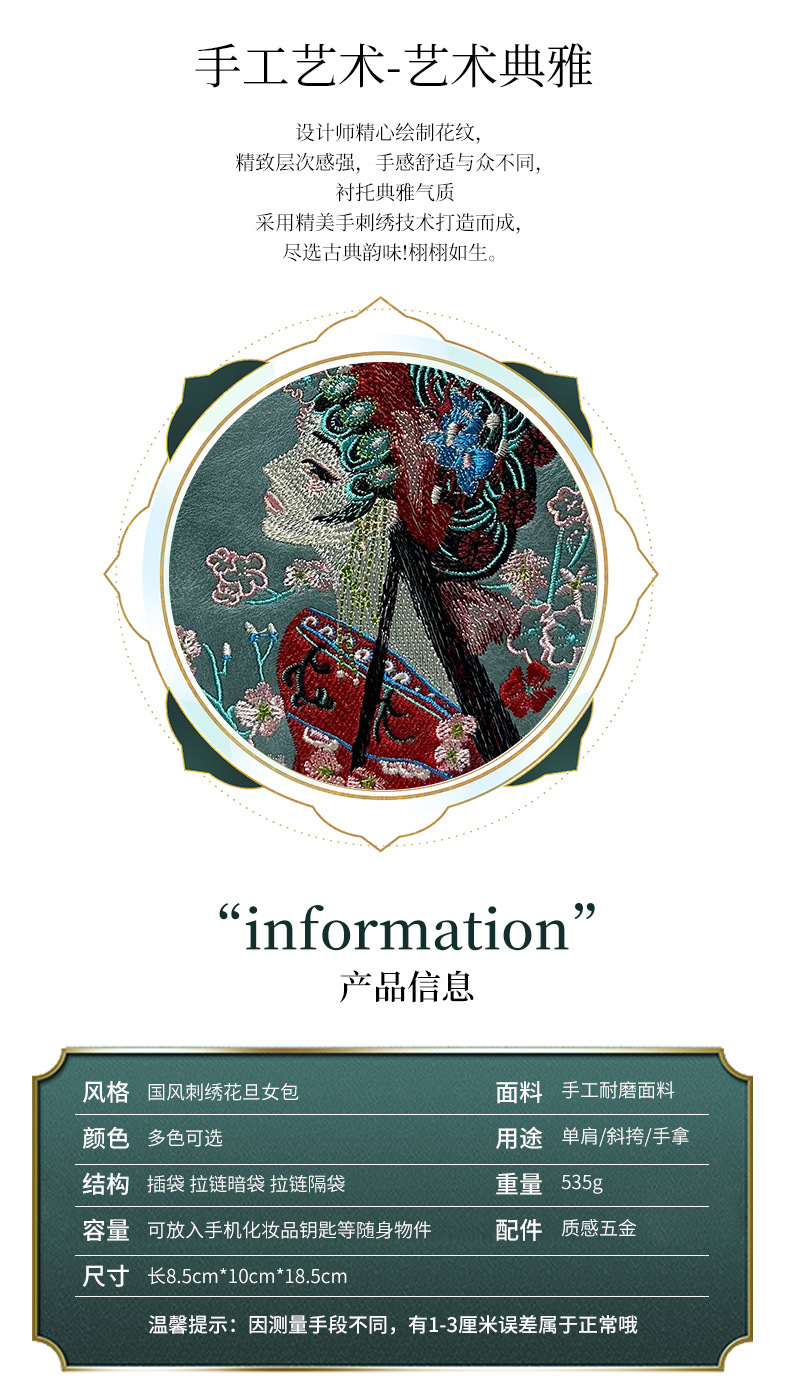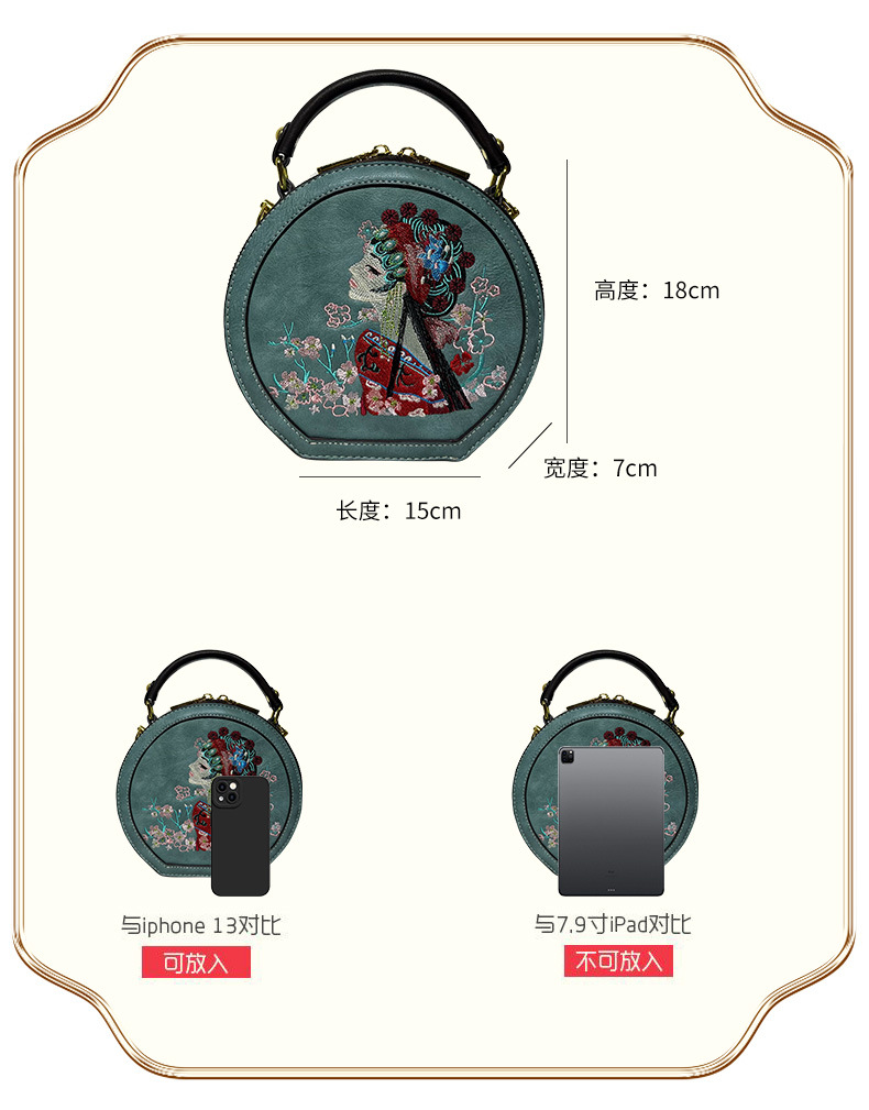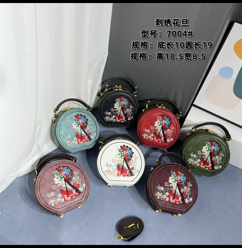 材质: 手工耐磨面料 箱包潮流款式: 小圆包 箱包大小: 小 流行元素: 刺绣,花朵,车缝线 开盖方式: 拉链 里料质地: 涤纶 品牌: 其他 颜色: 绿色,红色,湖蓝,白色,紫色,酒红,黑色 风格: 国潮新风 货号: 7004#刺绣花旦 上市年份季节: 2025夏季 箱包形状: 圆形 包内部结构: 拉链暗袋,手机袋,夹层拉链袋 硬度: 软 外袋种类: 内贴袋 有可授权的自有品牌: 否 有无夹层: 无 肩带根数: 单根 适用场景: 日常搭配 重量: 0.535 kg/个