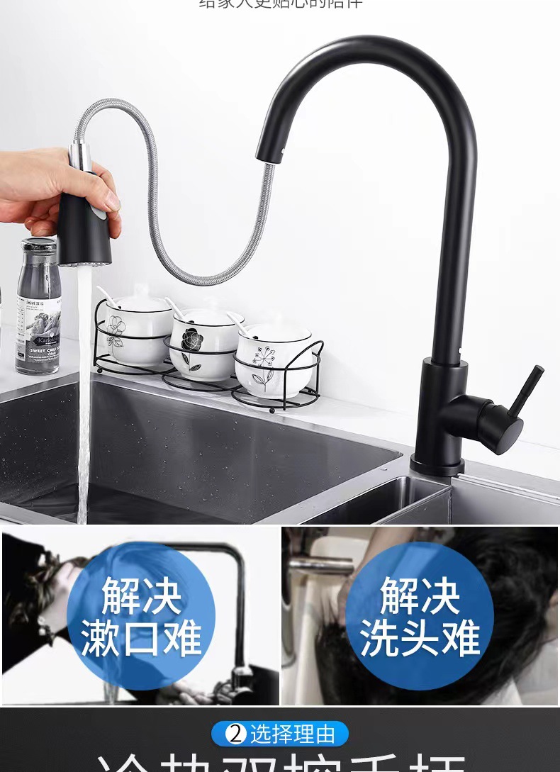 开平304不锈钢厨房抽拉式冷热水龙头洗菜盆水槽防溅可伸缩水龙头
