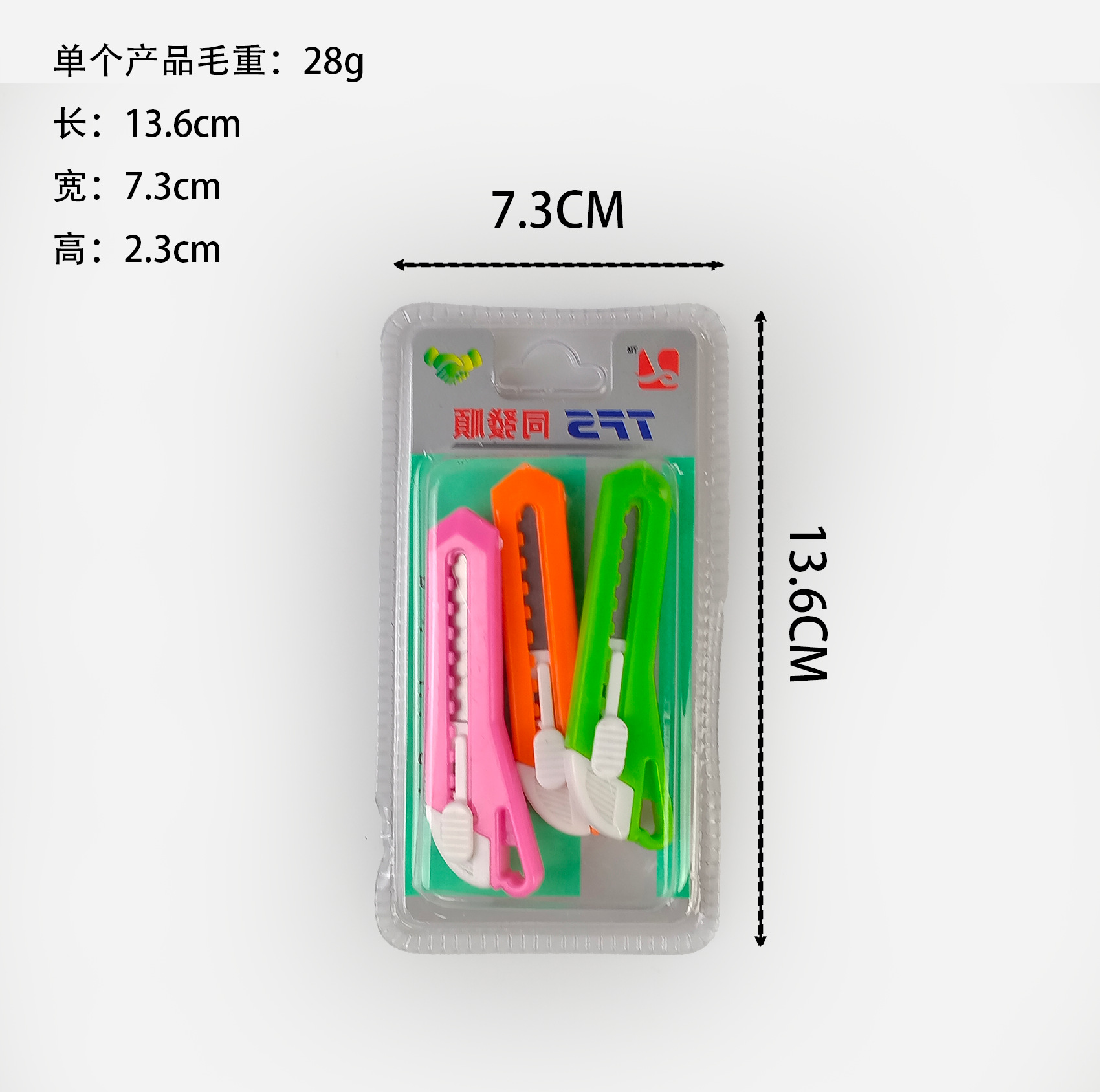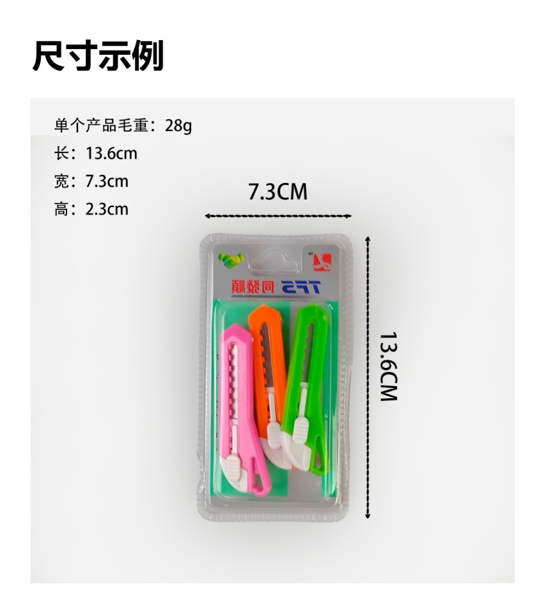 品牌: 其他 材质: 塑料 刀片(厚x宽x长): 0.1mm 全长: 7.8cm 净重: 8g左右 货号: E0081 型号: E0081 3个美工刀 是否进口: 否 规格: E0081 3个美工刀 主要下游平台: ebay,亚马逊,wish,速卖通,独立 主要销售地区: 非洲,欧洲,南美,东南亚,北美,东北亚, 有可授权的自有品牌: 否 是否跨境出口专供货源: 是 是否属于礼品: 否 是否专利货源: 否 重量: 0.2 kg/件