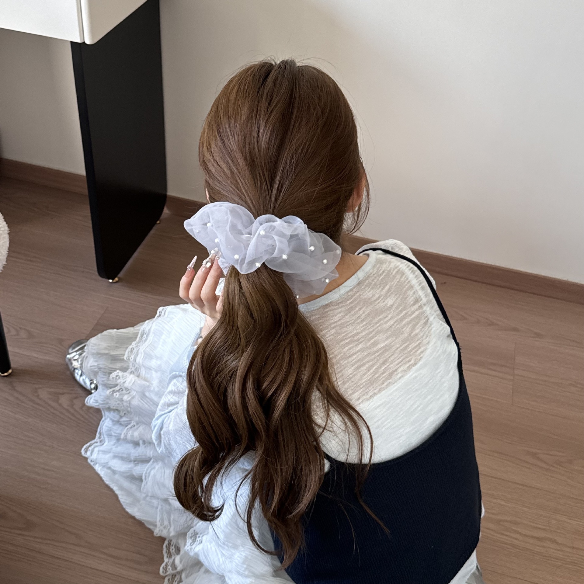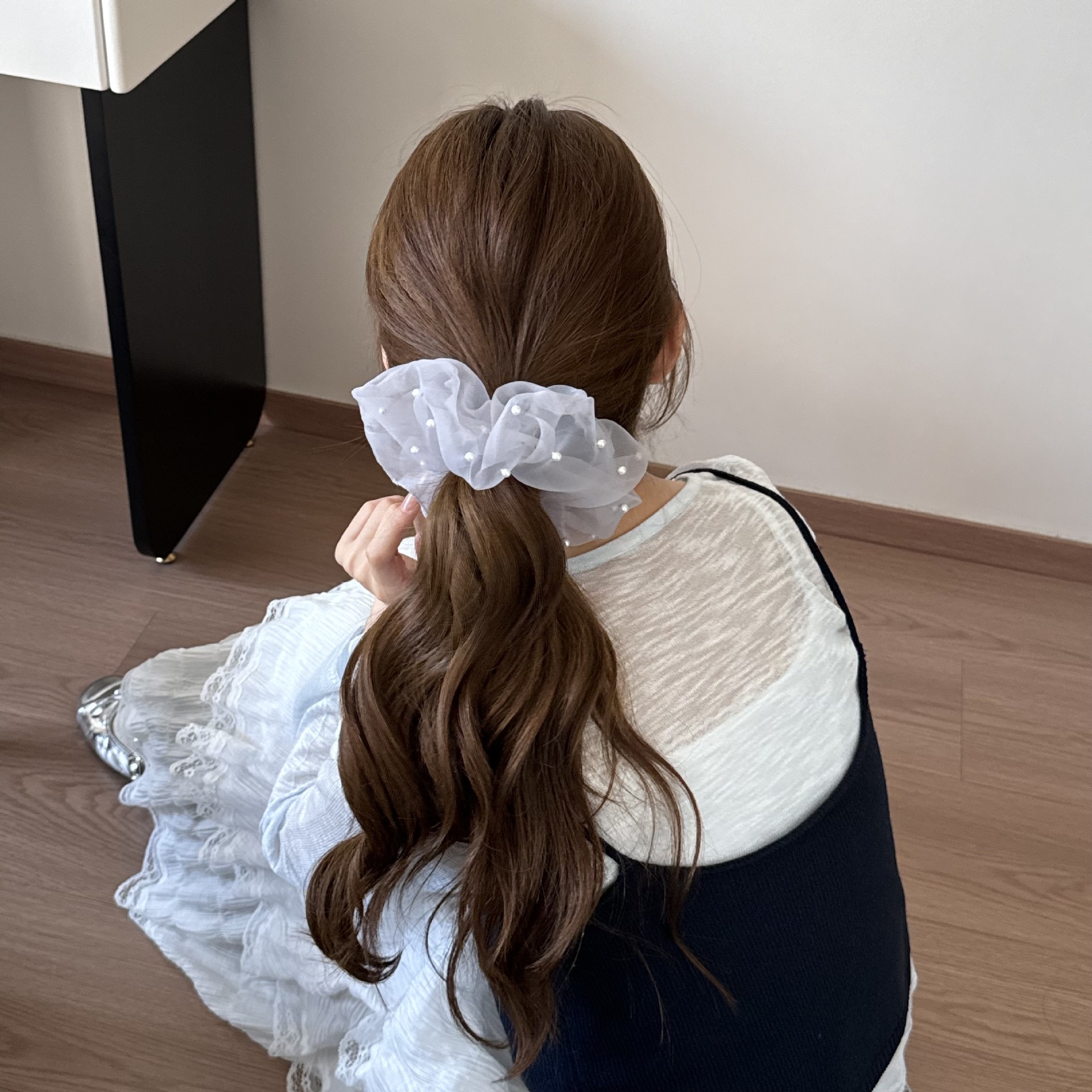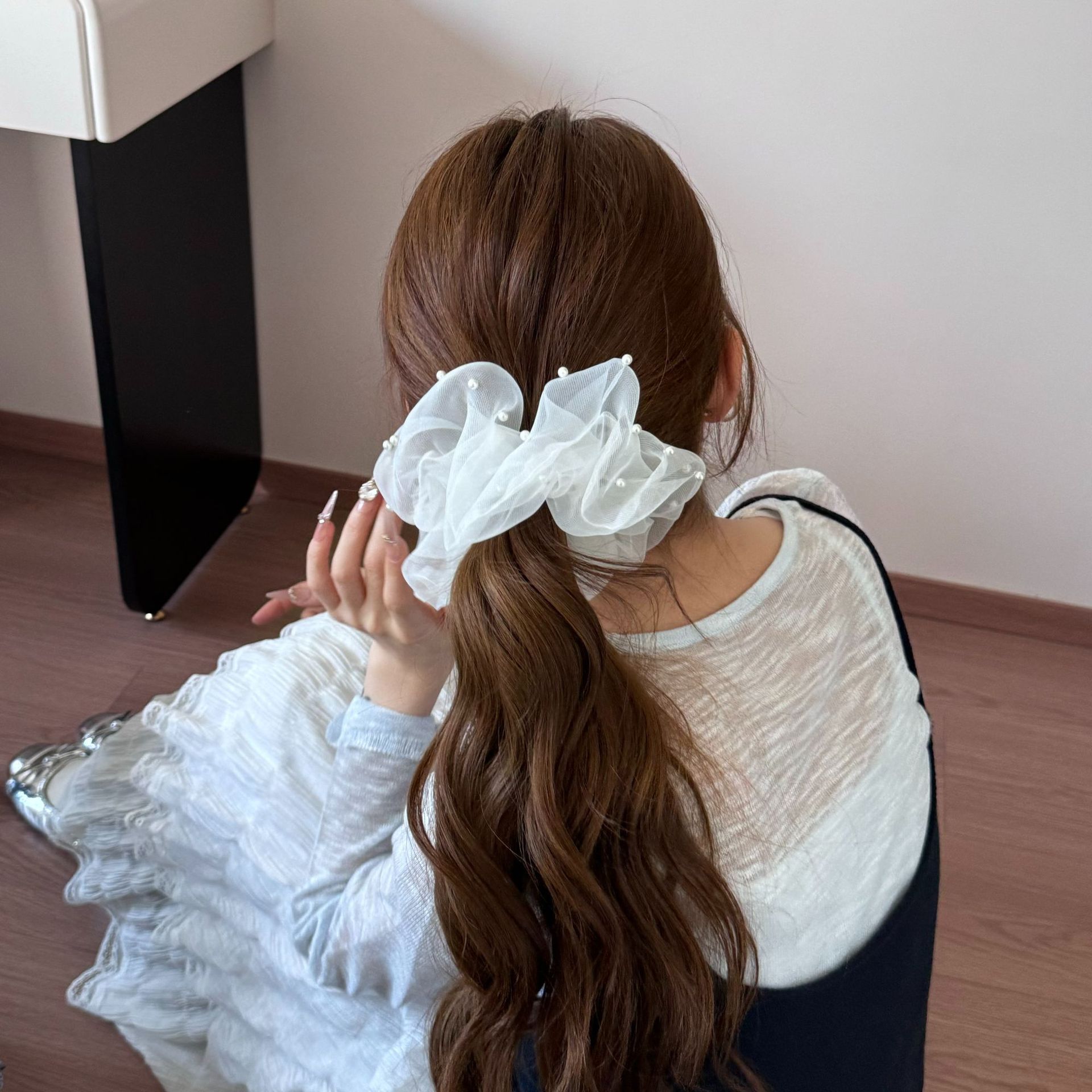 新款蕾丝珍珠裙摆花边发圈女甜美网纱蝴蝶结发绳高级感百搭发饰品