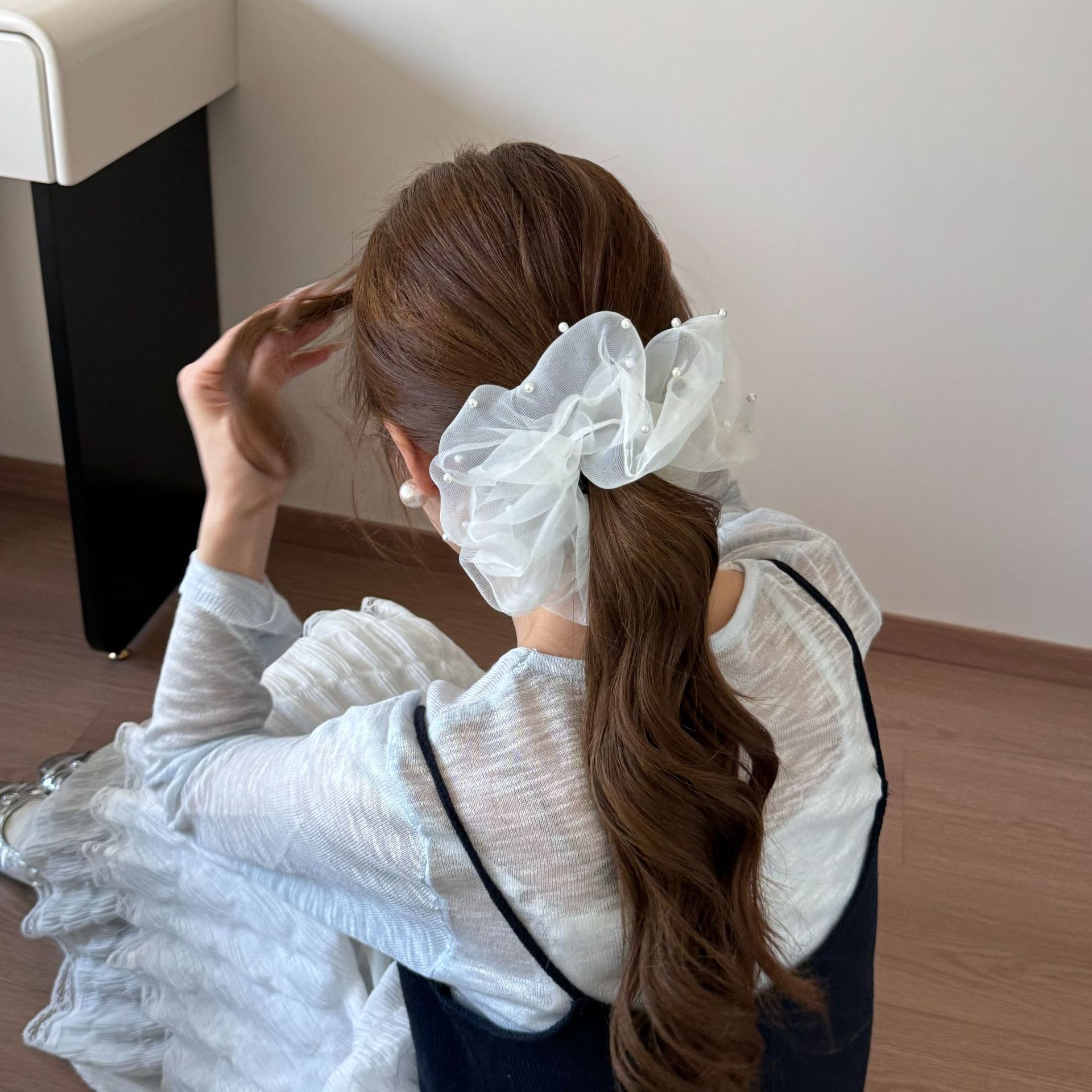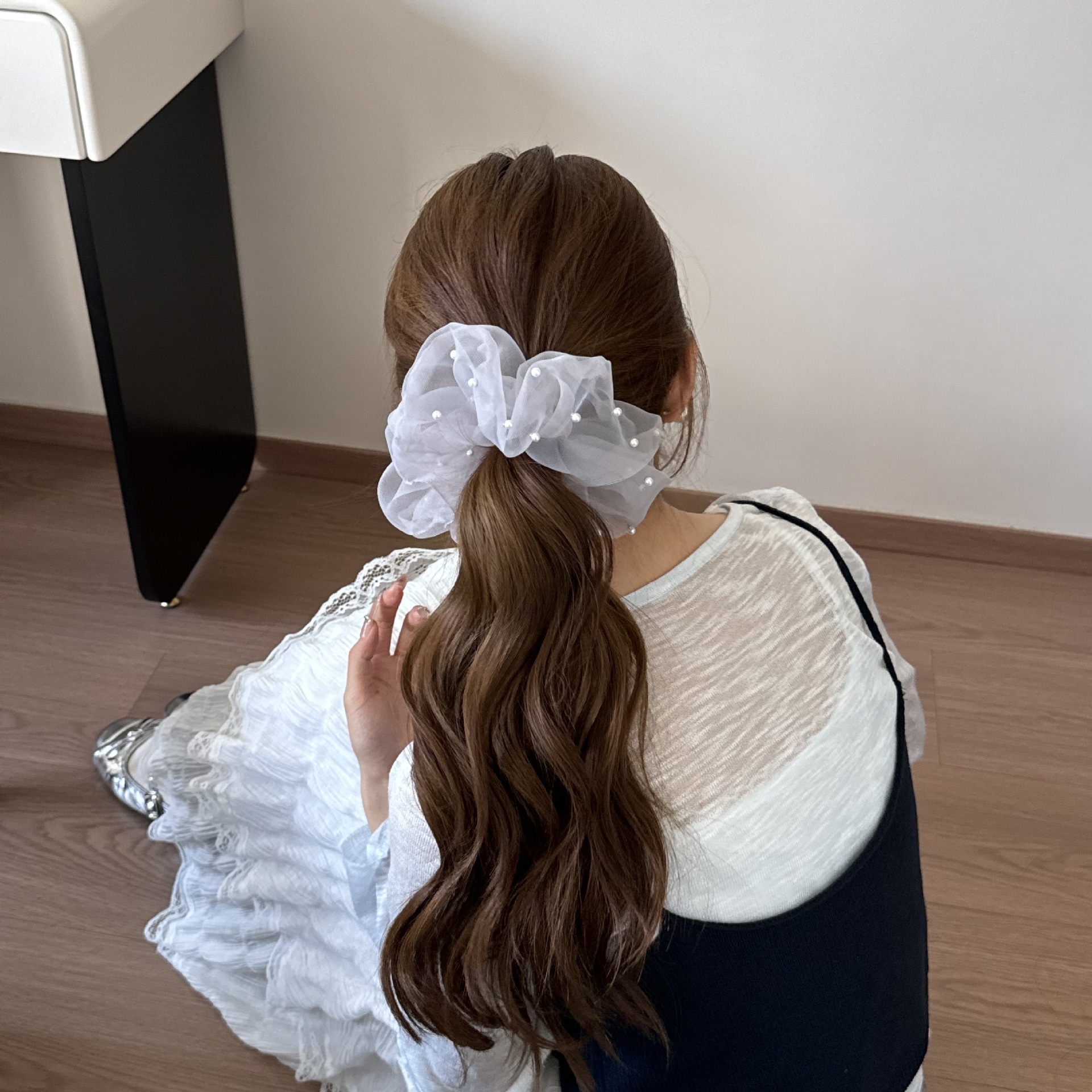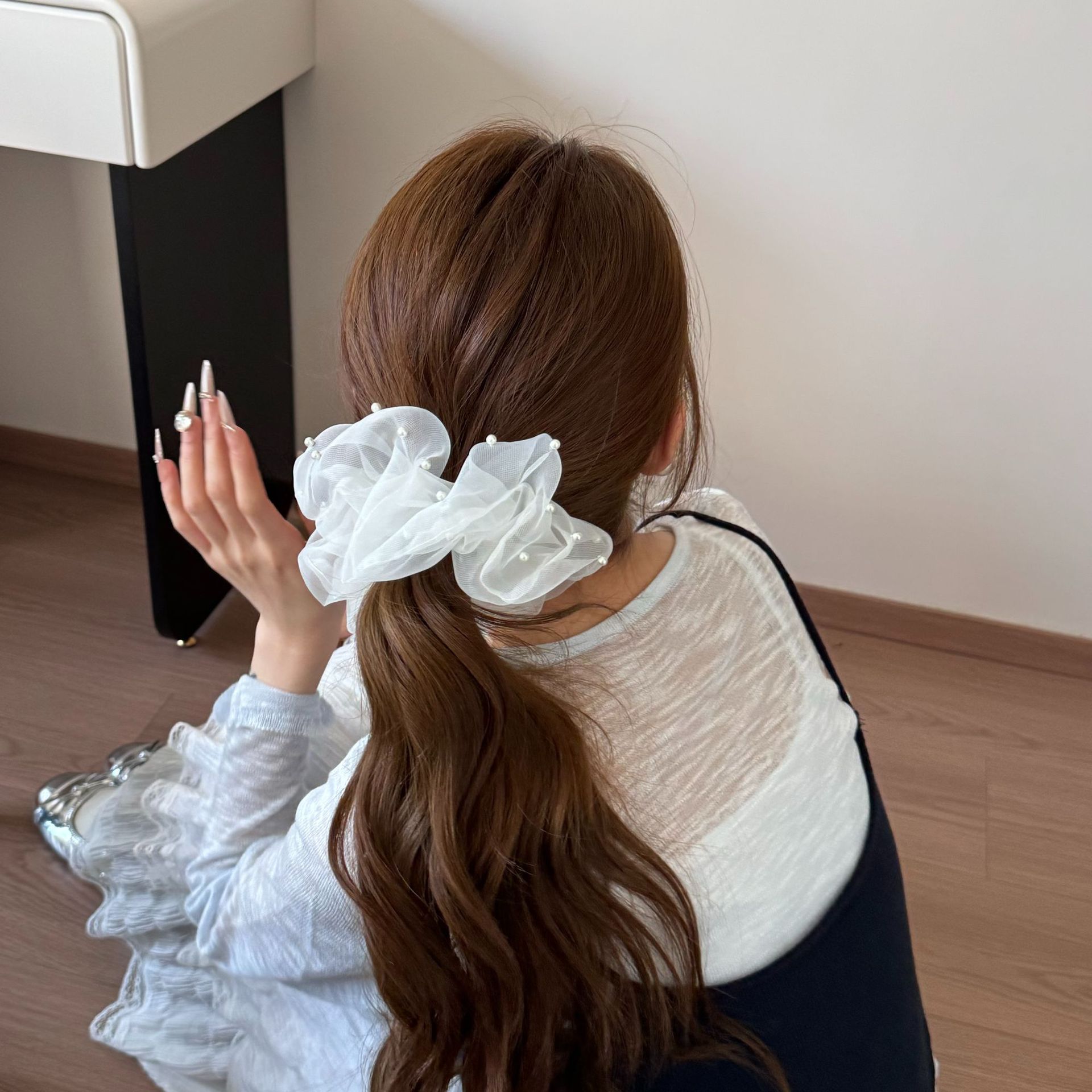 新款蕾丝珍珠裙摆花边发圈女甜美网纱蝴蝶结发绳高级感百搭发饰品