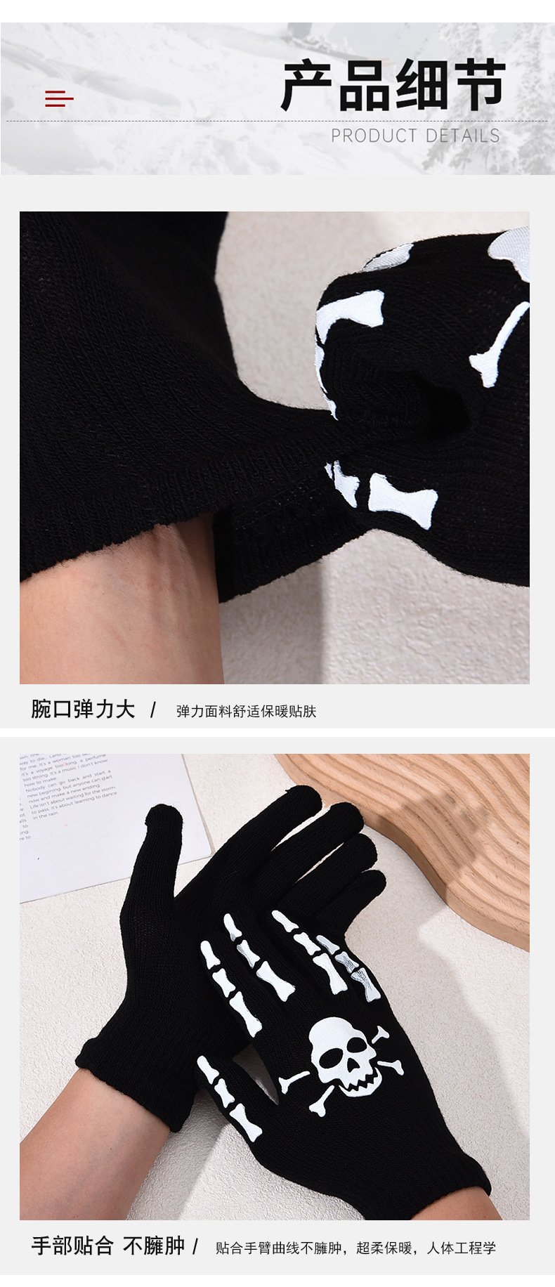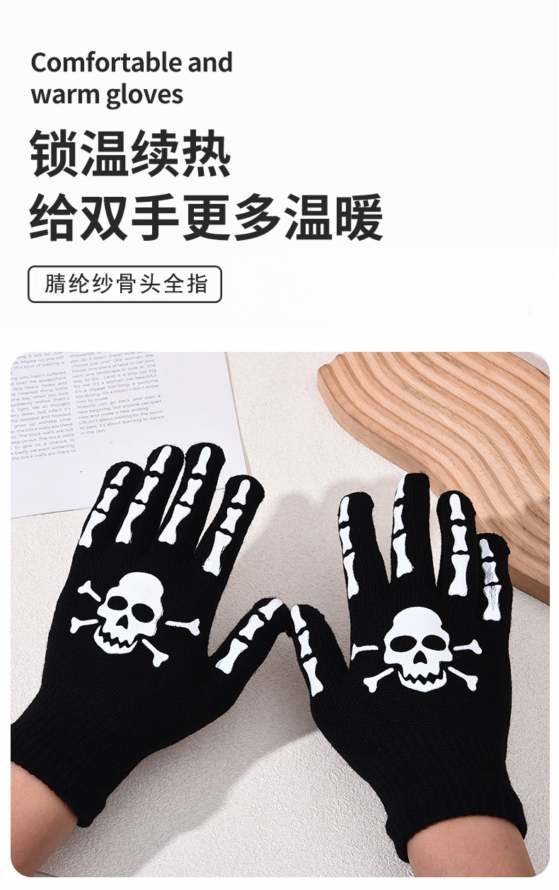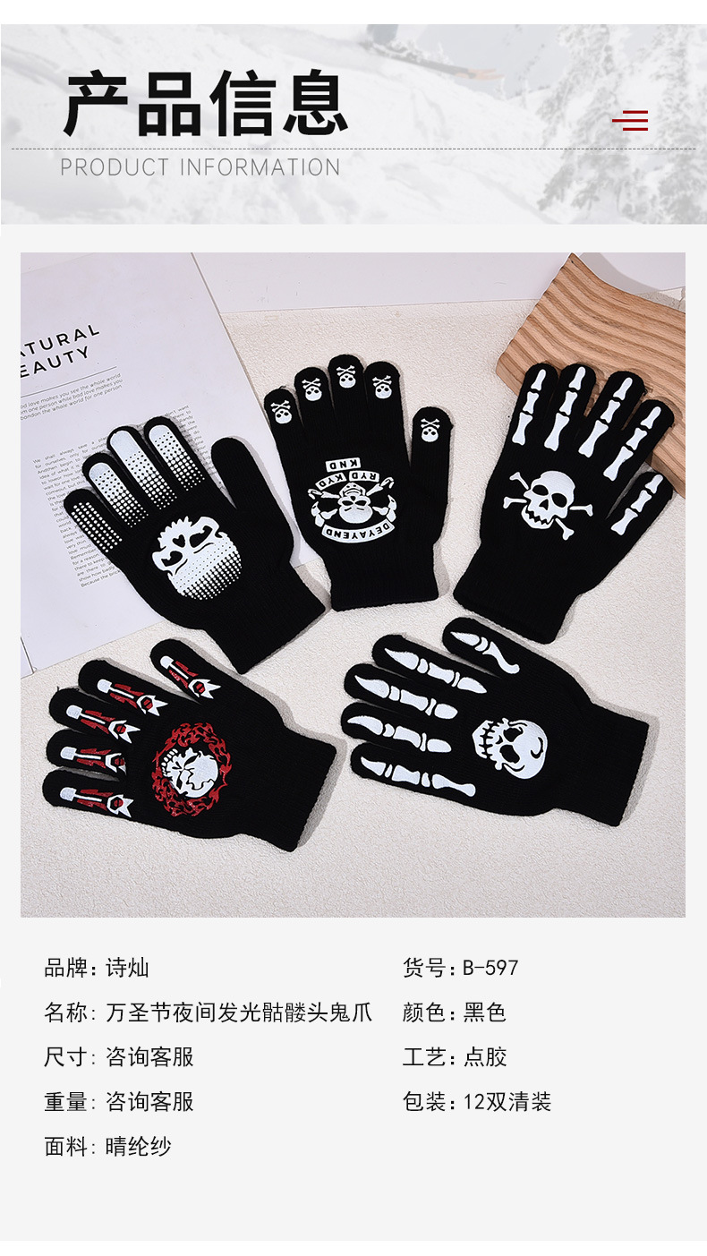 功能: 保暖 款式: 分指手套 面料名称: 腈纶纱 产品类别: 保暖手套 品牌: 诗灿 货号: B-361 颜色: 款式1,款式2,款式3,款式4,款式5 尺码: 夜光款,普通款 主要下游平台: 淘宝,亚马逊,天猫,拼多多,抖音 有可授权的自有品牌: 是 是否跨境出口专供货源: 是 适合季节: 冬季 上市年份/季节: 2024年秋季 产地: 义乌 风格: 原创设计 适用场景: 运动,滑雪,越野,沙滩,逛街 厚度等级: 中等 1: 夜间发光夜光骷髅头鬼爪手套 风格分类: 原创设计 处理工艺: 23563560708 重量: 0.033 kg/双