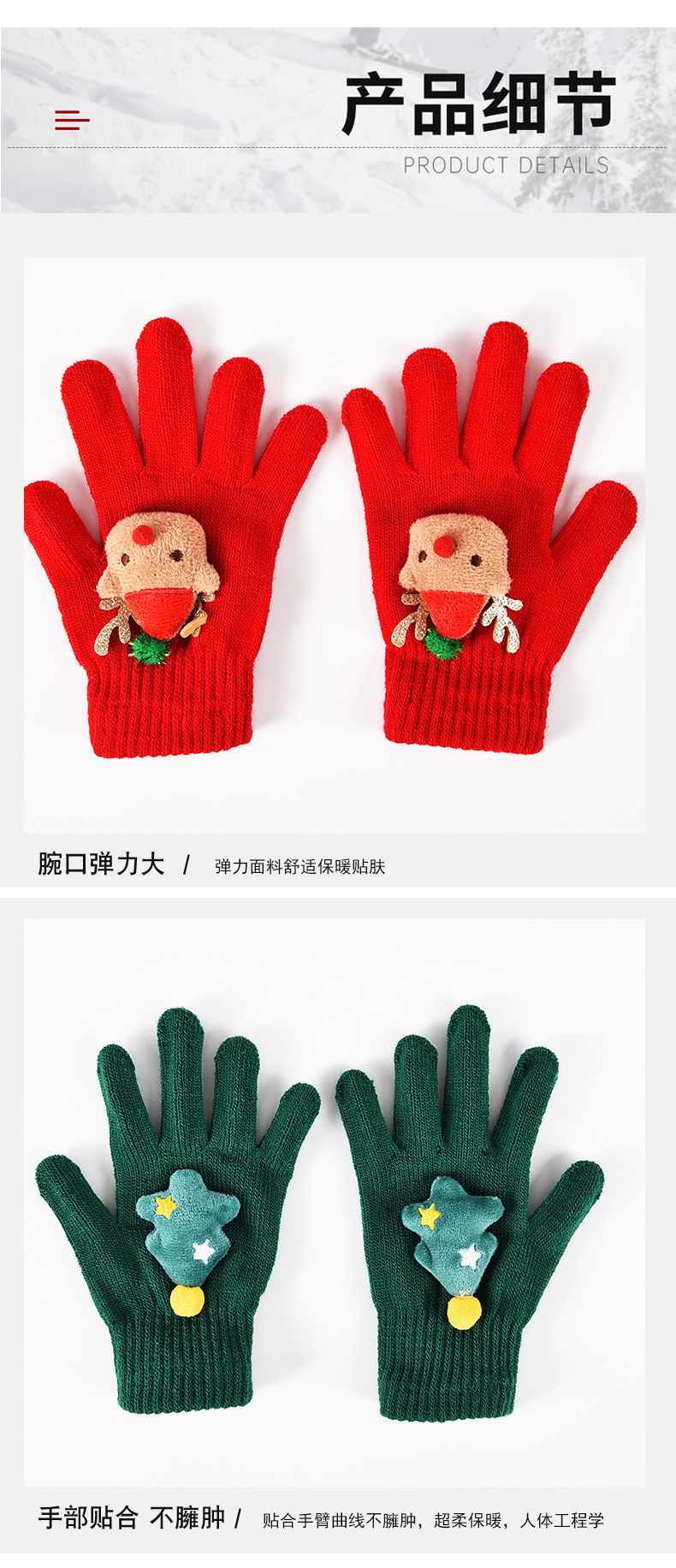 功能: 保暖 材质: 晴纶纱 用途分类: 服饰手套 品牌: 诗灿 加工方式: 针织 适用年龄: 5岁-12岁 款式: 分指手套 适用性别: 中性/男女均可 货源类别: 现货 图案: 卡通 是否外贸: 是 是否库存: 否 货号: A-015 颜色: 鲜红,圣诞绿 尺码: 均码 适合季节: 冬季 加工定制: 是 是否跨境出口专供货源: 是 主要下游平台: 淘宝,京东,亚马逊,快手,拼多多,抖音 主要销售地区: 欧洲,东南亚,北美 重量: 0.035 kg/双