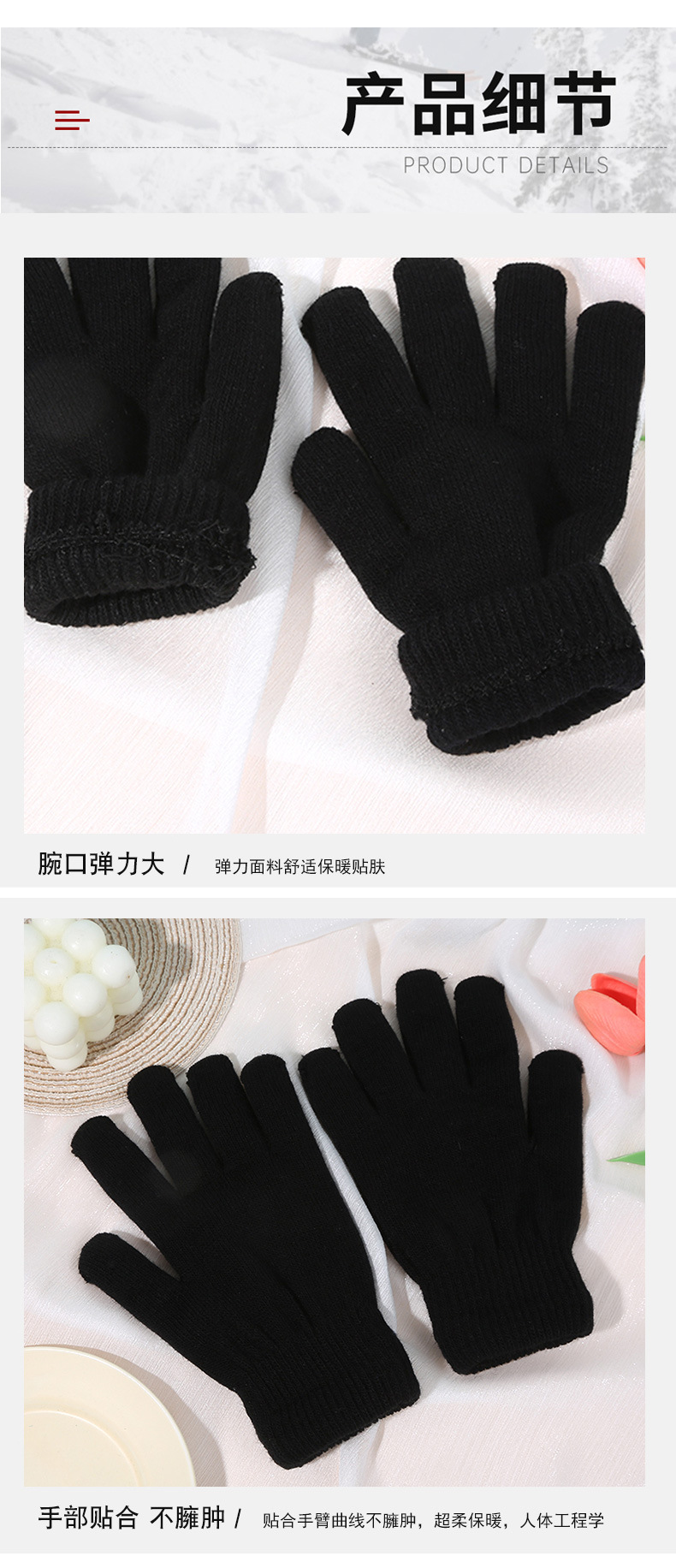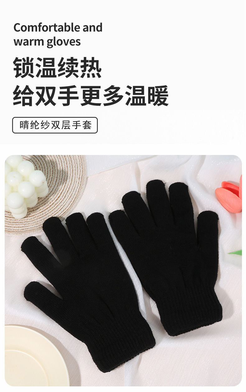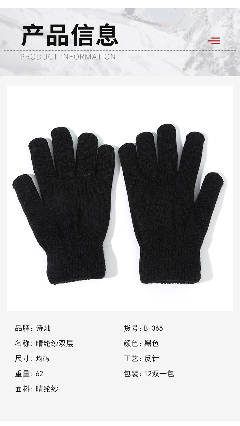 功能: 保暖 款式: 分指手套 品牌: 诗灿 货源类别: 现货 材质: 腈纶纱 用途分类: 日用手套 适用性别: 中性/男女均可 加工方式: 提花 图案: 纯色 是否外贸: 否 货号: B-365定制 颜色: 黑色 尺码: 均码 主要下游平台: 淘宝,亚马逊,天猫,拼多多,抖音 主要销售地区: 非洲,欧洲,南美,东南亚,北美,东北亚, 有可授权的自有品牌: 是 是否跨境出口专供货源: 是 适合季节: 冬季 加工定制: 是 适用对象: 通用 重量: 0.06 kg/双
