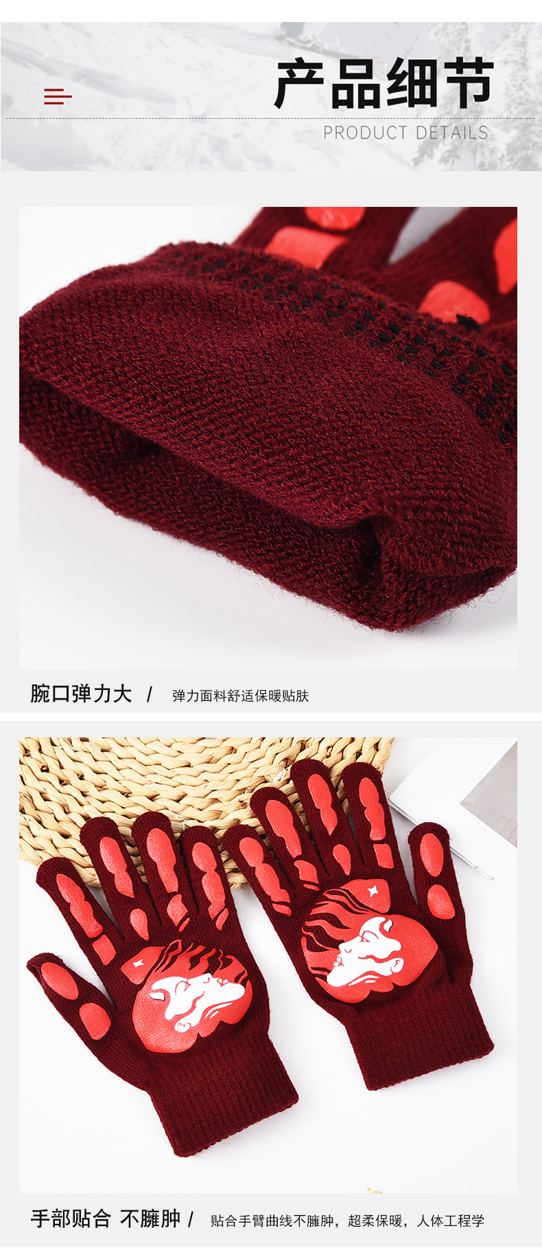 功能: 保暖 款式: 分指手套 面料名称: 晴纶纱 产品类别: 保暖手套 品牌: 诗灿 货号: A-08 颜色: 枣红 尺码: 均码 主要下游平台: 淘宝,亚马逊,快手,拼多多,抖音 有可授权的自有品牌: 否 是否跨境出口专供货源: 是 适合季节: 冬季 上市年份/季节: 2024年秋季 产地: 金华 风格: 简约 风格分类: 时尚通勤 处理工艺: 提花 包装: 12双清装 主要销售地区: 欧洲,东南亚,北美 流行元素分类: 生活用品 重量: 0.038 kg/双