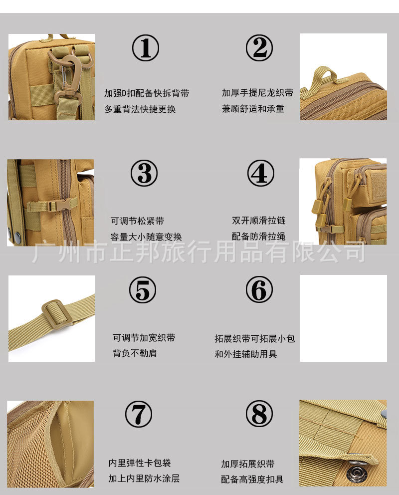 材质: 牛津布 功能: 耐磨,扩容 品牌: 无 里料质地: 牛津布 适用性别: 中性/男女均可 适用场景: 户外运动 有可授权的自有品牌: 否 货号: 095 上市年份季节: 2019年春季 颜色: 黑色,卡其色,军绿色,CP色 风格: 休闲旅行 图案: 纯色