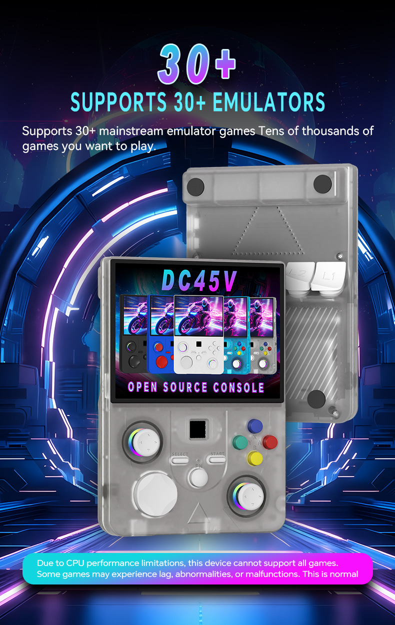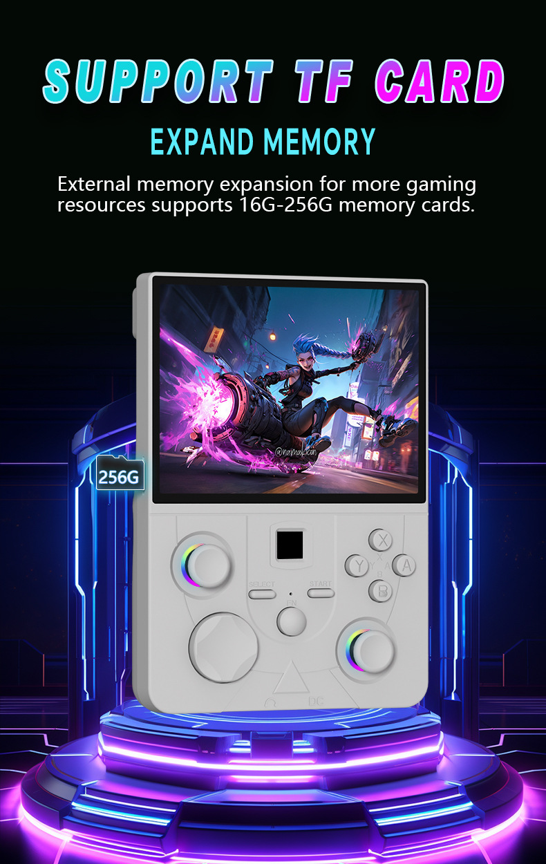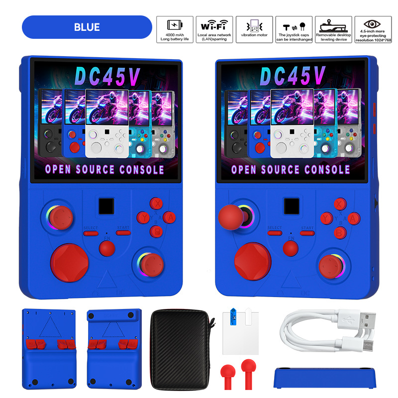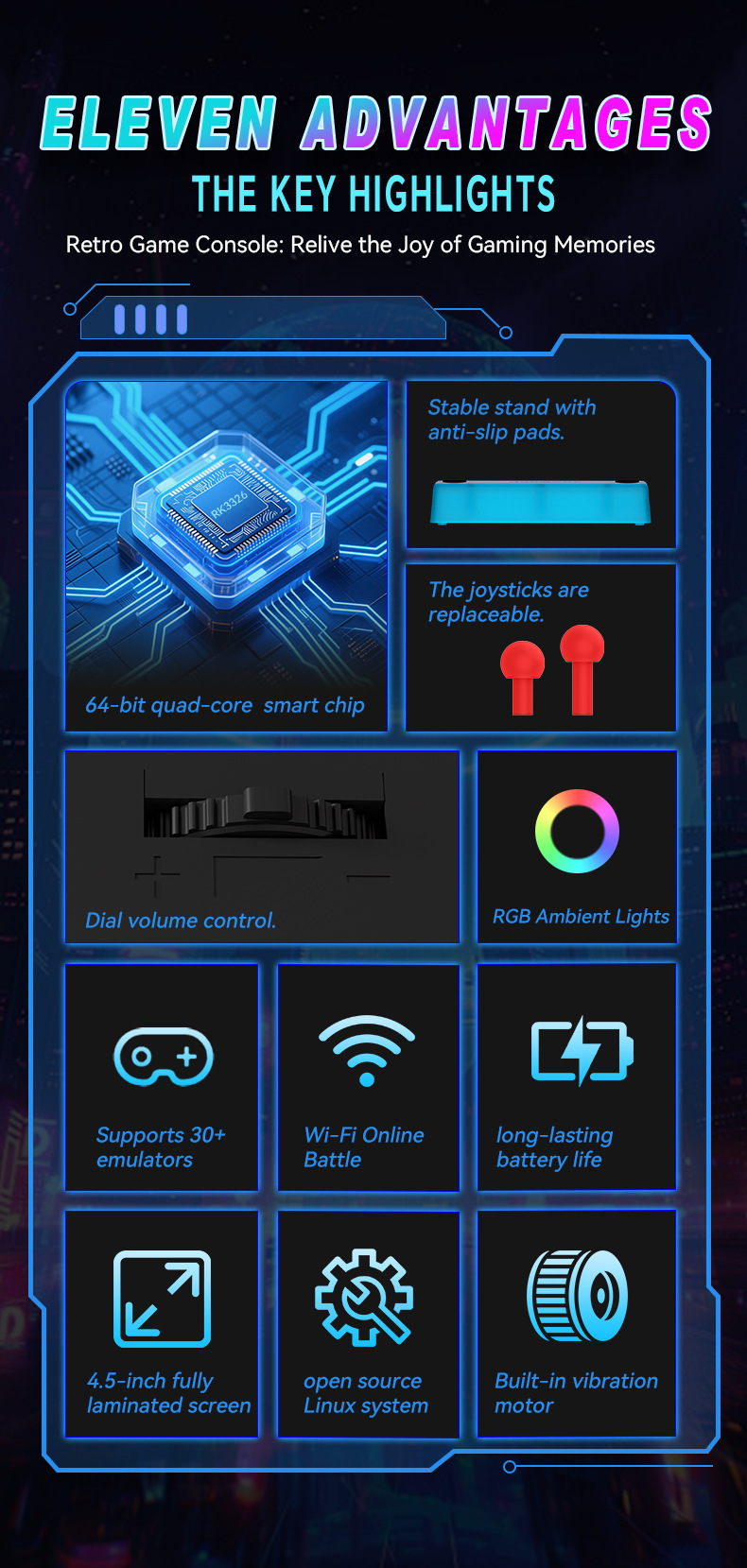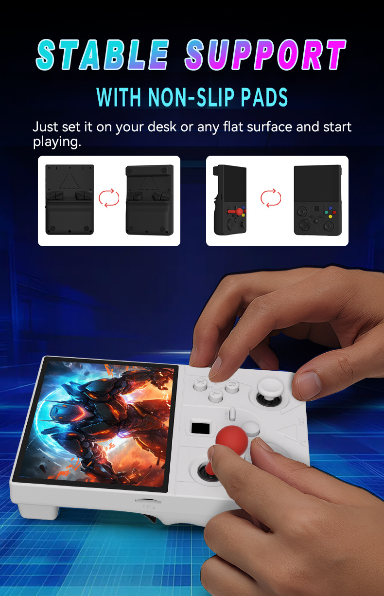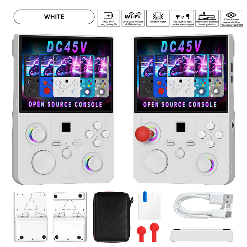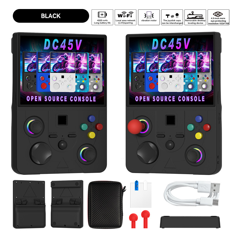 开源Linux系统 系统在主板上无插卡可以开机,系统带说明书,支持8-64位游戏 有战神可玩 可替换街机摇杆,可拆卸桌面平稳支架,支持外接手柄,自带IWFI可联机对打 振动马达 人体工学握把 腔体喇叭,分离式ABXY键,摇杆炫彩氛围灯,附赠屏保护膜,收纳包。