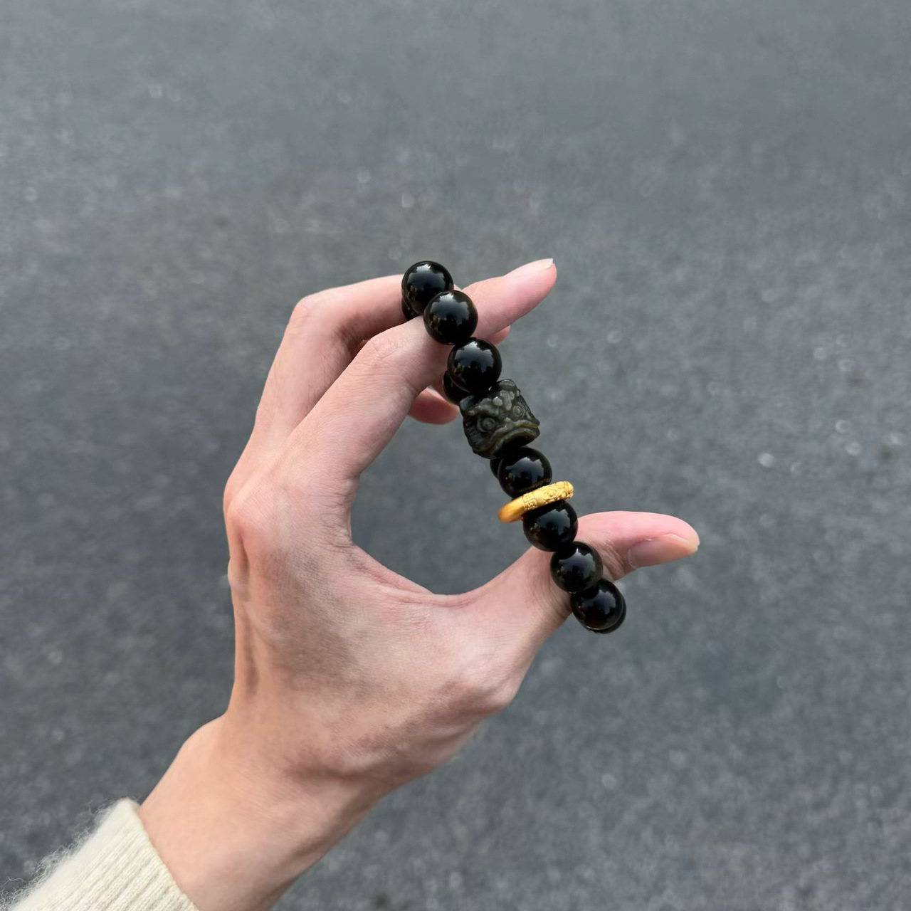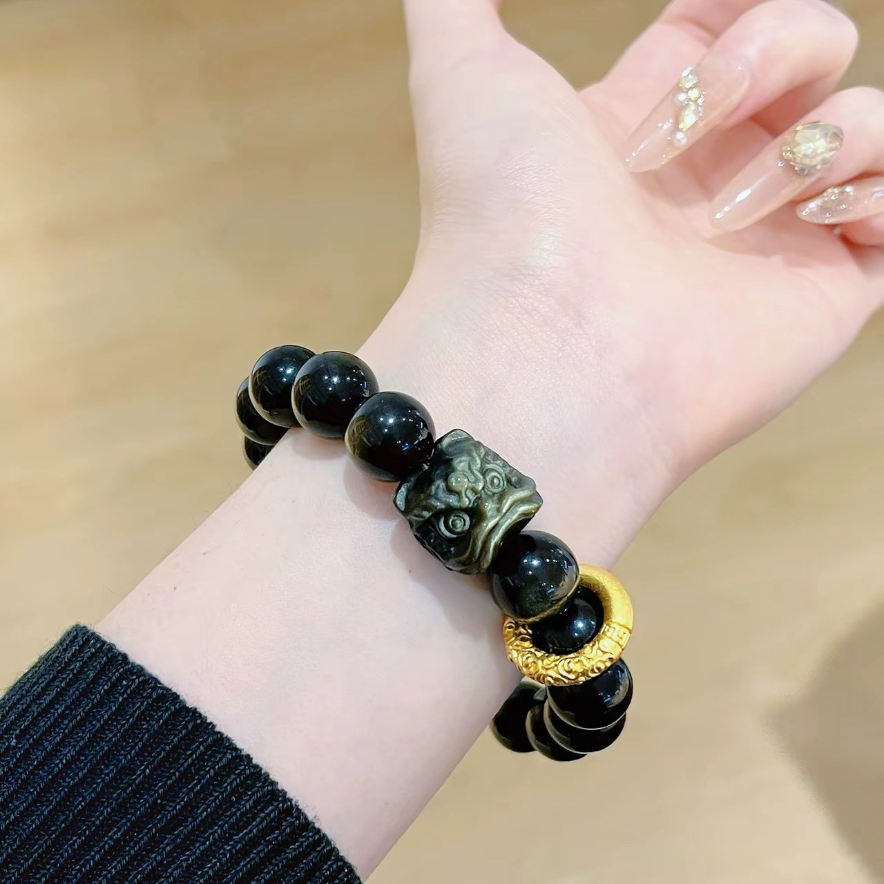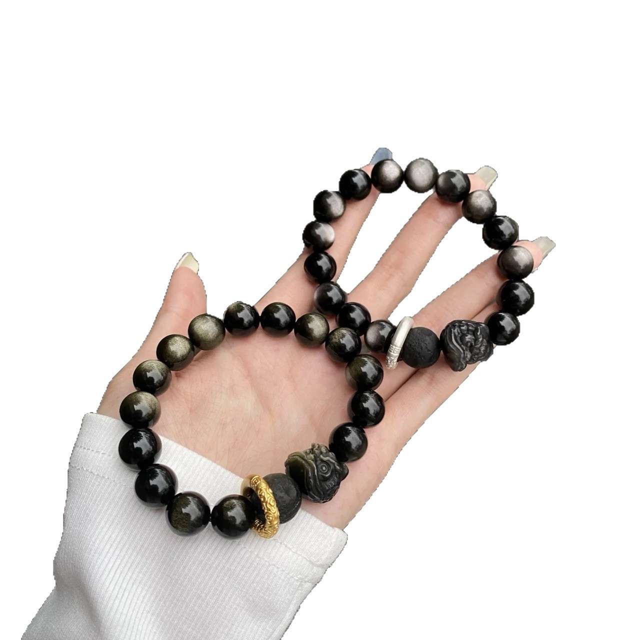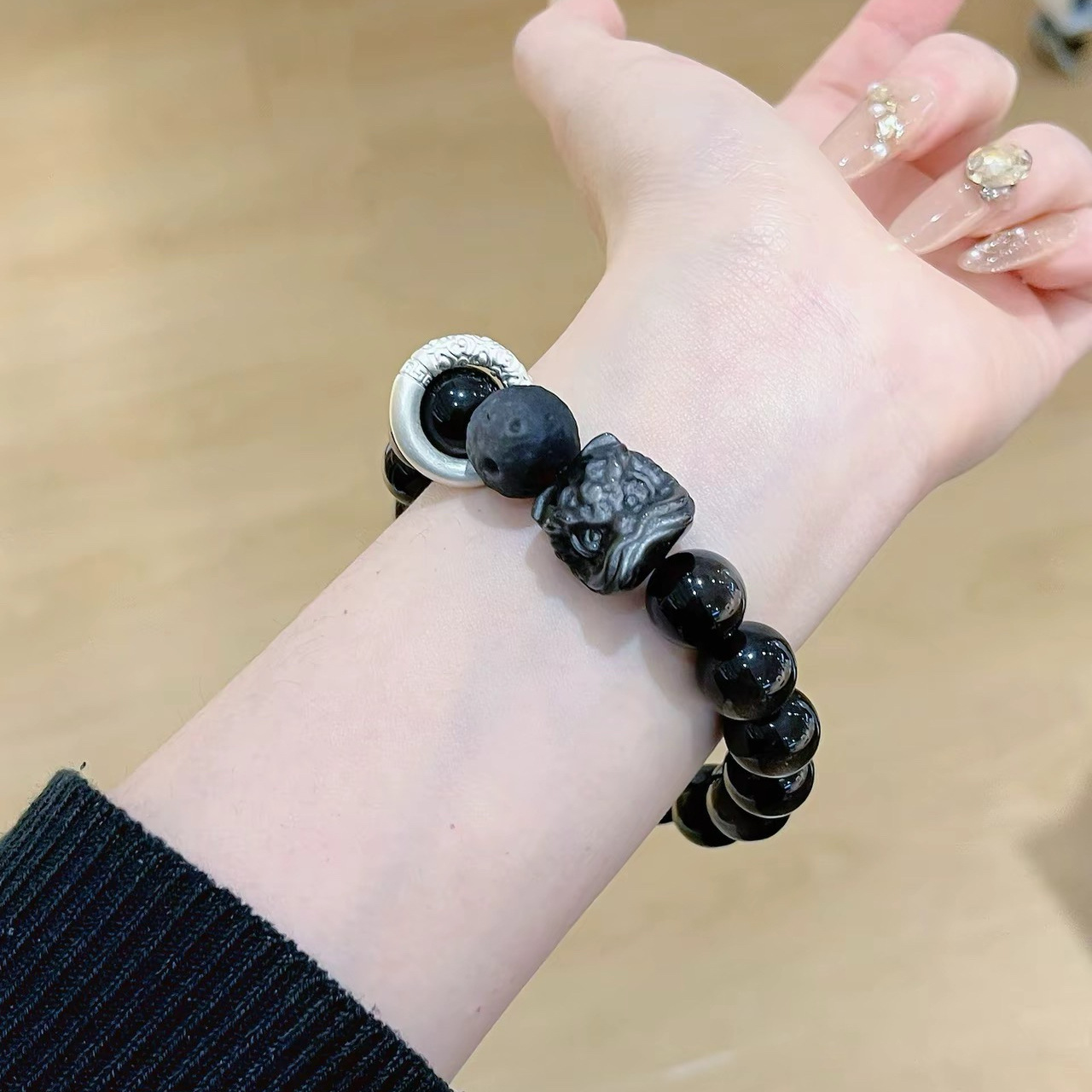 【宝贝名称】天然黑曜石银曜石醒狮手串