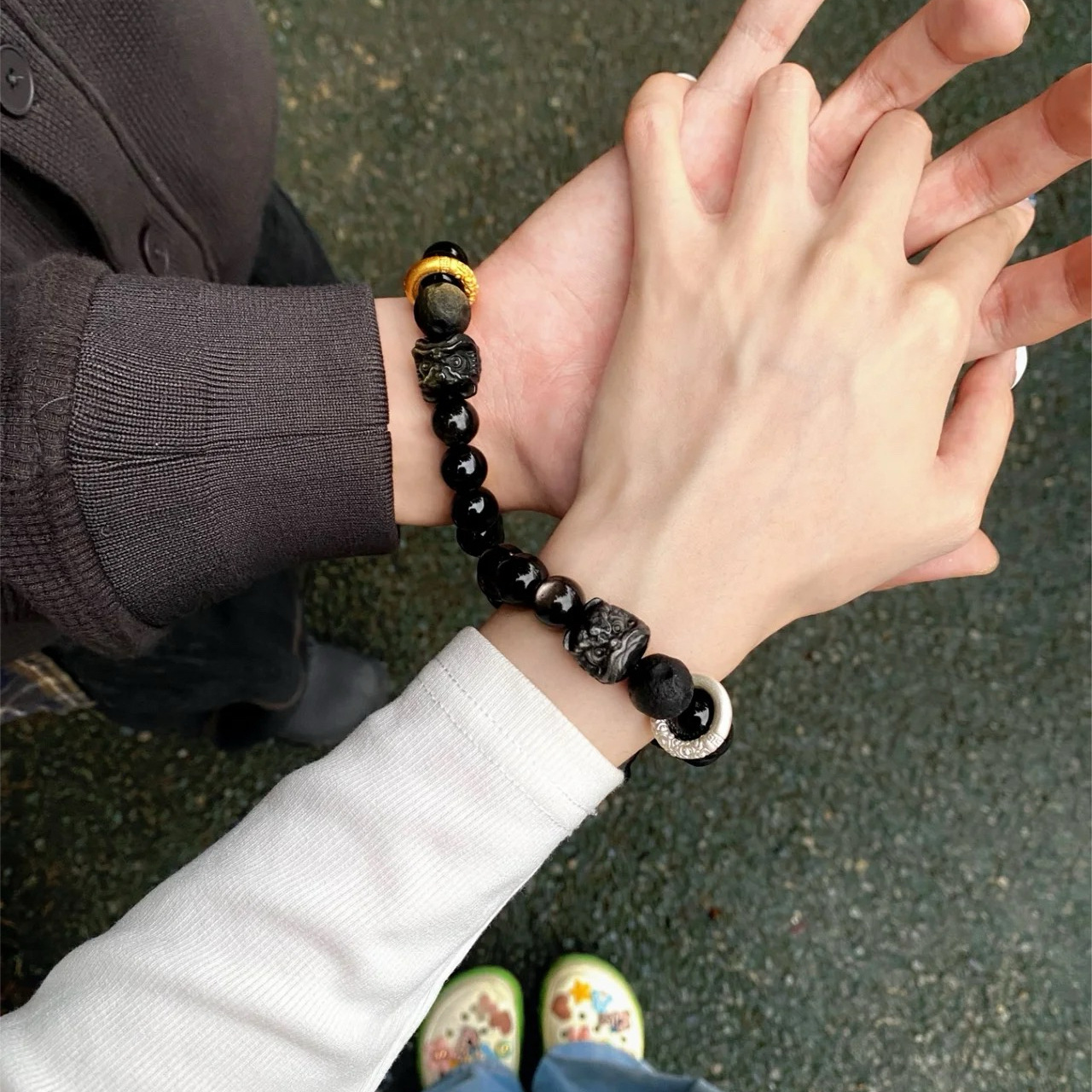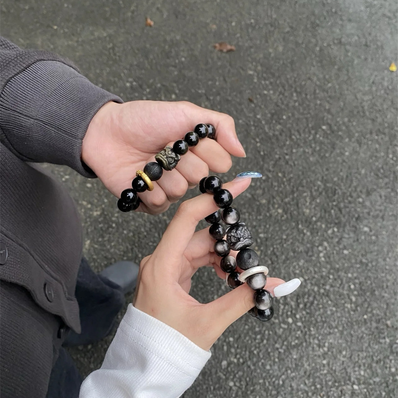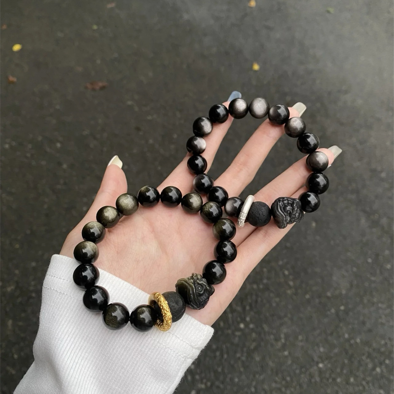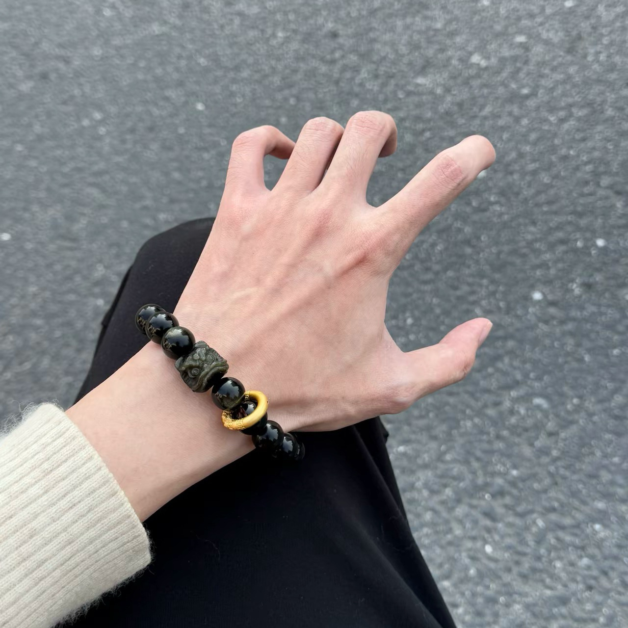 【宝贝名称】天然黑曜石银曜石醒狮手串