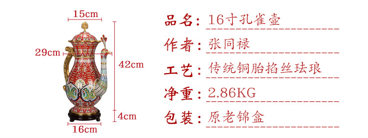 材质: 掐丝珐琅器 产地: 河北 货号: 老货大师孔雀壶16寸 工艺: 传统铜胎掐丝珐琅 是否进口: 否 加工定制: 否 品牌: 京璨景泰蓝 类别: 摆件 器胎: 铜胎 表面工艺: 镏金/鎏金 纹饰图案: 山水花卉 摆挂形式: 摆饰 制作方法: 纯手工 包装: 锦盒 净重: 2.86kg 是否专利货源: 否 尺寸: 16寸 主要下游平台: ebay,亚马逊,wish,速卖通,独立 主要销售地区: 非洲,欧洲,南美,东南亚,北美,东北亚, 有可授权的自有品牌: 是 重量: 6.0 kg/个