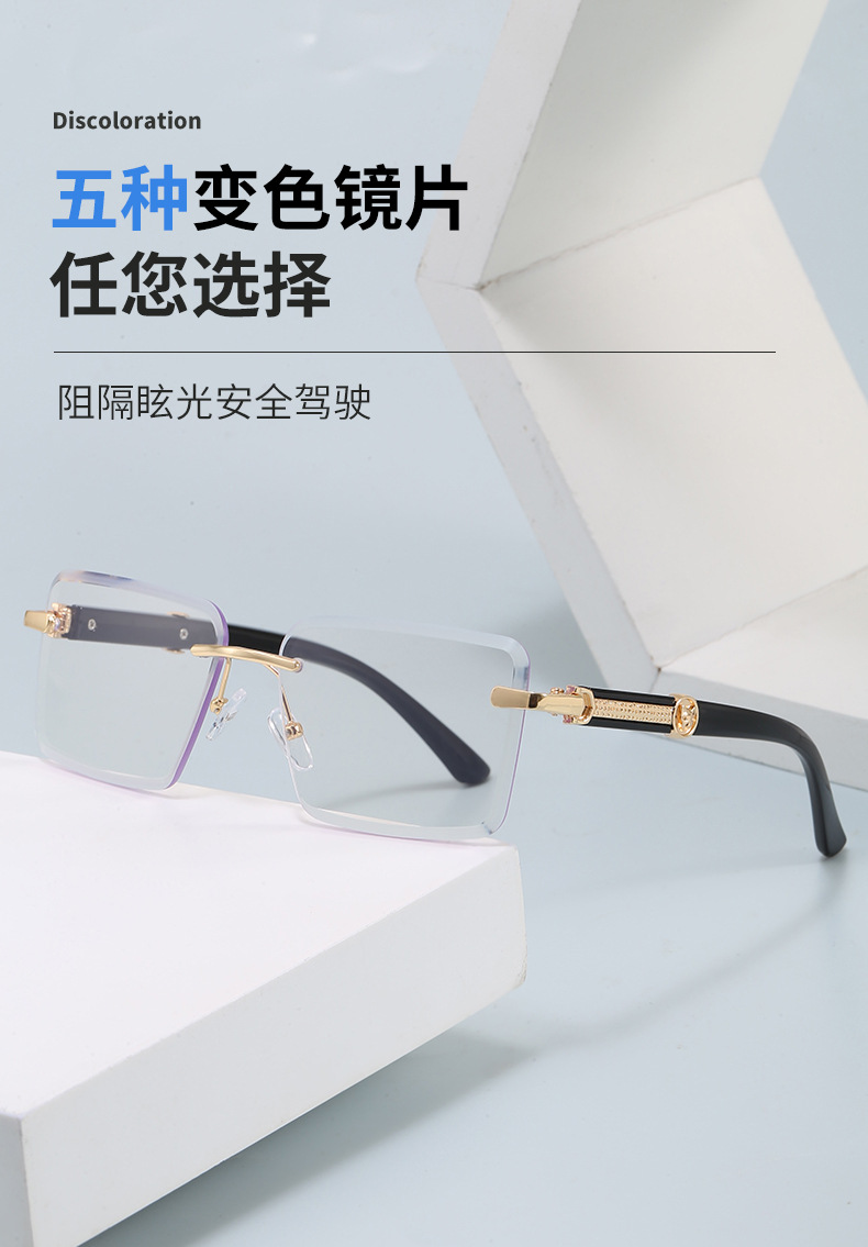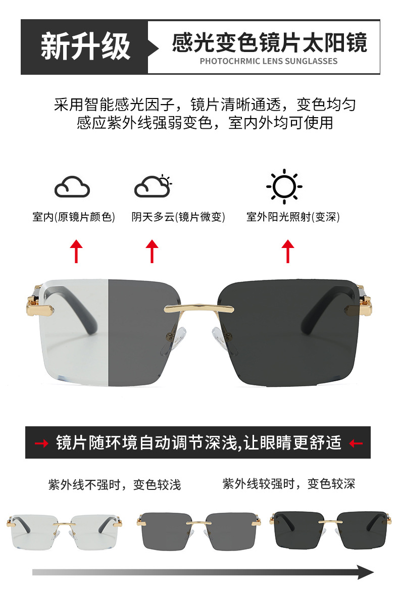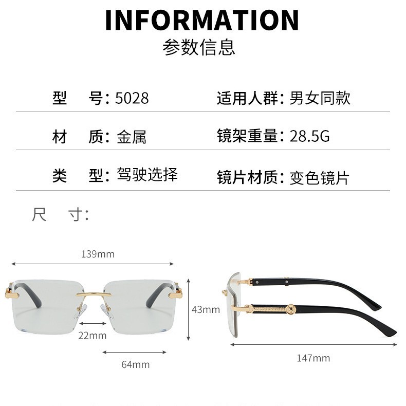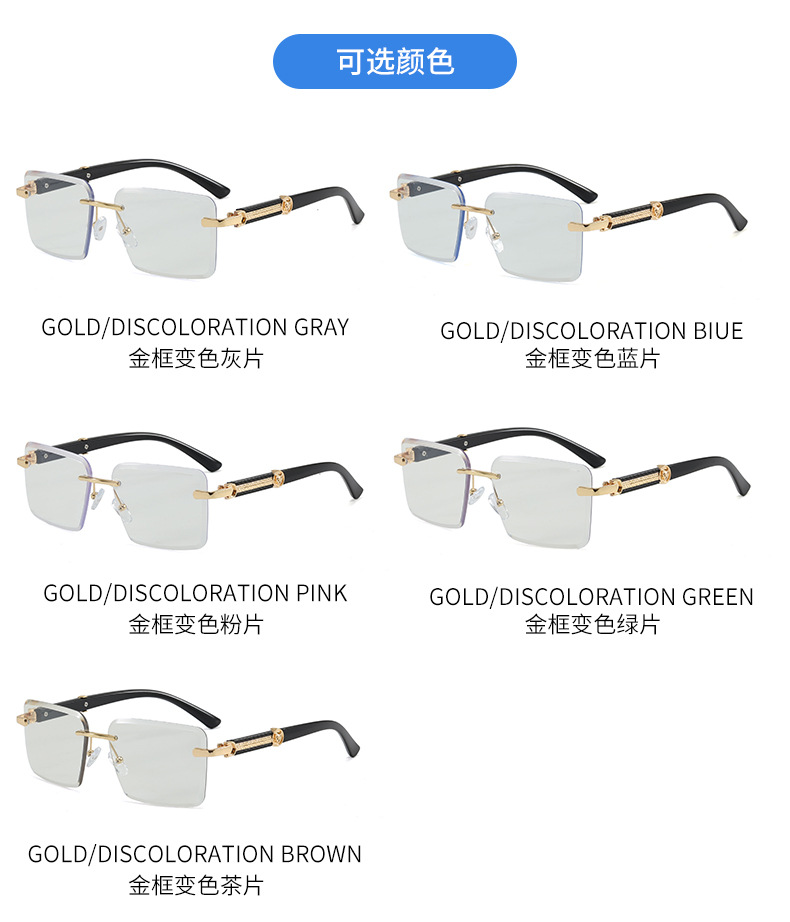 是否偏光: 否 抗UV等级: UV400 镜片材质: PC 品牌: 其他 眼镜款式: 方框 镜框材质: PC 镜架材质: PC 是否支持近视镜: 不支持近视镜 货号: LM-5028 镜片颜色: 灰色 镜架颜色: 黑色 透射比分类: 3类/遮阳镜 眼镜结构: 无框 适用场景: 防晒,垂钓,出游,户外运动,骑行,时尚穿 流行元素: 太阳 上市年份/季节: 2026年春季 是否跨境出口专供货源: 是 颜色: 金框变色灰片,金框变色蓝片,金框变色粉片 产地: 台州 风格: 百搭,时尚OL 重量: 0.03 kg/副