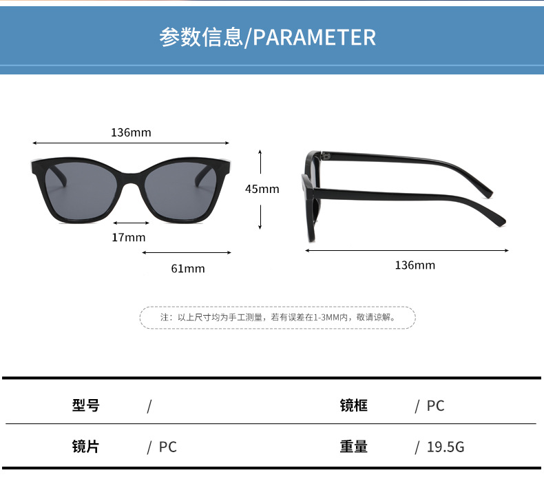 是否偏光: 否 抗UV等级: UV400 镜片材质: AC 品牌: 其他 眼镜款式: 猫眼镜 镜框材质: PC 镜架材质: PC 是否支持近视镜: 支持近视镜 货号: LM-2227 镜片颜色: 灰色 镜架颜色: 黑色 透射比分类: 2类/遮阳镜 眼镜结构: 全框 适用场景: 出游,时尚穿搭,驾驶,舞台演出,派对聚会 流行元素: 太阳 上市年份/季节: 2023年春季 是否跨境出口专供货源: 是 颜色: 黑框灰片,绿框灰片,紫框双紫片,茶框双茶 产地: 台州 风格: 百搭 重量: 0.03 kg/副