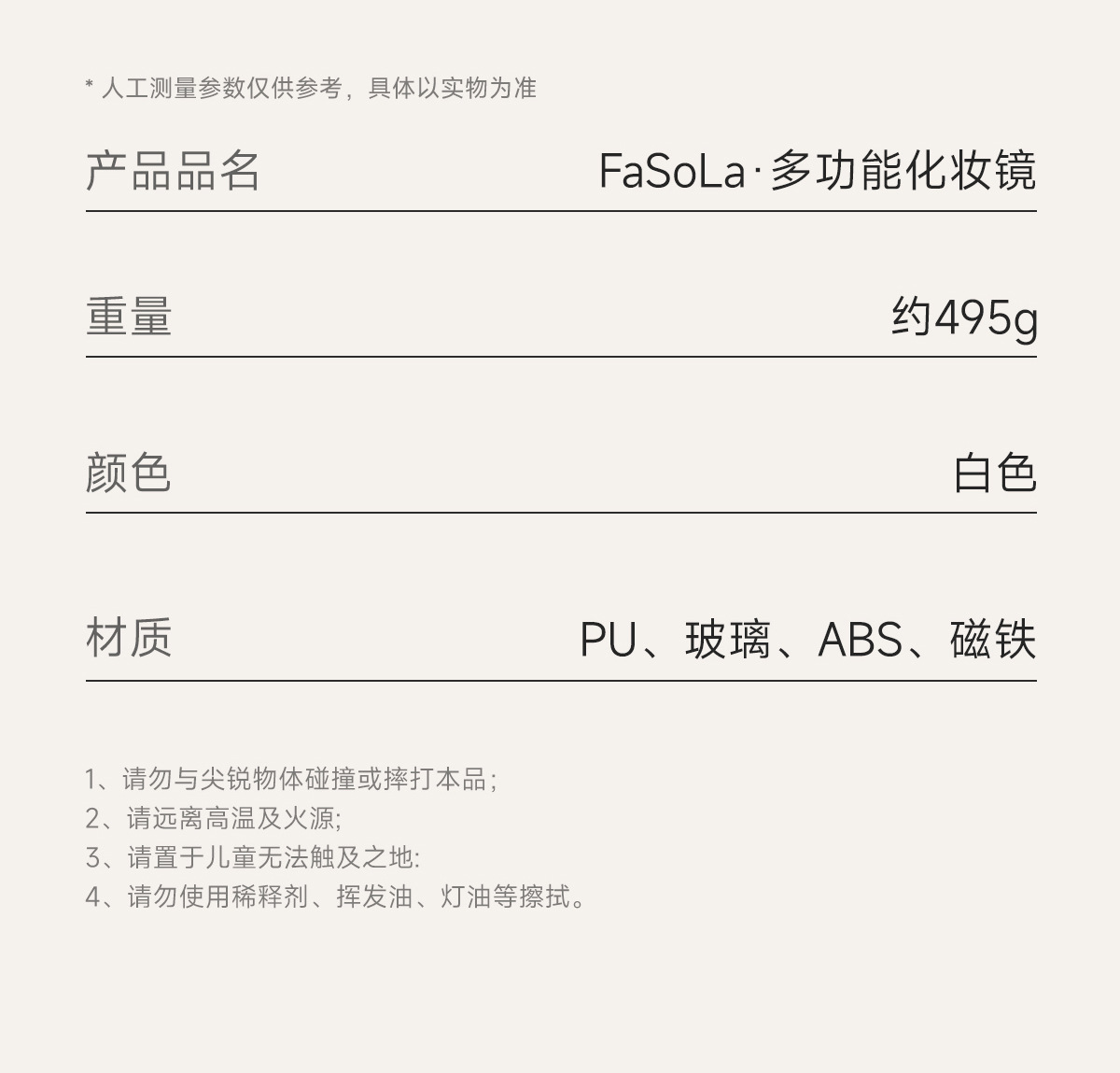 镜框材料: ABS 镜片材料: 玻璃 产品类别: 折叠镜 品牌: FaSoLa 规格: 套装 形象: 其他 是否进口: 否 产地: 中国 货号: PS-907 加印LOGO: 不可以 加工定制: 否 专利: 否 颜色: 白色 有可授权的自有品牌: 是 是否跨境出口专供货源: 是 使用场所: 客厅,卧室 是否电动: 否 是否属于礼品: 否 重量: 0.3 kg/件